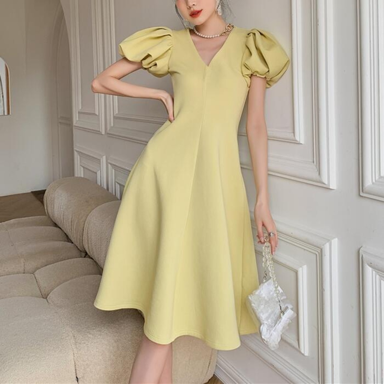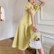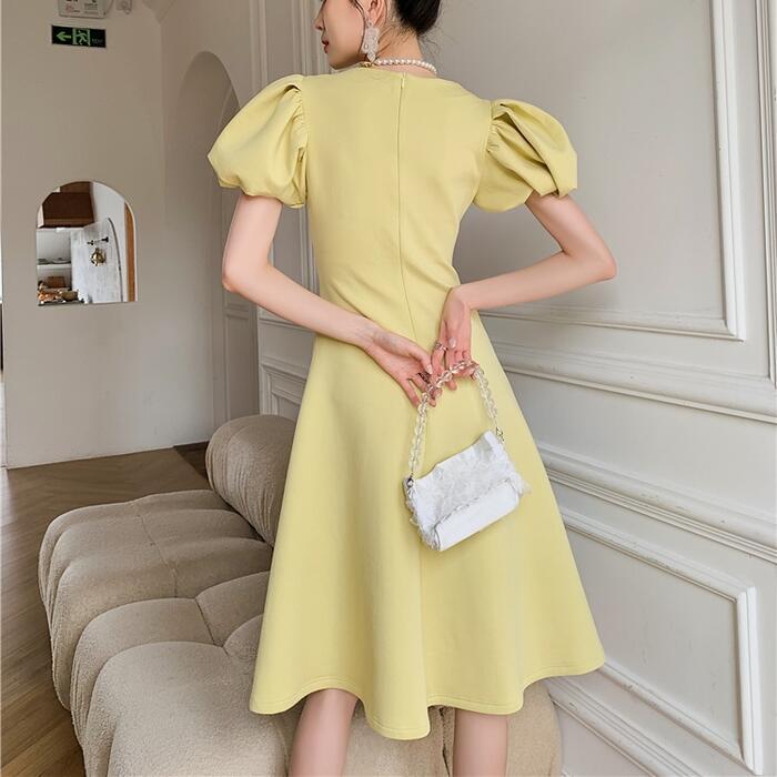 ぽわんとした丸いパフスリーブがポイントのワンピース。