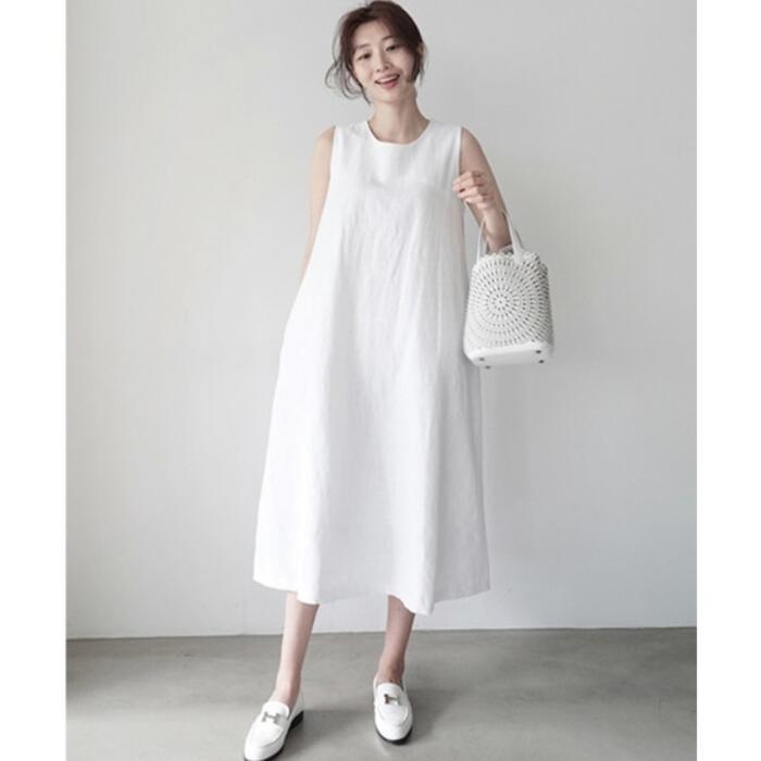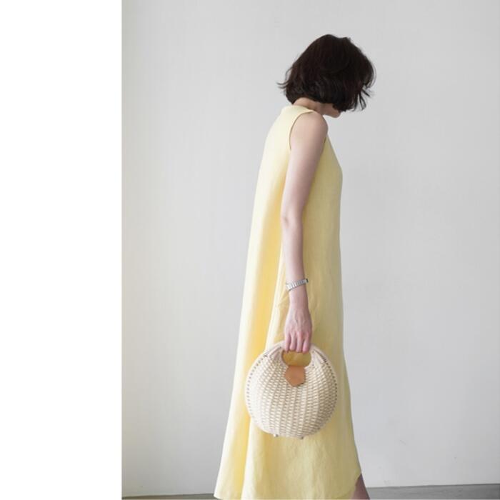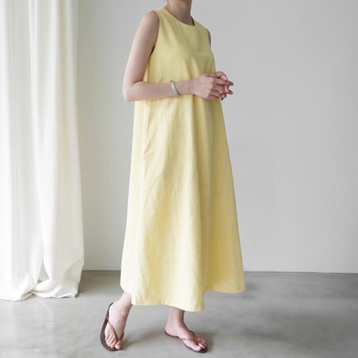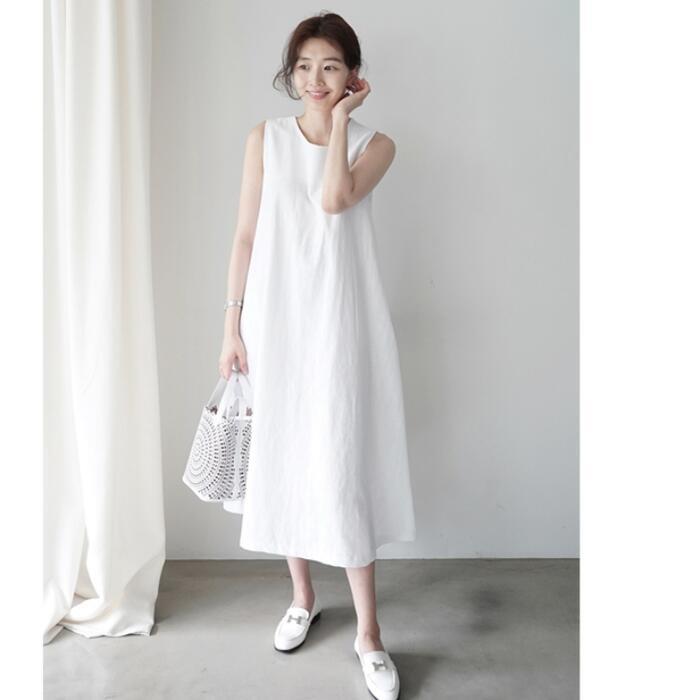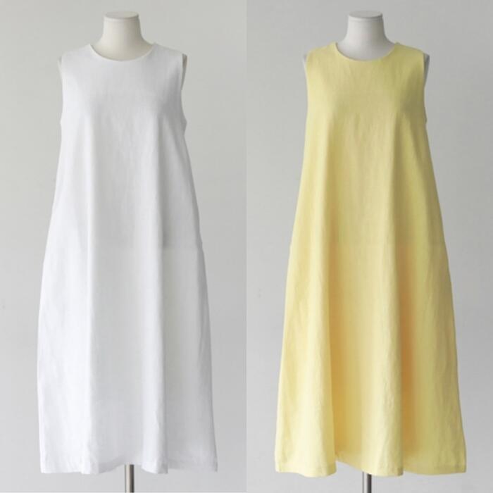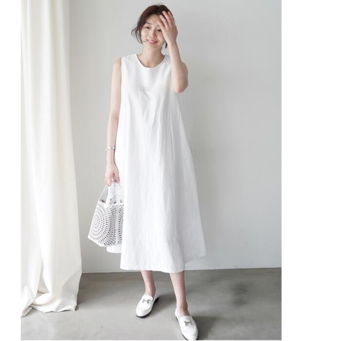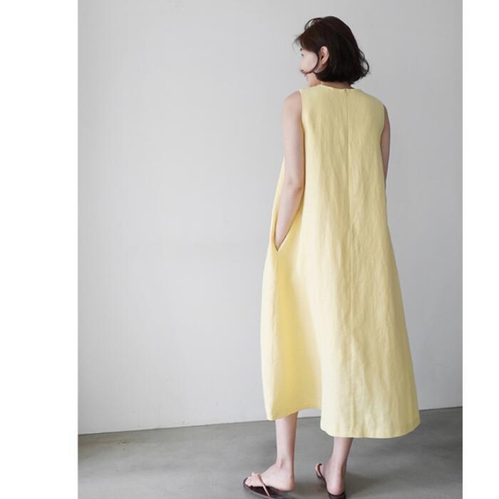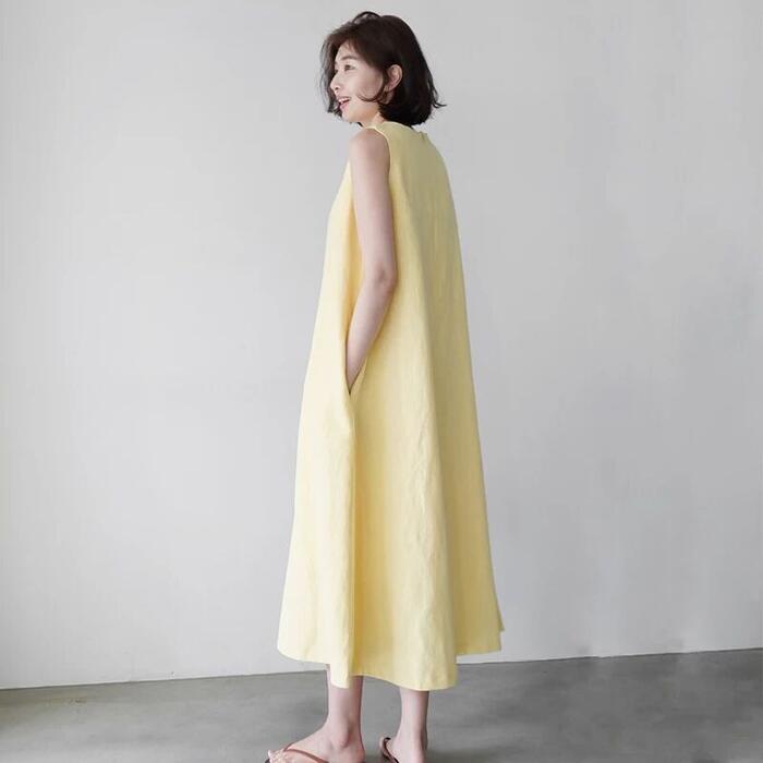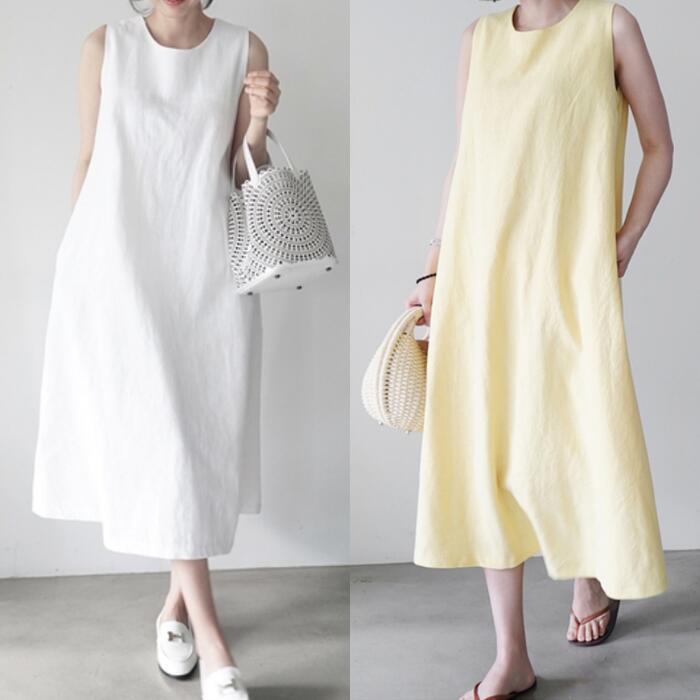 全2色 リネン リネン混 ワンピース きれいめ カジュアル ノースリーブ ミモレ丈 綿麻 おしゃれ レディース 大人 可愛い ワンピ ドレス ナチュラル ゆったり リラックス 体型カバー ホワイト 白 イエロー 春 秋 夏 20代 30代 40代 50代