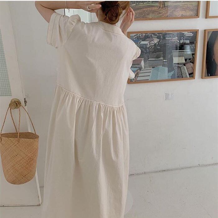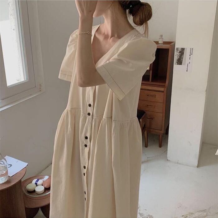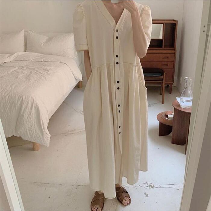 ワンピース ロングワンピ 袖あり きれいめ カジュアル 半袖 ロング丈 おしゃれ レディース 大人 可愛い ワンピ ドレス フェミニン ナチュラル ゆったり 体系カバー リラックス Vネック ベージュ 春 秋 夏 20代 30代 40代 50代