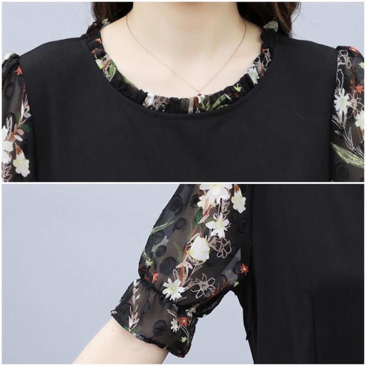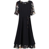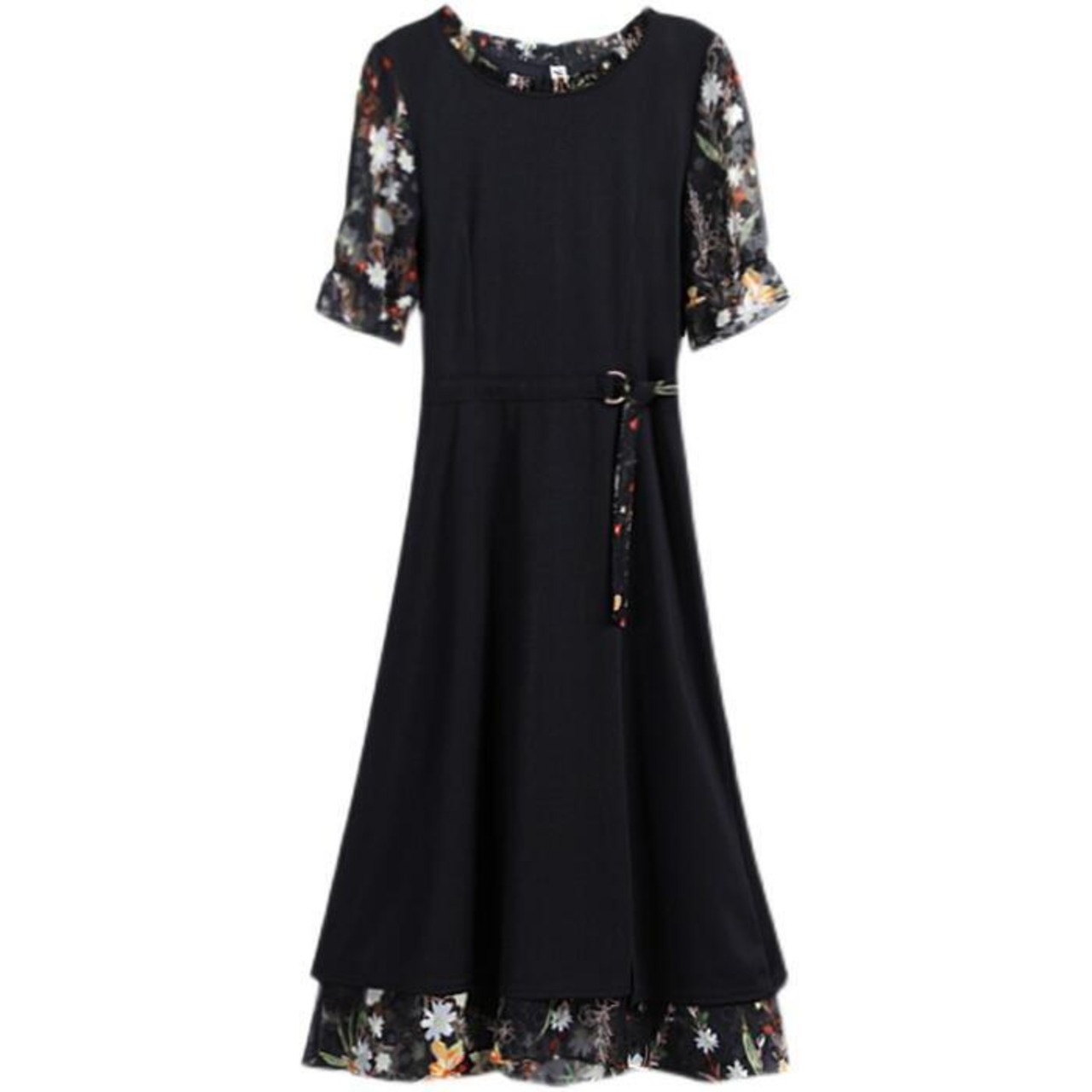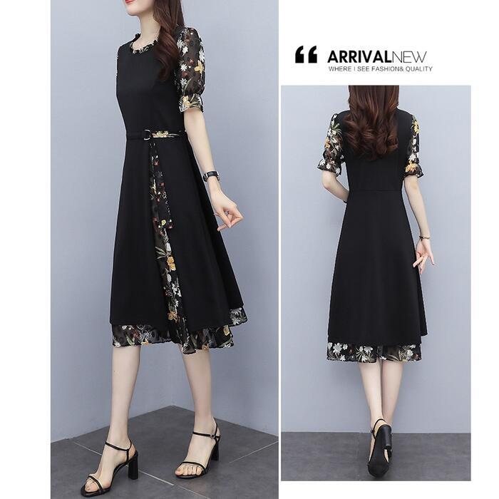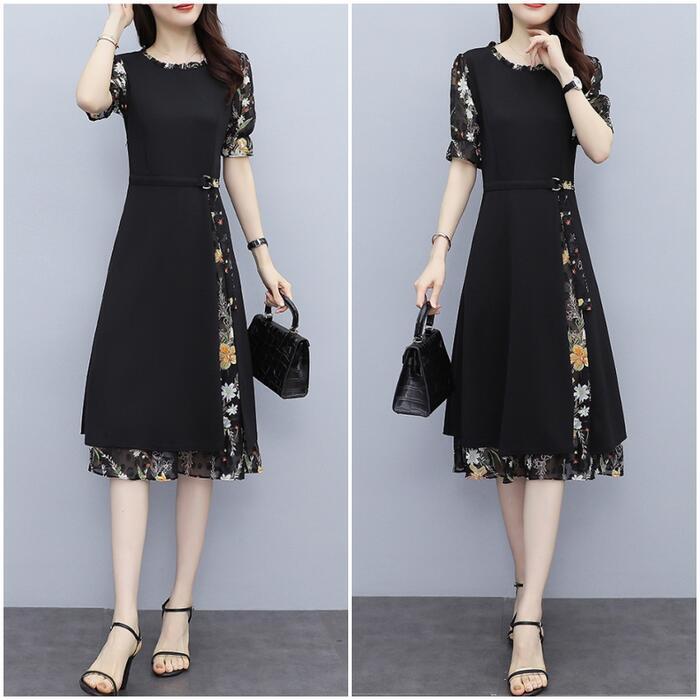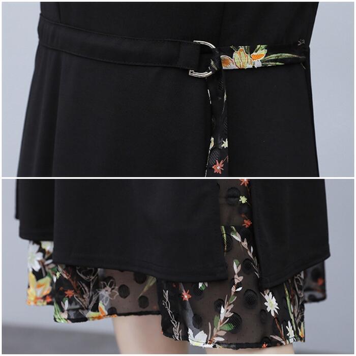 大きいサイズワンピース ロングワンピ 袖あり レイヤード 花柄 エレガント きれいめ カジュアル 半袖 ミモレ丈 シフォン おしゃれ レディース 大人 可愛い ワンピ ドレス フェミニン ひざ丈 ブラック 黒 春 秋 夏 20代 30代 40代 50代