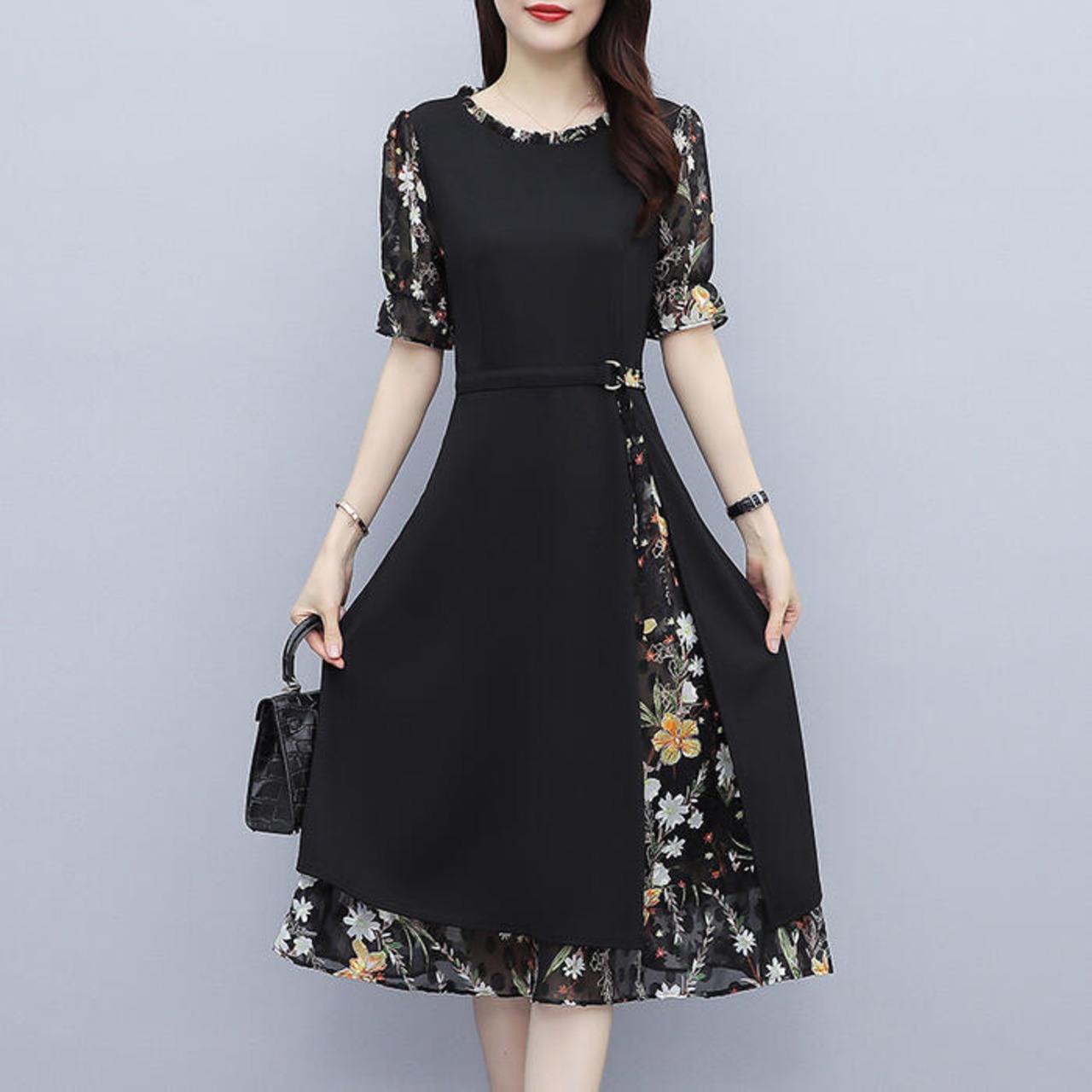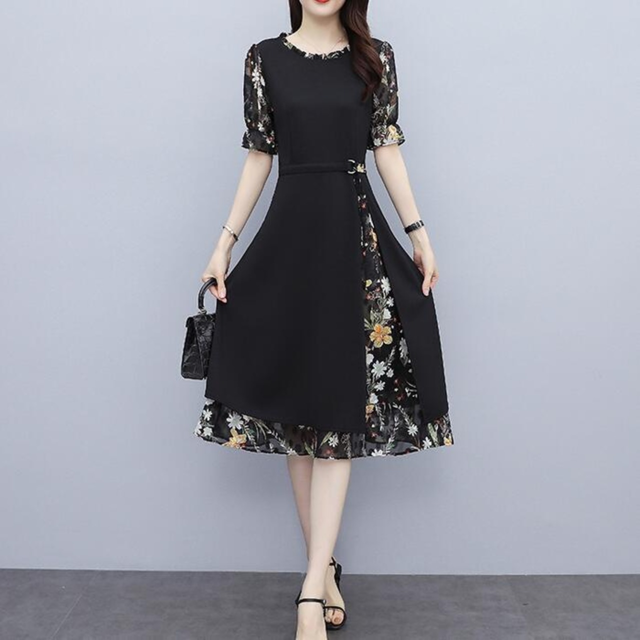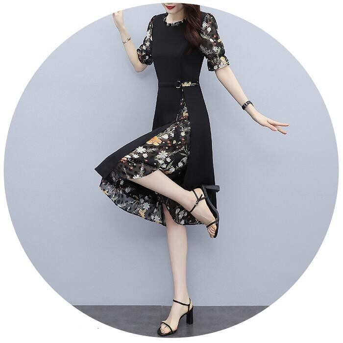 大きいサイズワンピース ロングワンピ 袖あり レイヤード 花柄 エレガント きれいめ カジュアル 半袖 ミモレ丈 シフォン おしゃれ レディース 大人 可愛い ワンピ ドレス フェミニン ひざ丈 ブラック 黒 春 秋 夏 20代 30代 40代 50代