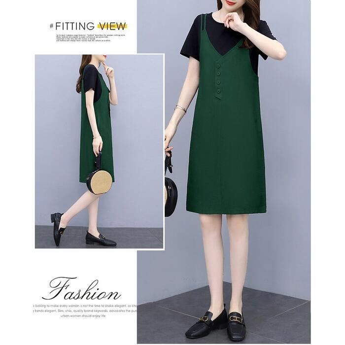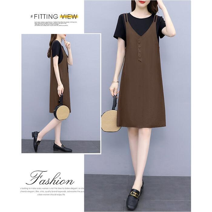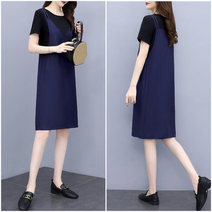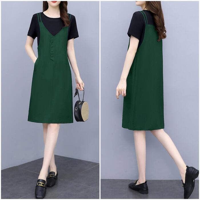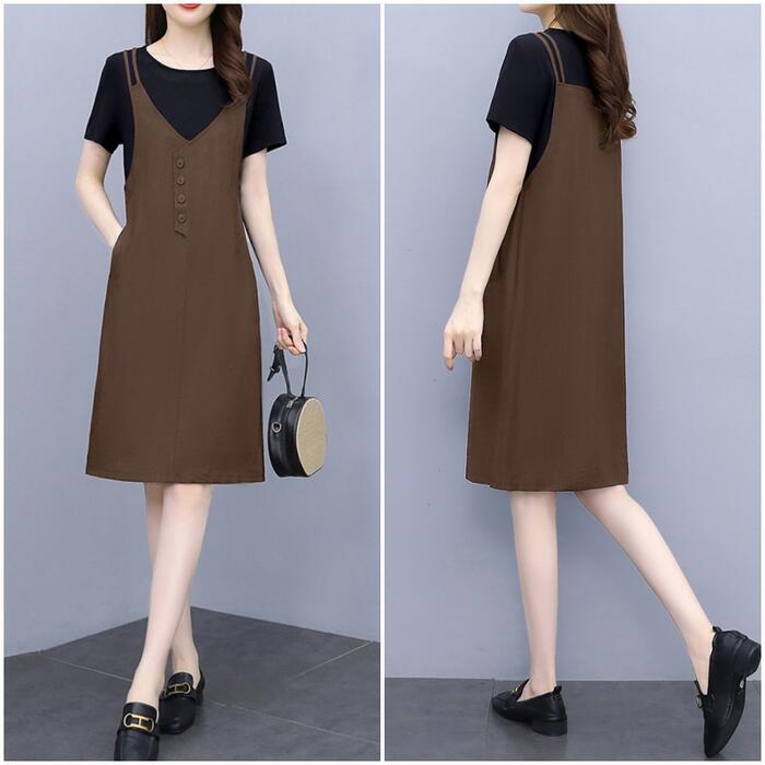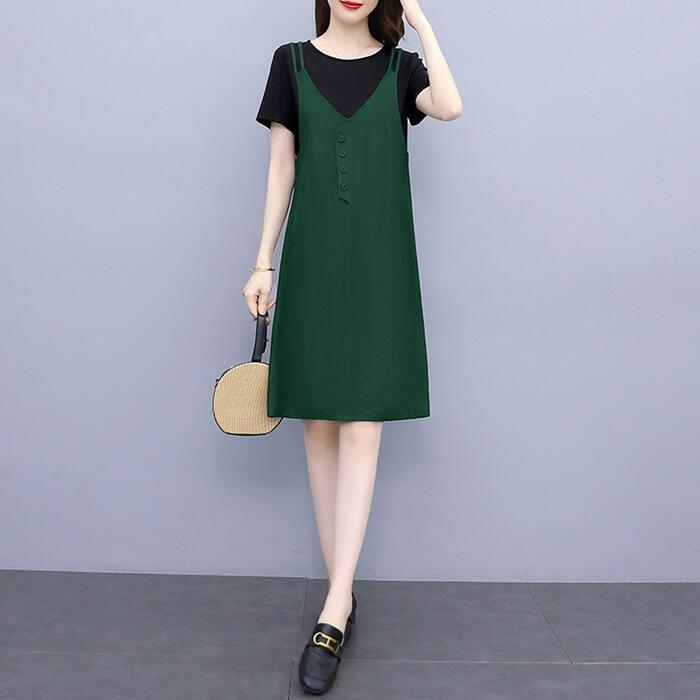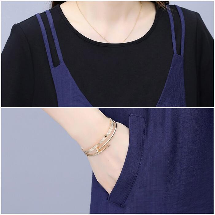 全3色 大きいサイズワンピース ロングワンピ 袖あり レイヤード風 エレガント きれいめ カジュアル 半袖 ひざ丈 おしゃれ レディース 大人 可愛い ワンピ ドレス フェミニン ネイビー グリーン 緑 ブラウン ブラック 黒 春 秋 夏 20代 30代 40代 50代