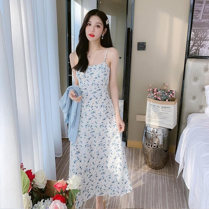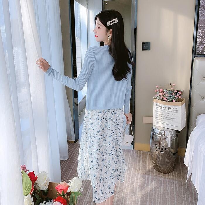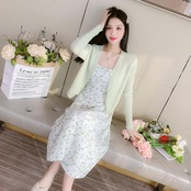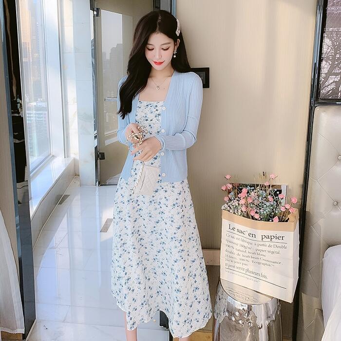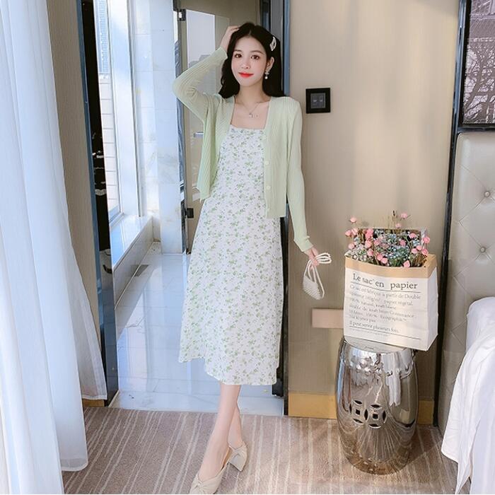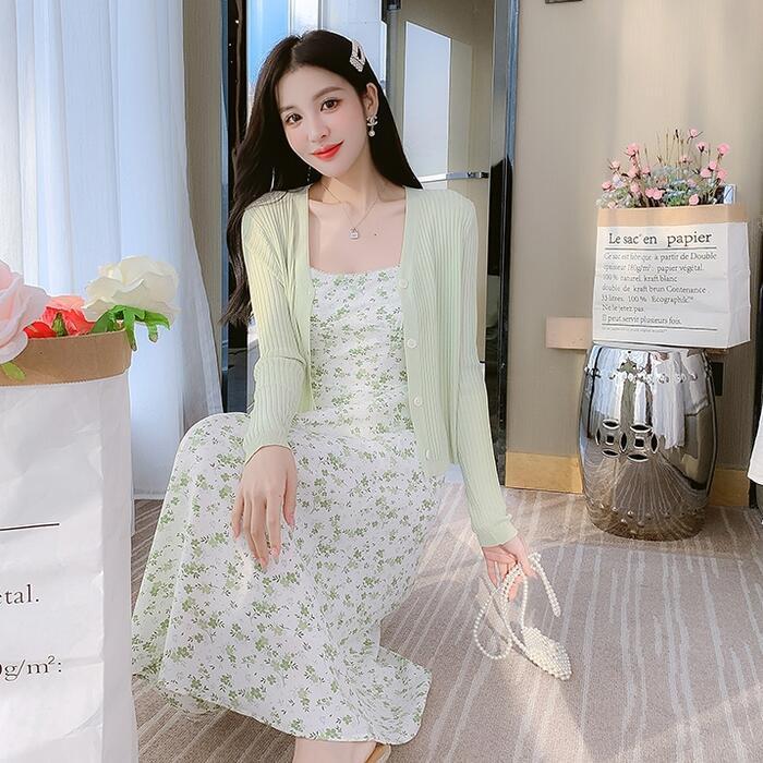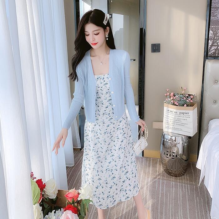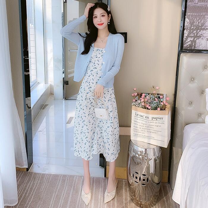 小花柄のフェミニンなキャミワンピとカーディガンのセット。