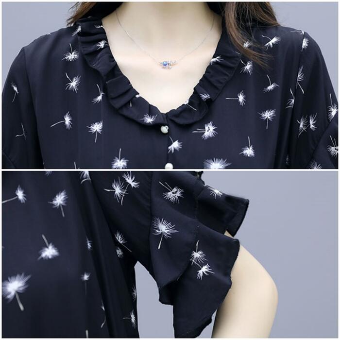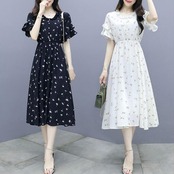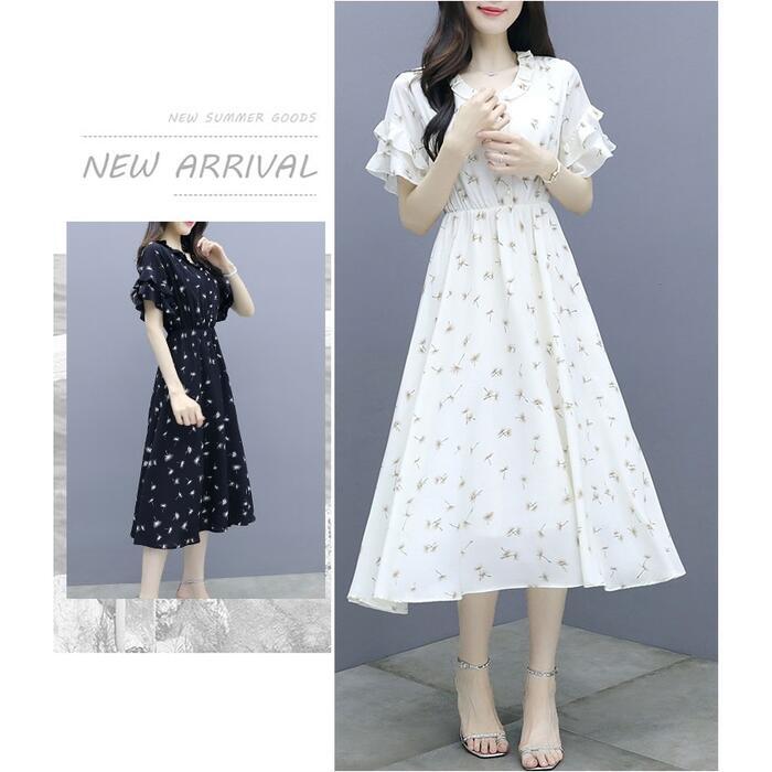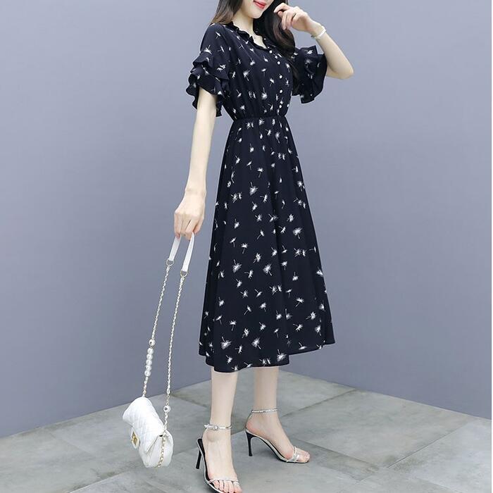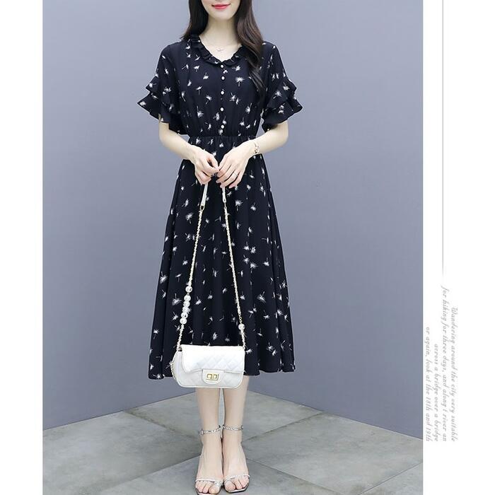 全2色 大きいサイズワンピース ロングワンピ 袖あり 花柄 フリル エレガント きれいめ カジュアル 半袖 ミモレ丈 おしゃれ レディース 大人 可愛い ワンピ ドレス フェミニン ハイウエスト Aライン シンプル ベージュ ブラック 黒 春 秋 夏 20代 30代 40代 50代