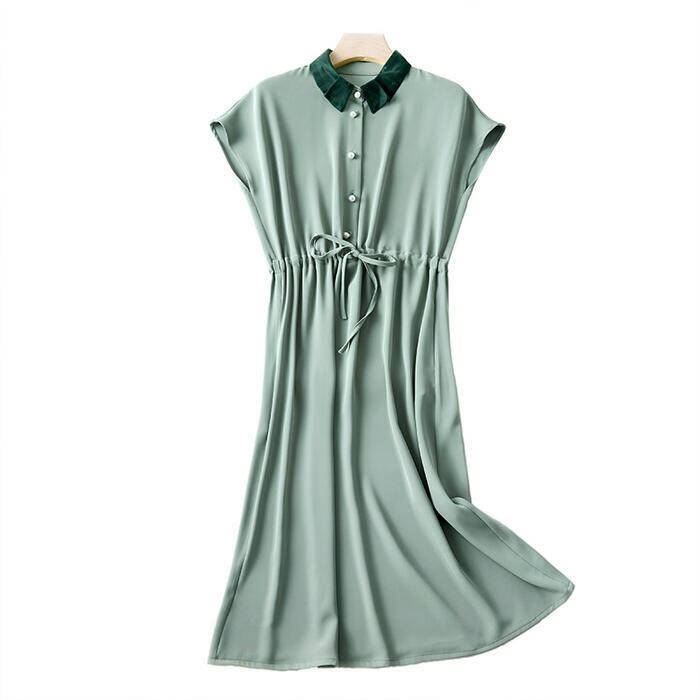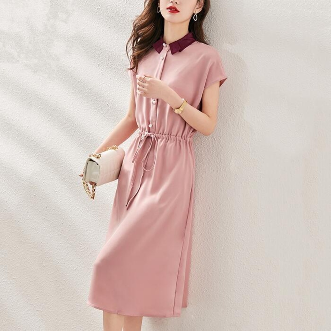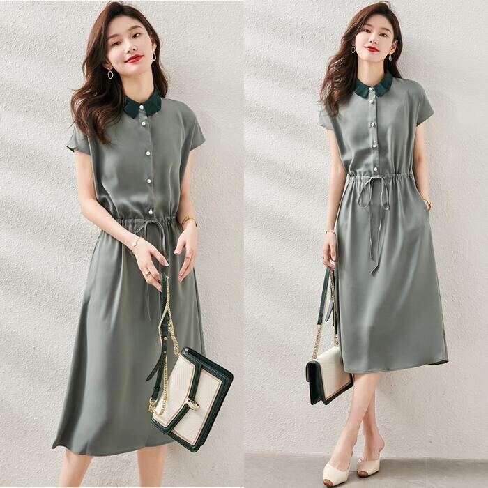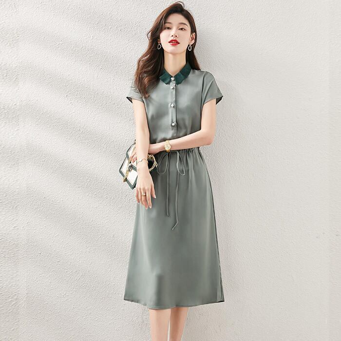 全3色 大きいサイズ ワンピース ロングワンピ 袖あり 配色 エレガント きれいめ カジュアル 半袖 ミモレ丈 おしゃれ レディース 大人 可愛い ワンピ ドレス フェミニン ハイウエスト ドロスト シンプル グリーン 緑 ピンク ブルー 青 春 秋 夏 20代 30代 40代 50代