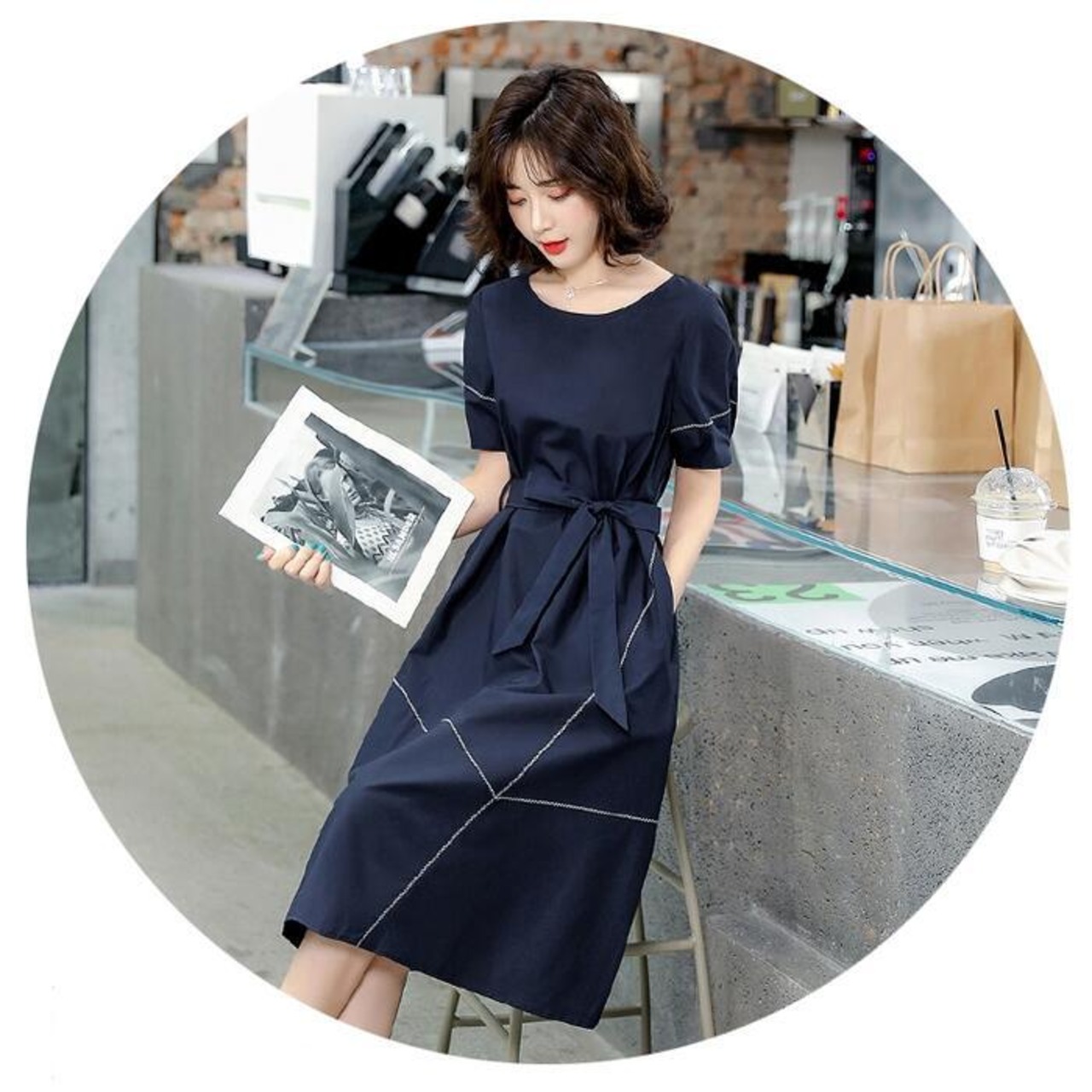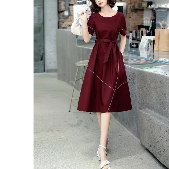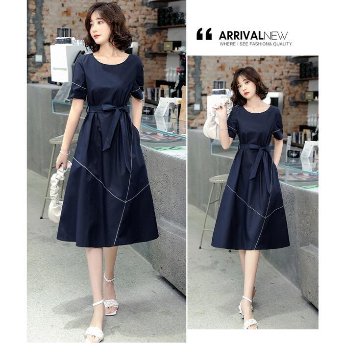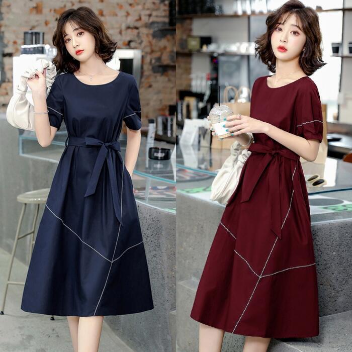 全2色 大きいサイズワンピース ロングワンピ 袖あり きれいめ カジュアル 半袖 ミモレ丈 ステッチ おしゃれ レディース 大人 可愛い ワンピ ドレス フェミニン ウエストリボン Aライン オフィス ネイビー レッド 赤 春 秋 夏 20代 30代 40代 50代
