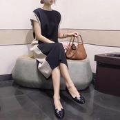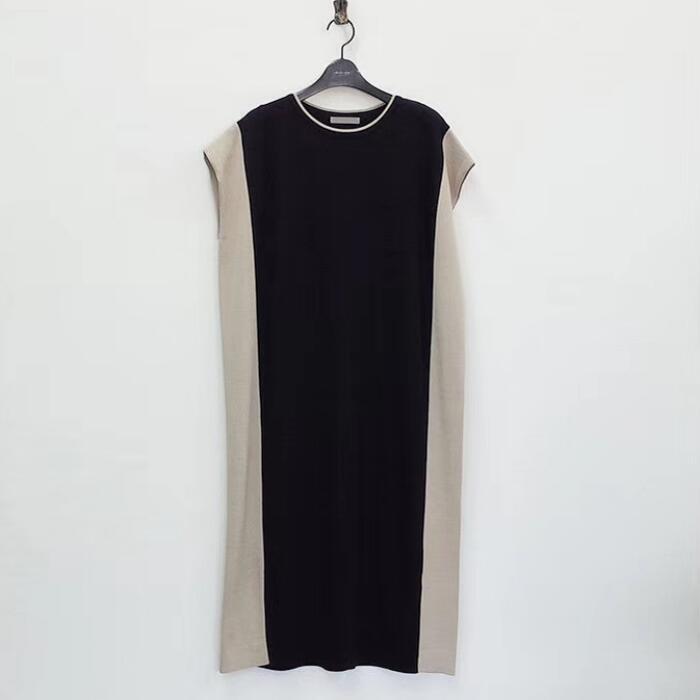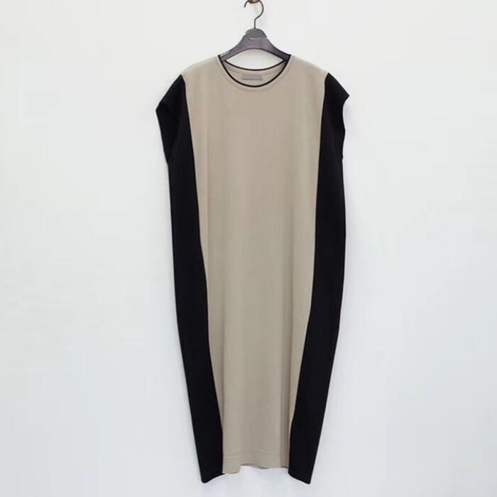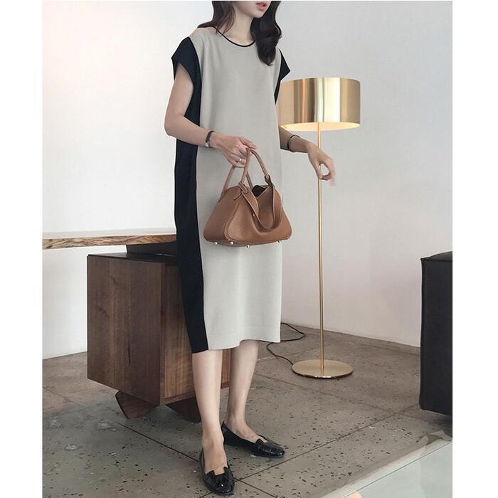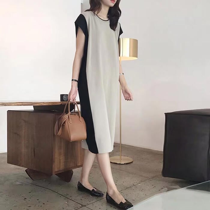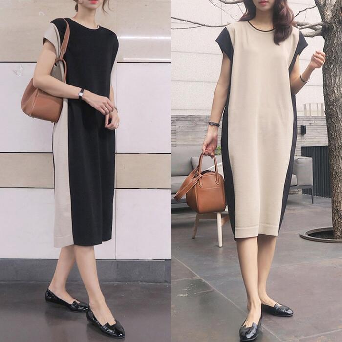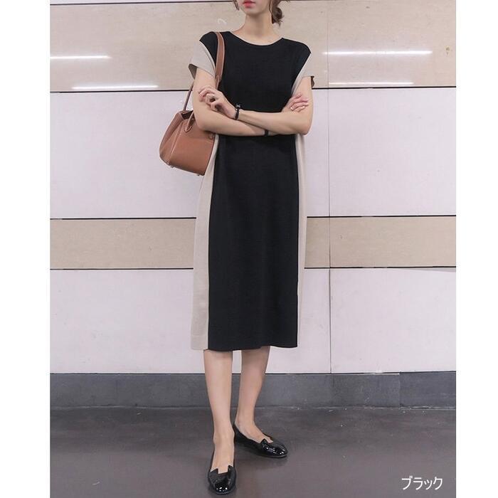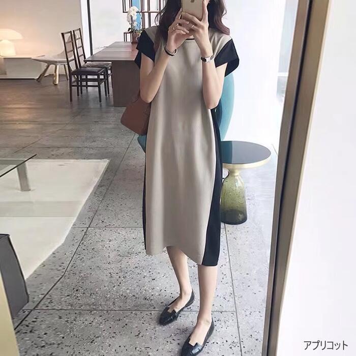 全2色 大きいサイズワンピース ロングワンピ 袖あり バイカラー 切り替え きれいめ カジュアル 半袖 ミモレ丈 おしゃれ レディース 大人 可愛い ワンピ ドレス フェミニン 配色 ゆったり 体型カバー ベージュ ブラック 黒 春 秋 夏 20代 30代 40代 50代