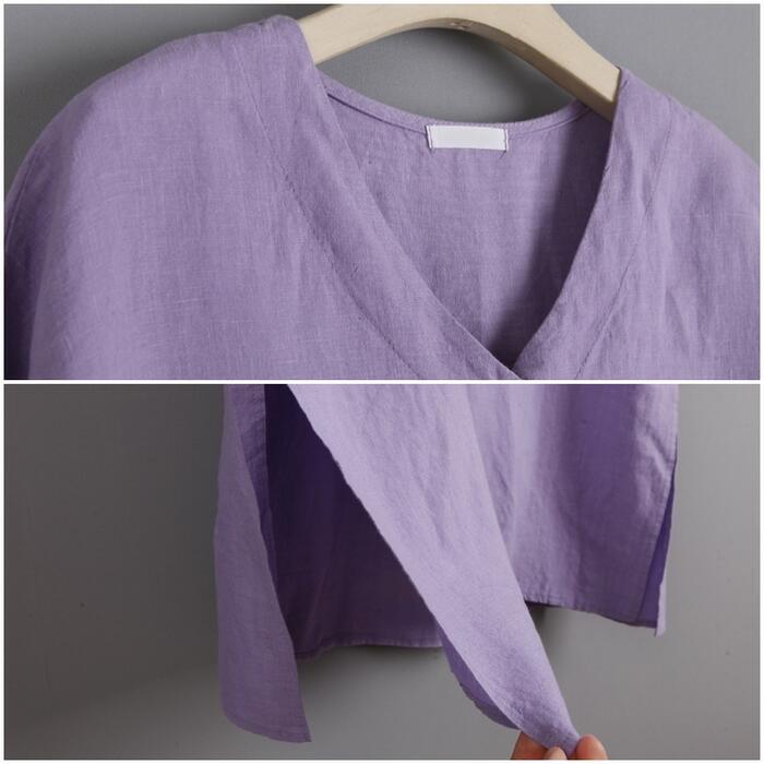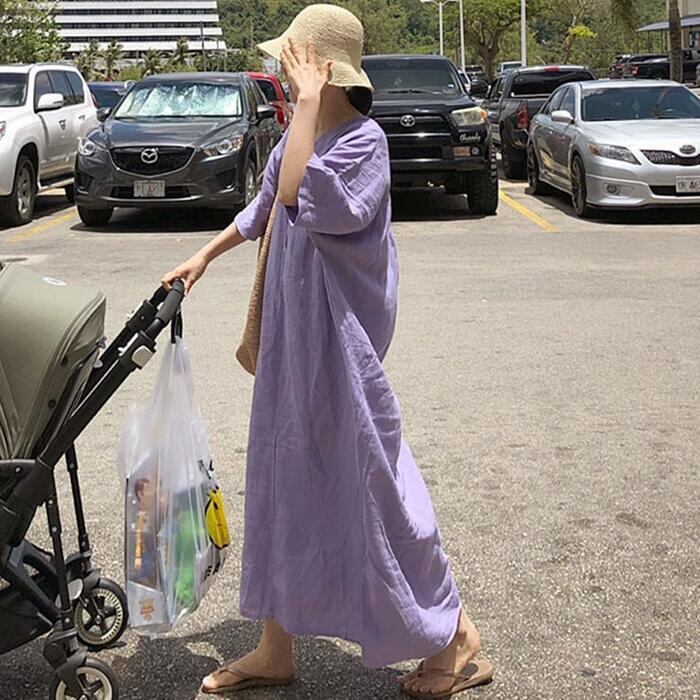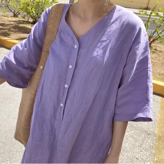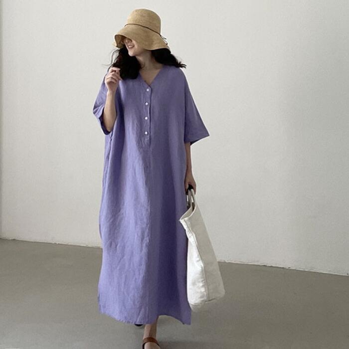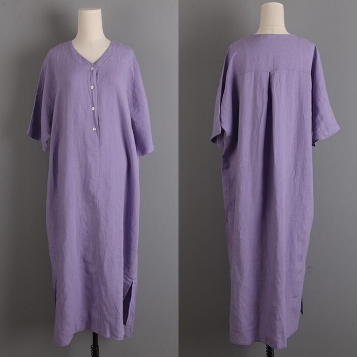 大きいサイズリネン リネン混 ワンピース きれいめ カジュアル 袖あり ミモレ丈 綿麻 おしゃれ レディース 大人 可愛い 半袖 フェミニン ワンピ ドレス ナチュラル リラックス ゆったり 体型カバー パープル 春 秋 夏 20代 30代 40代 50代