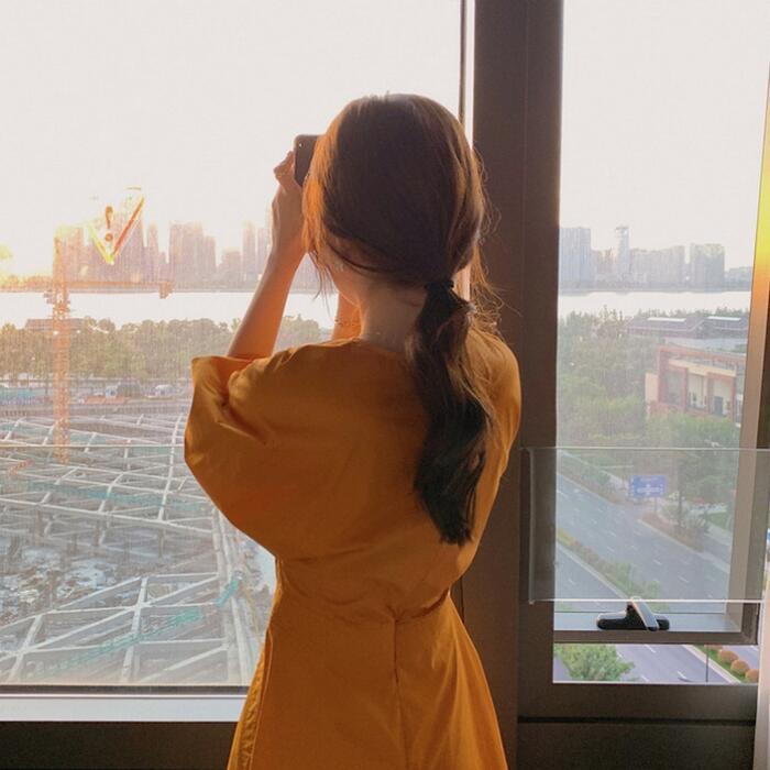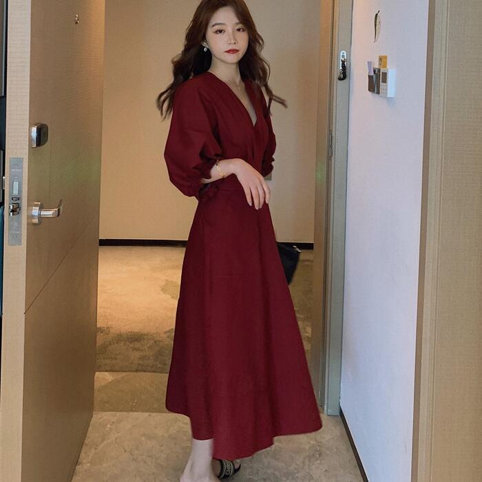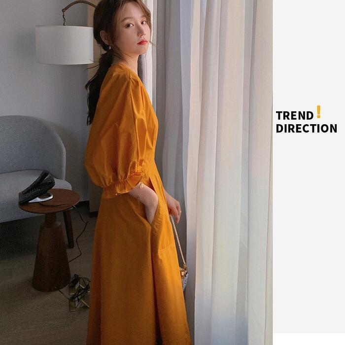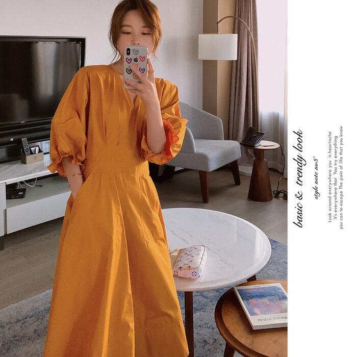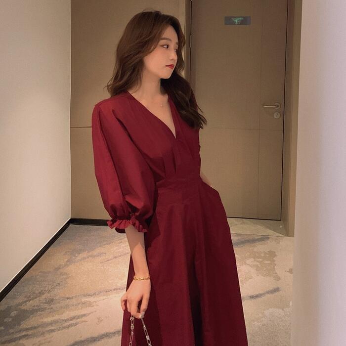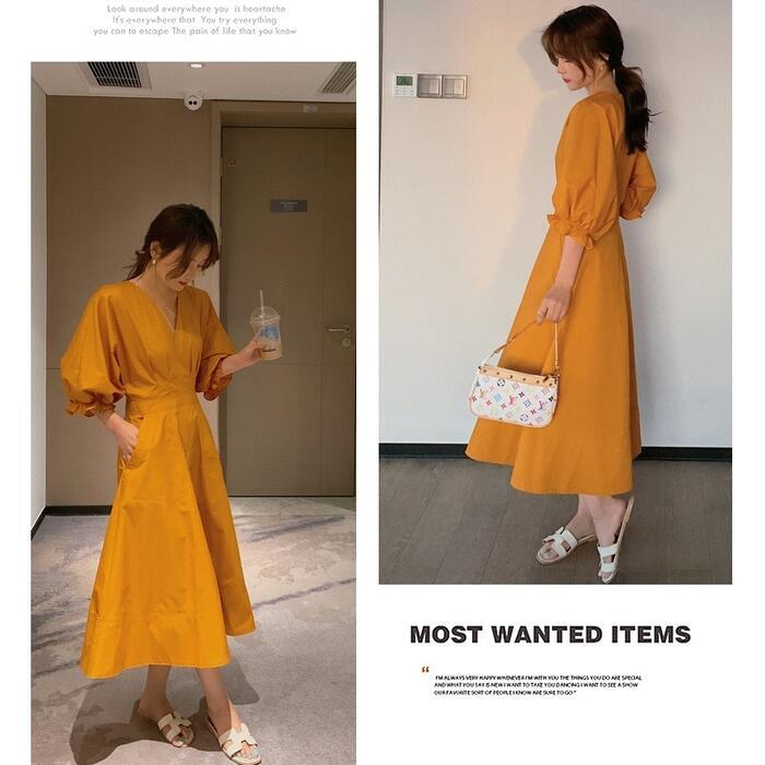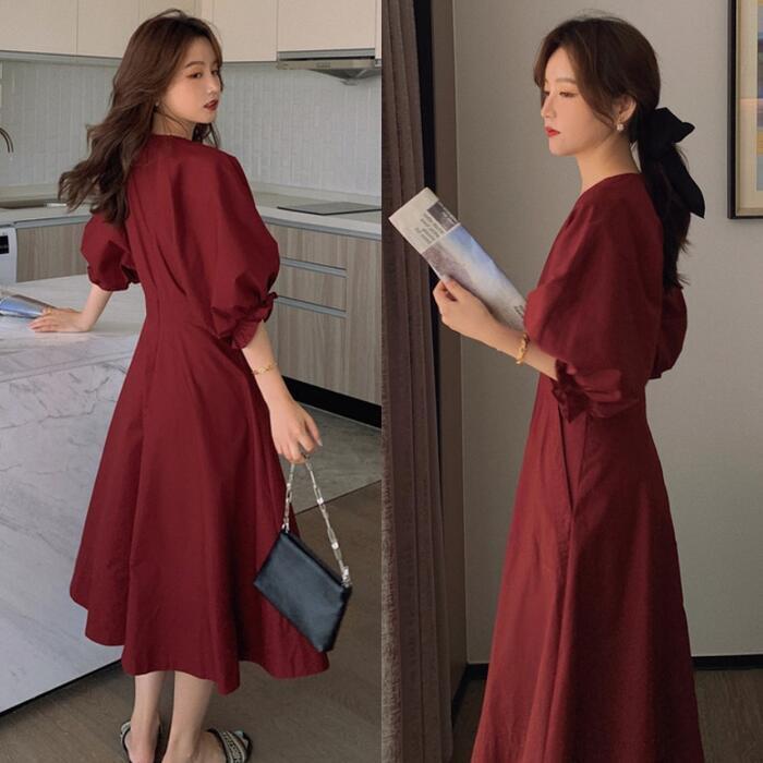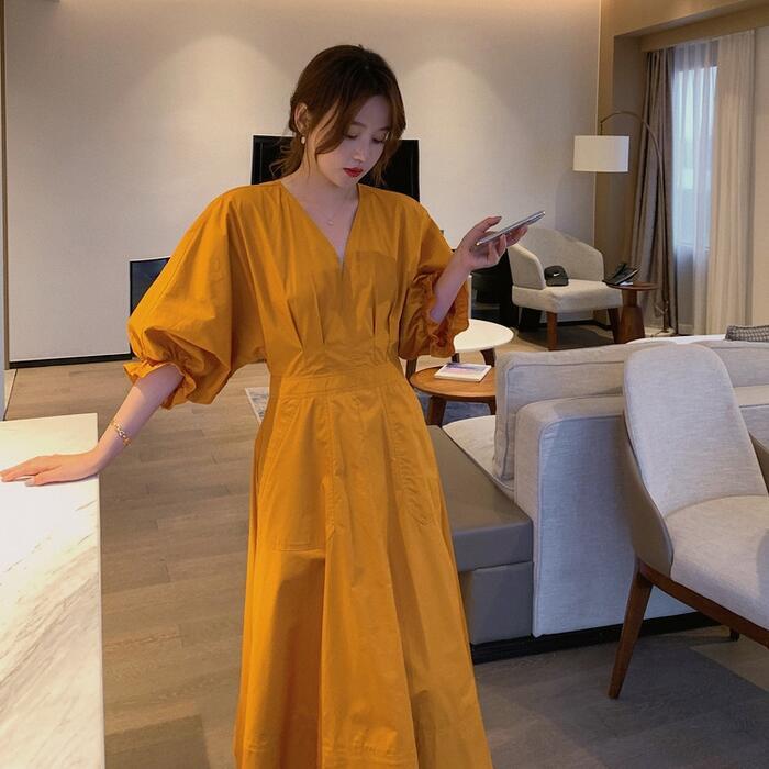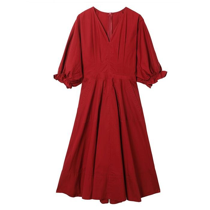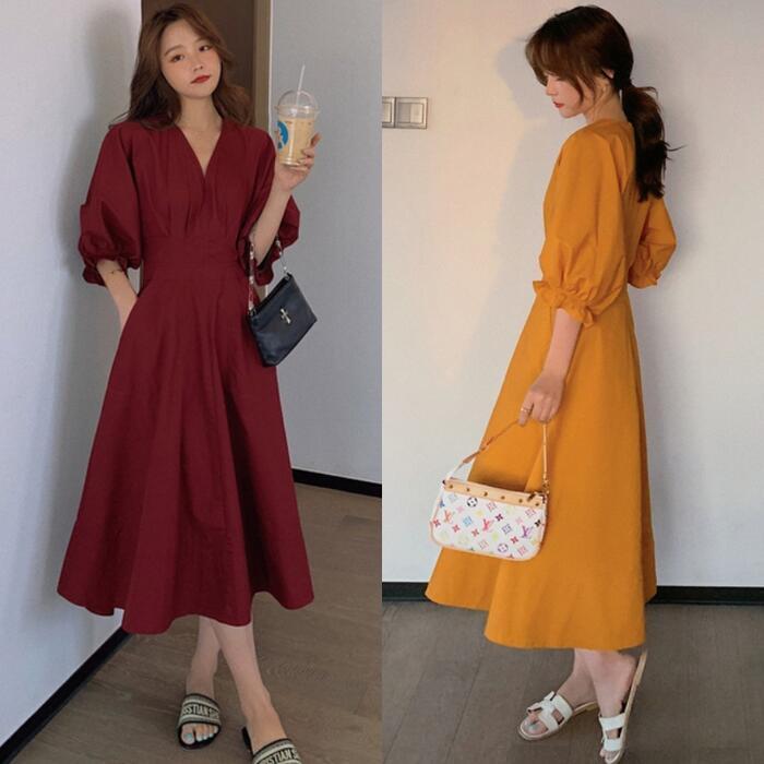 全2色 大きいサイズパフスリーブ ワンピース ロングワンピ 袖あり Vネック エレガント レディース 五分袖 きれいめ カジュアル ミモレ丈 おしゃれ 大人 可愛い ワンピ ドレス Aライン ハイウエスト シンプル レッド 赤 イエロー 春 秋 夏 20代 30代 40代 50代