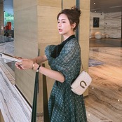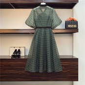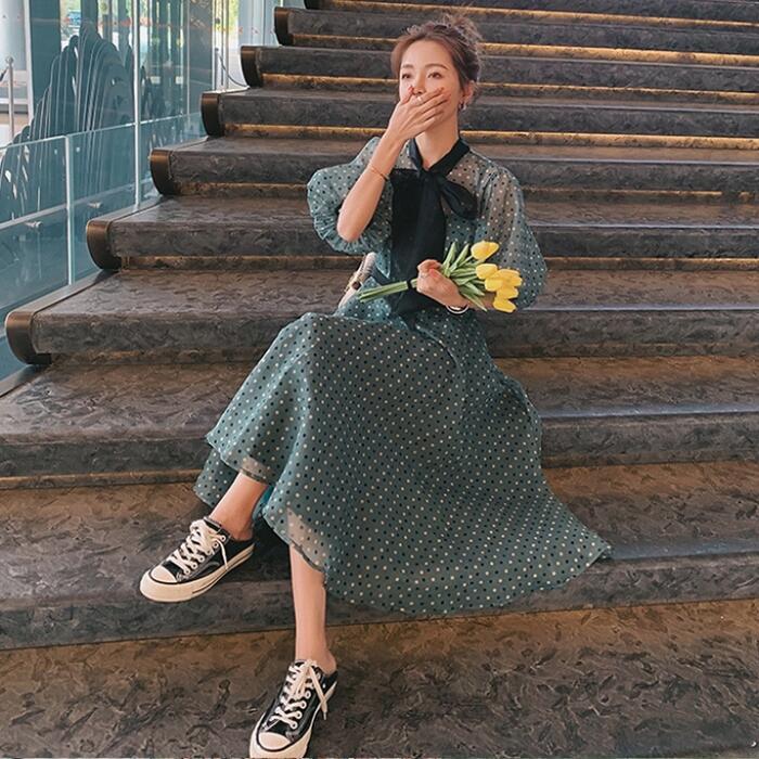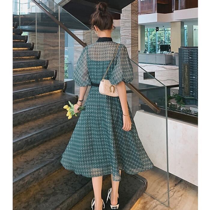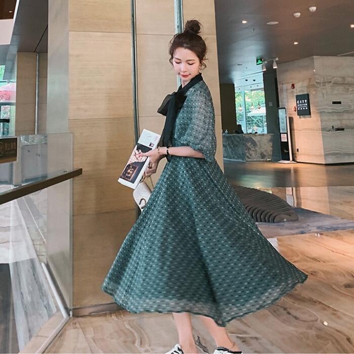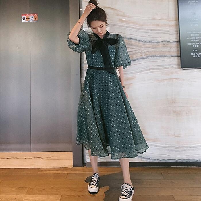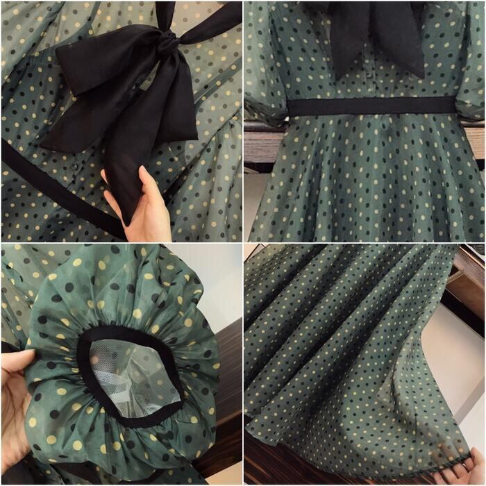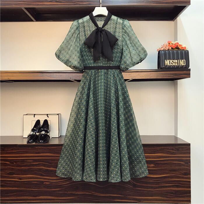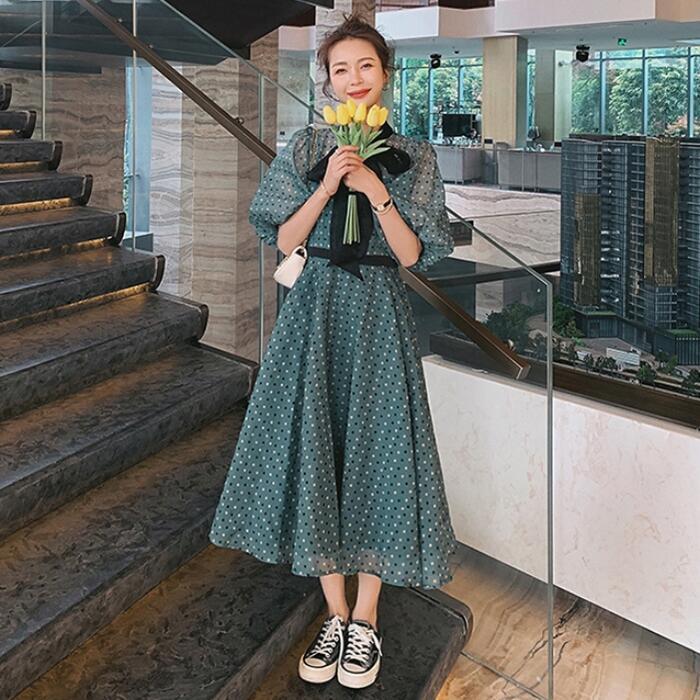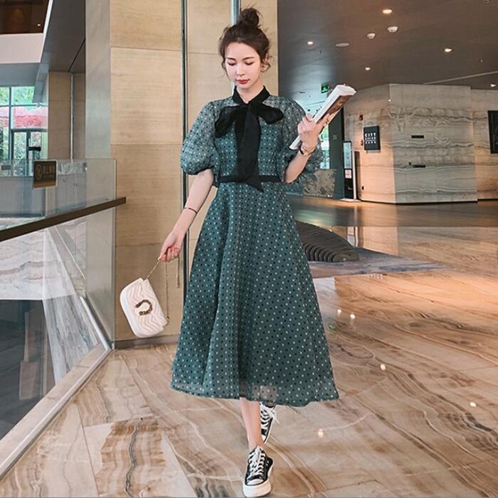 大きいサイズパフスリーブ ワンピース ロングワンピ 袖あり ドット ボウタイ リボン エレガント レディース 五分袖 きれいめ カジュアル ミモレ丈 おしゃれ 大人 可愛い ワンピ ドレス Aライン ハイウエスト クラシカル 緑 グリーン 春 秋 夏 20代 30代 40代 50代