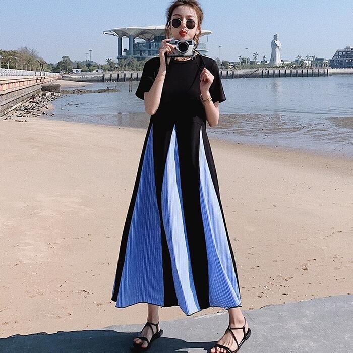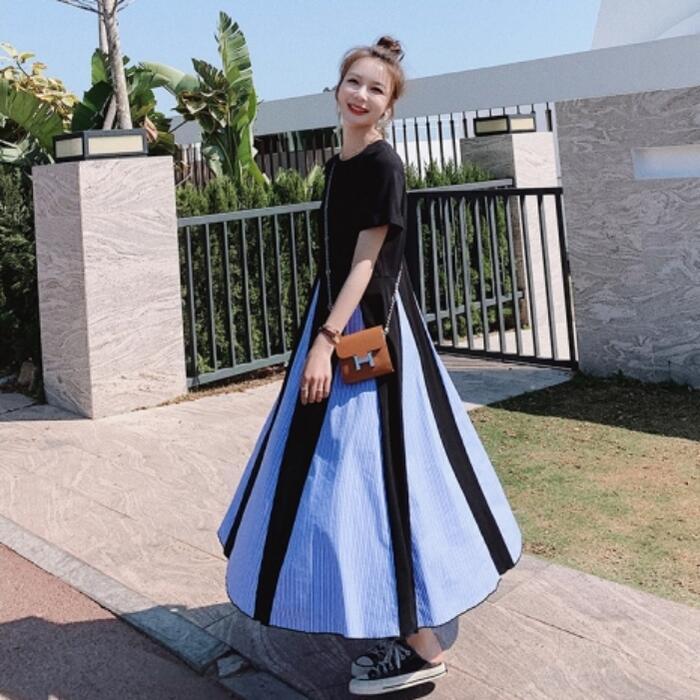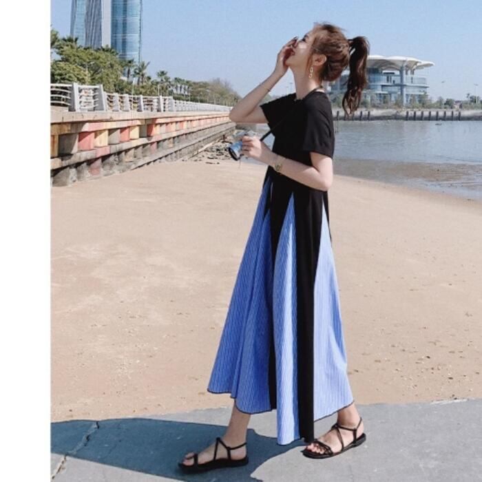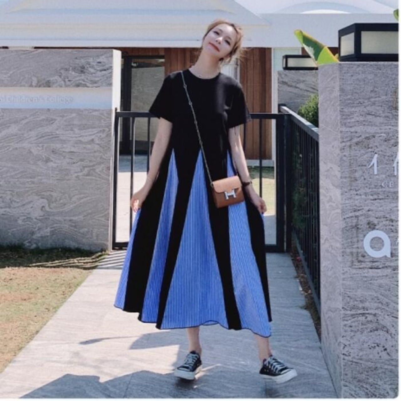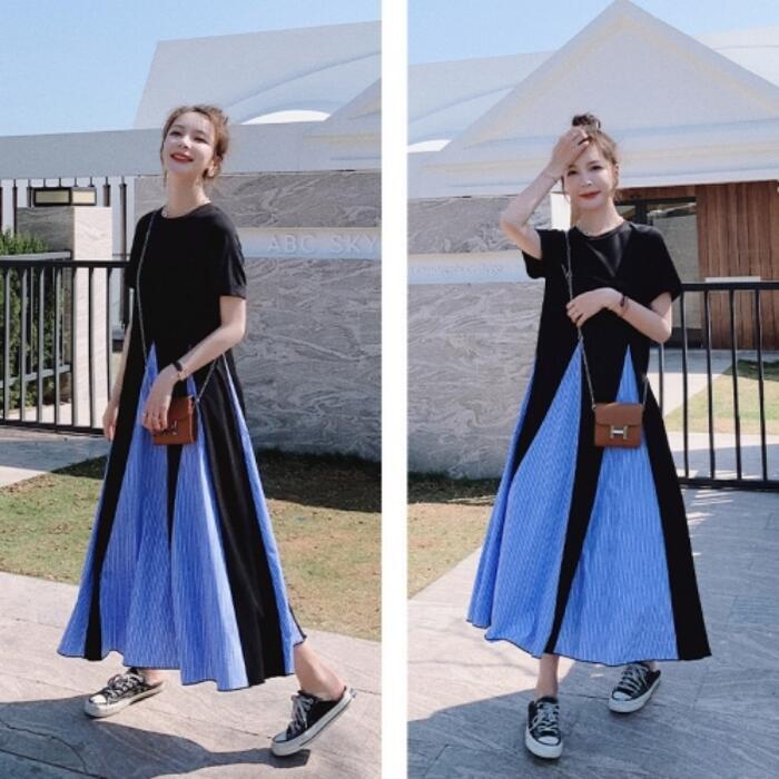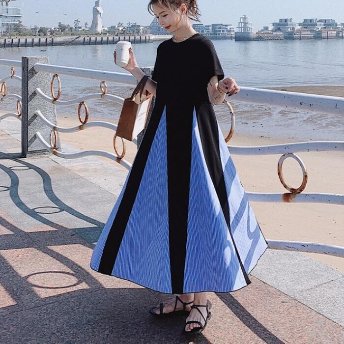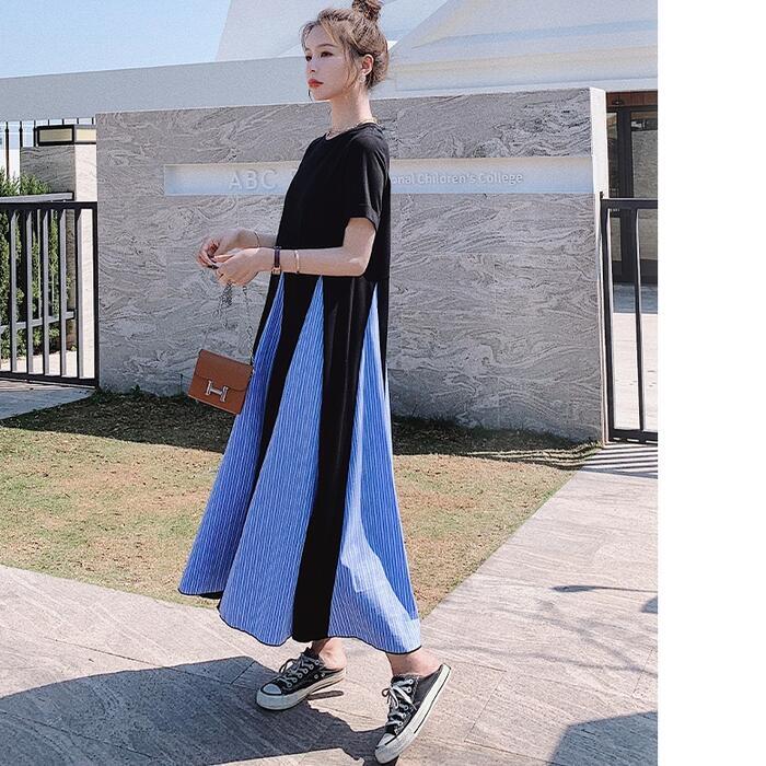大きいサイズワンピース ロングワンピ 袖あり 切り替え ストライプ Tシャツワンピ レディース 半袖 きれいめ カジュアル ロング丈 おしゃれ 大人 可愛い ワンピ ドレス Aライン ゆったり 体型カバー ブラック 黒 春 秋 夏 20代 30代 40代 50代