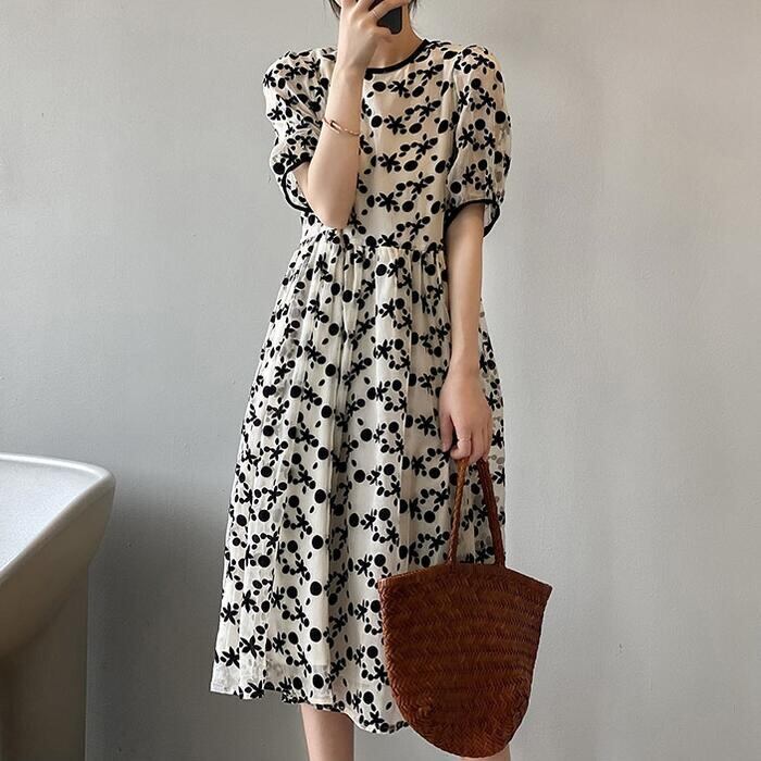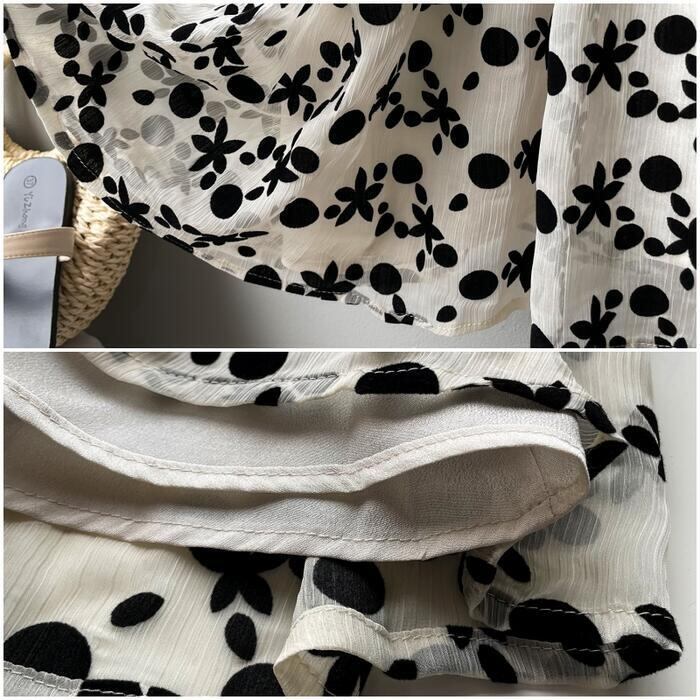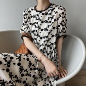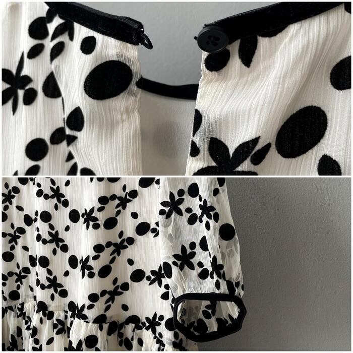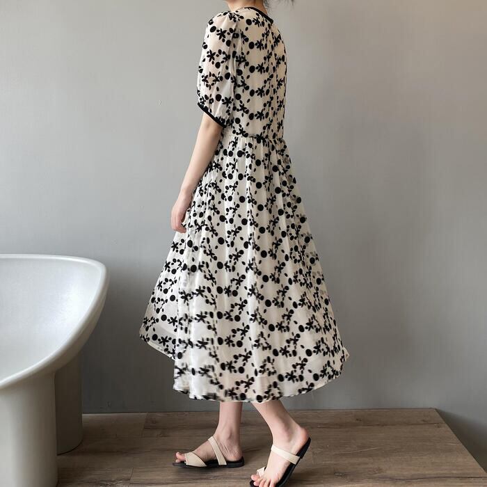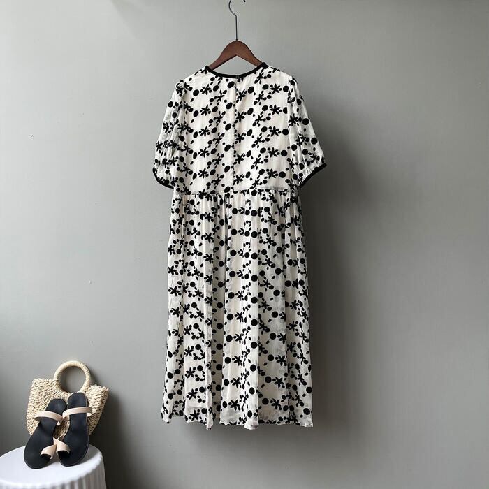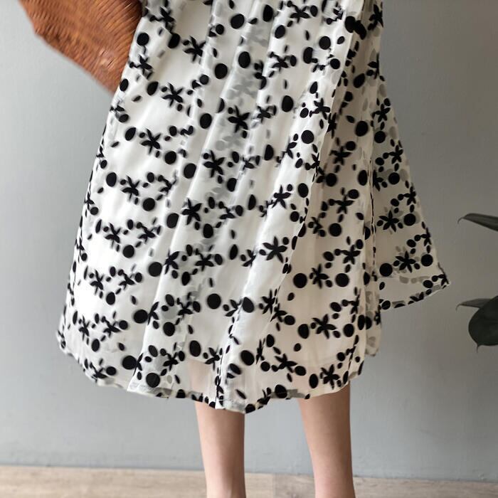 ドット&花柄のシフォンワンピース。