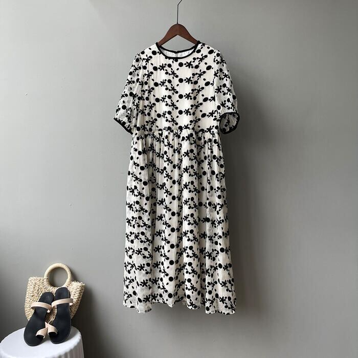 ワンピース ロングワンピ 袖あり 花柄 ドット レディース 半袖 きれいめ エレガント カジュアル ミモレ丈 おしゃれ 大人 可愛い ワンピ ドレス ゆったり 体型カバー 透け感 フェミニン ホワイト 白 春 秋 夏 20代 30代 40代 50代