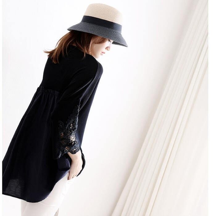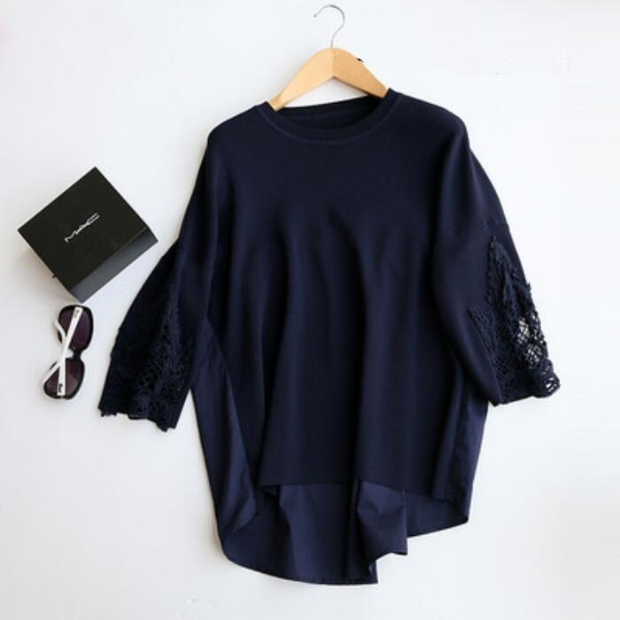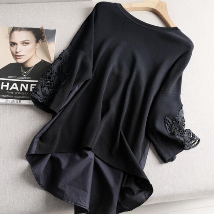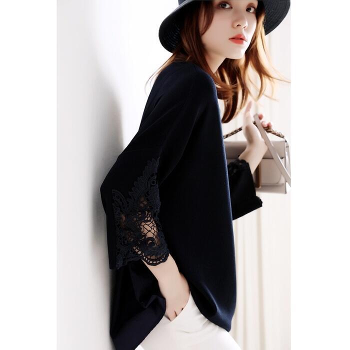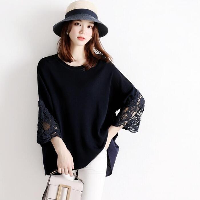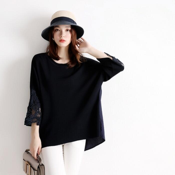 全2色 トップス ニット ブラウス カットソー レディース 七分袖 異素材ミックス 切り替え レース きれいめ エレガント カジュアル おしゃれ 大人 可愛い フェミニン ゆったり 体型カバー ネイビー ブラック 黒 春 夏 秋 20代 30代 40代 50代