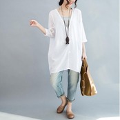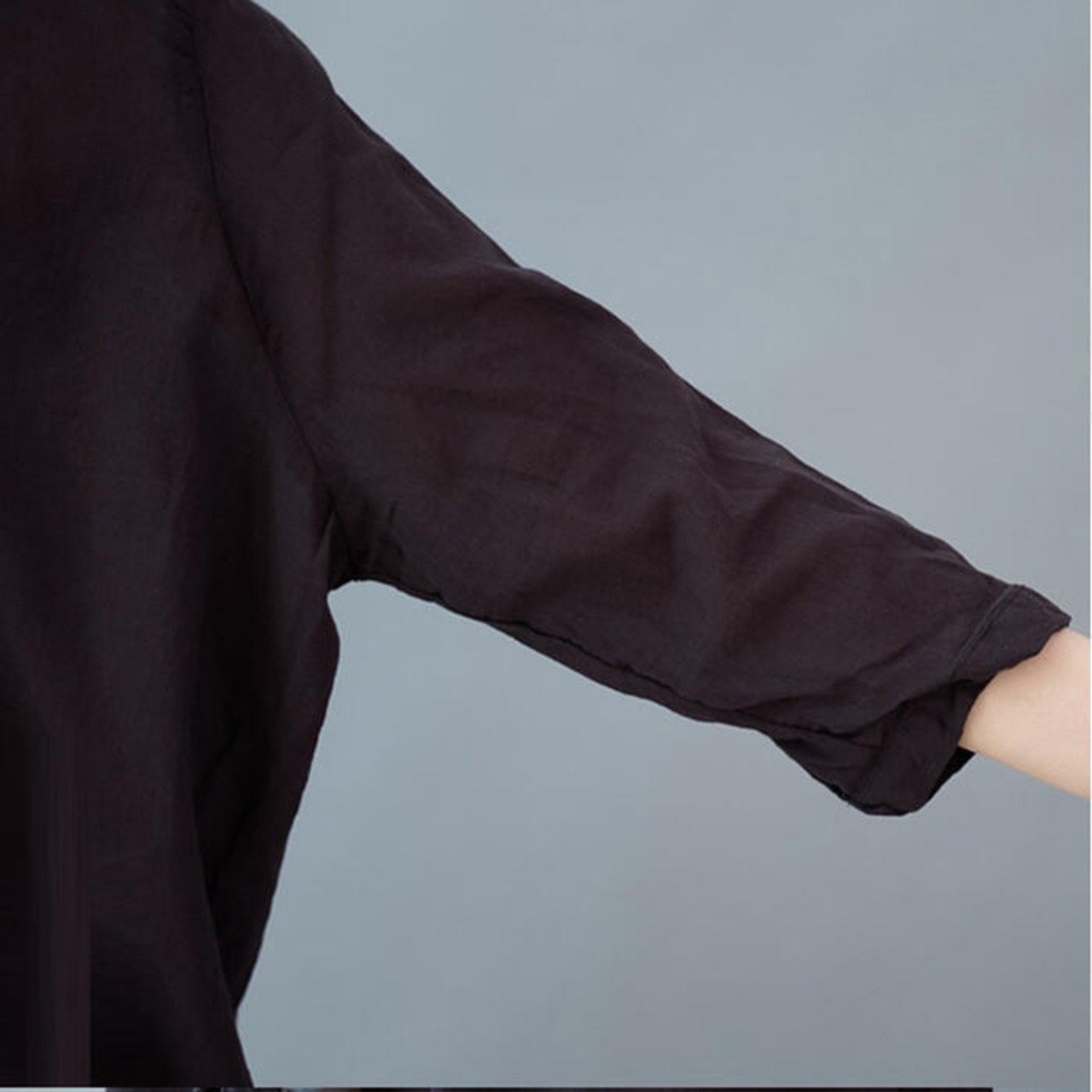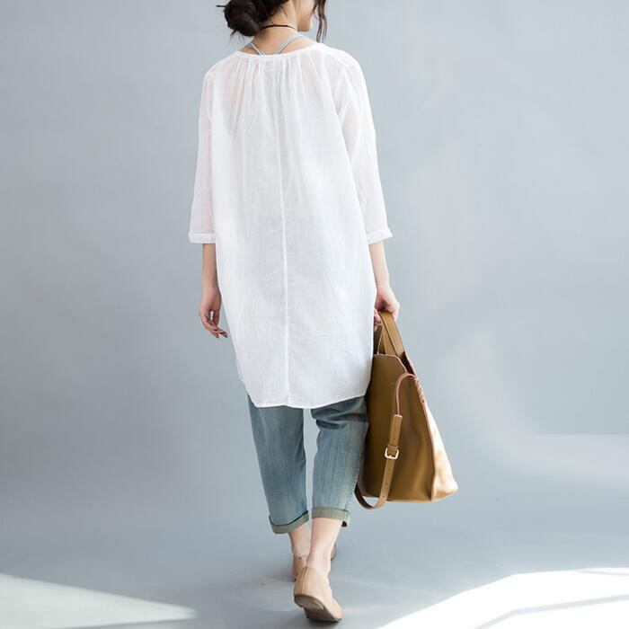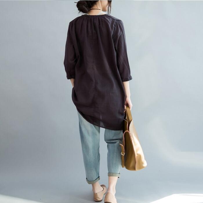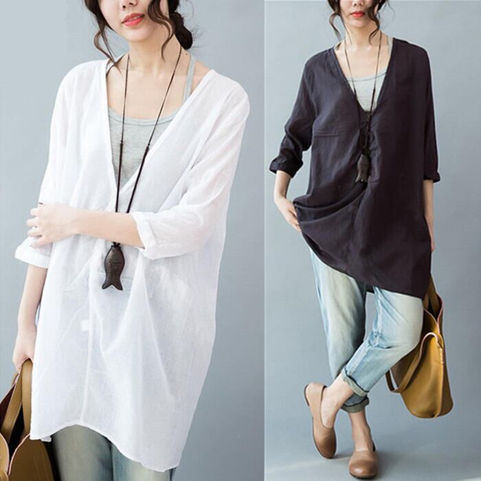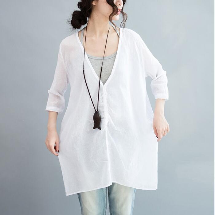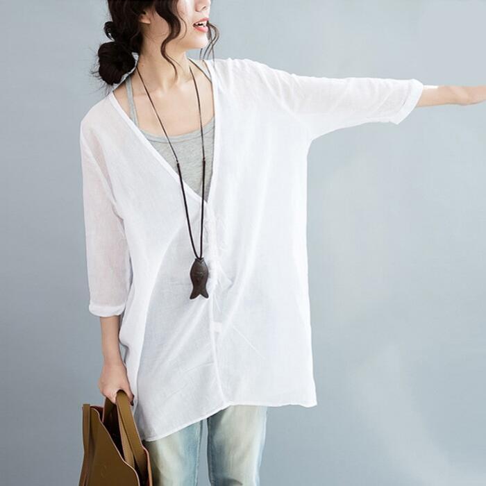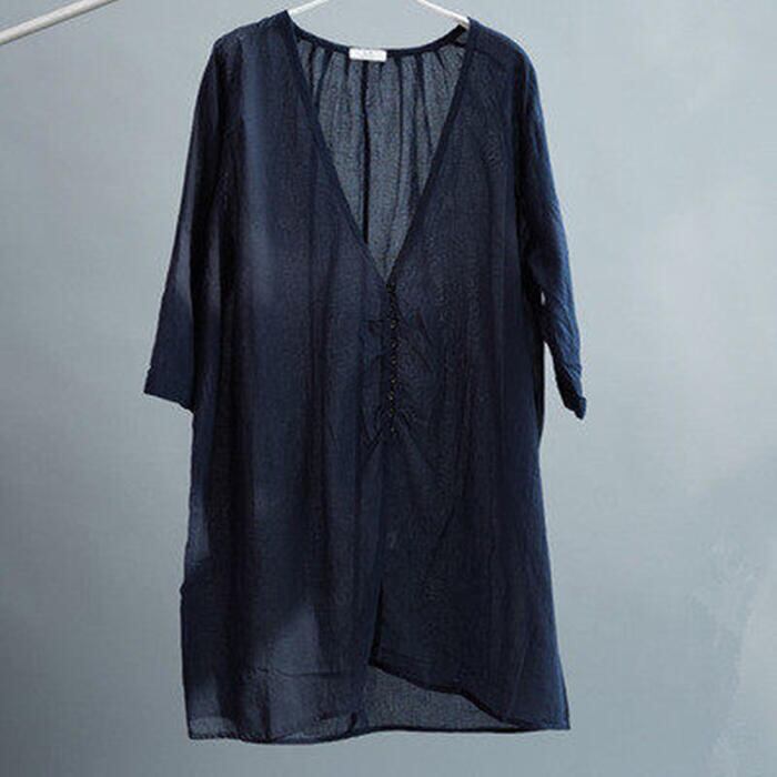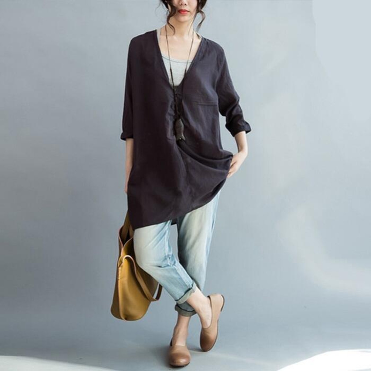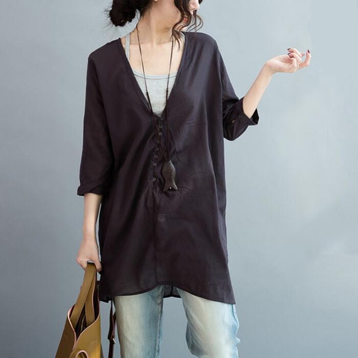 全2色 麻 リネン シャツ ブラウス コットン 薄手 ナチュラル 七分袖 涼しい リネン混 綿 チュニック ゆったり リラックス 大人 可愛い おしゃれ 体型カバー フェミニン Vネック ネイビー ホワイト 白 春 夏 秋 20代 30代 40代 50代