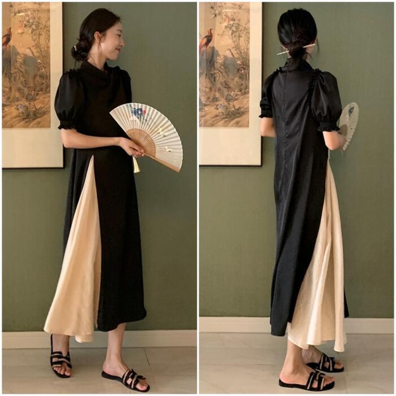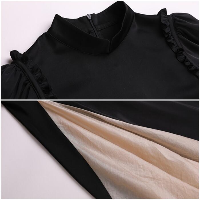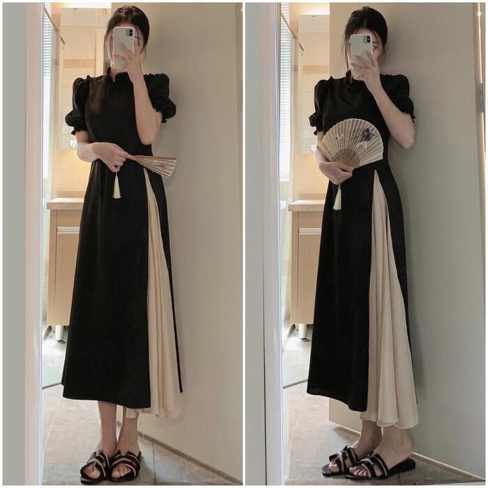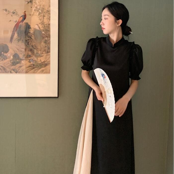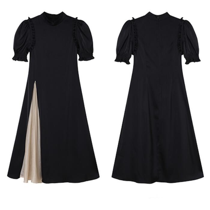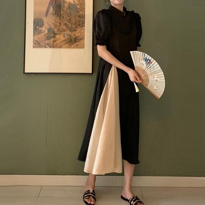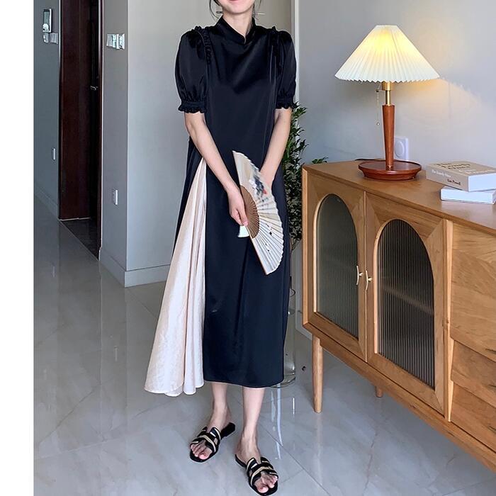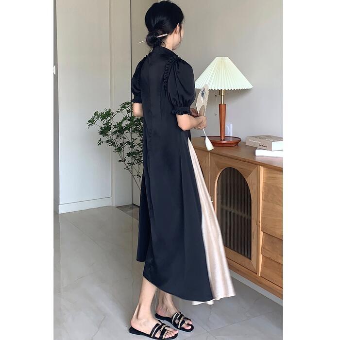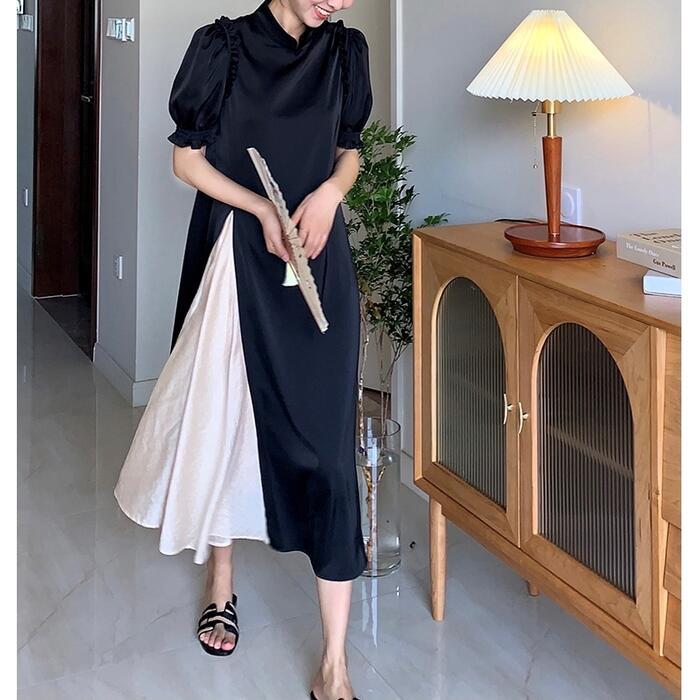 大きいサイズパフスリーブ ワンピース ロングワンピ 袖あり 切り替え レディース 半袖 きれいめ カジュアル エレガント ロング丈 おしゃれ 大人 可愛い バイカラー ワンピ ドレス Aライン ハイウエスト フェミニン ブラック 黒 春 秋 夏 20代 30代 40代 50代
