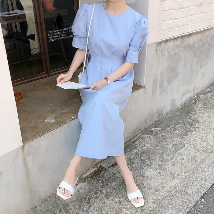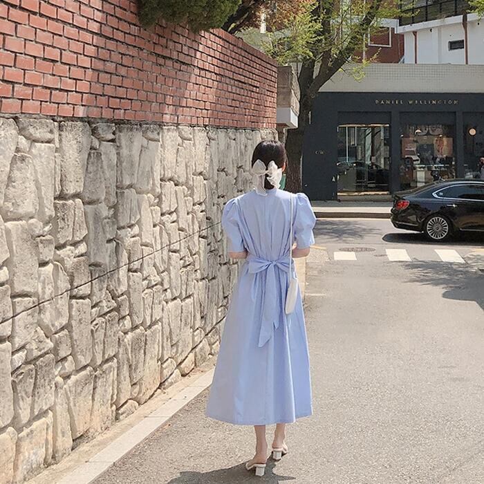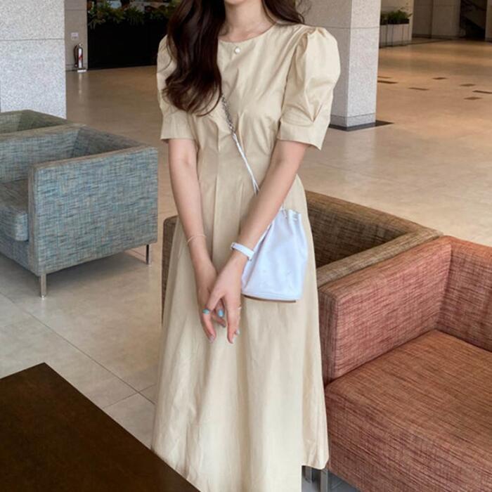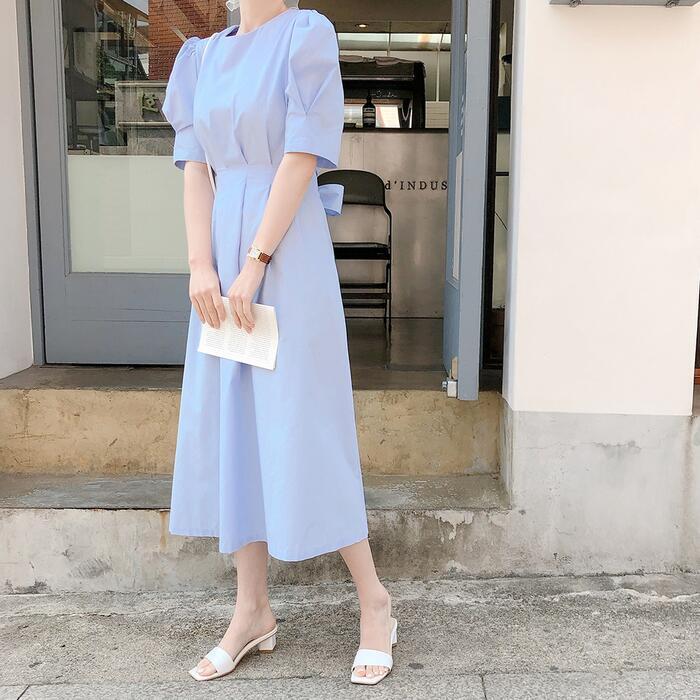 全2色 大きいサイズワンピース ロングワンピ 袖あり パフスリーブ レディース 半袖 きれいめ カジュアル ミモレ丈 おしゃれ 大人 可愛い ワンピ ドレス ウエストリボン ハイウエスト シンプル フェミニン Aライン イエロー ブルー 青 春 秋 夏 20代 30代 40代 50代