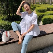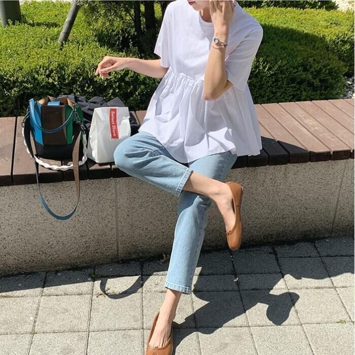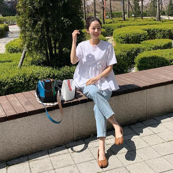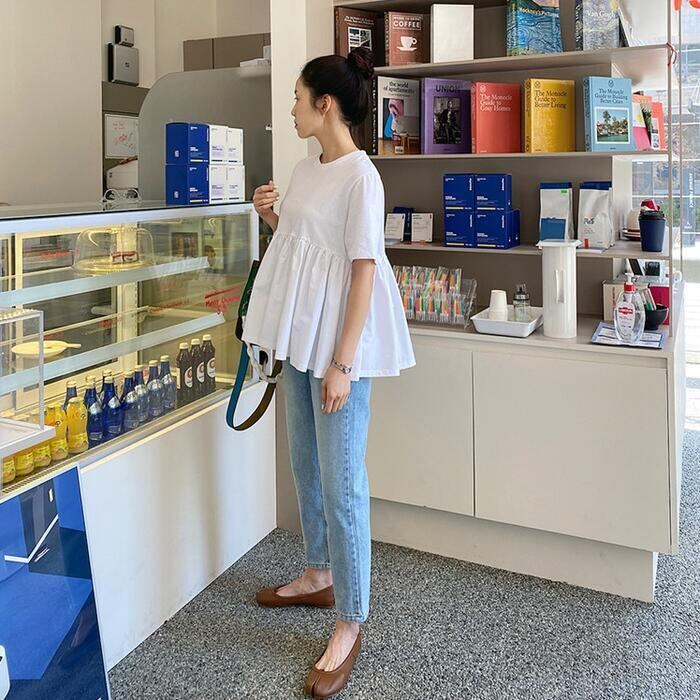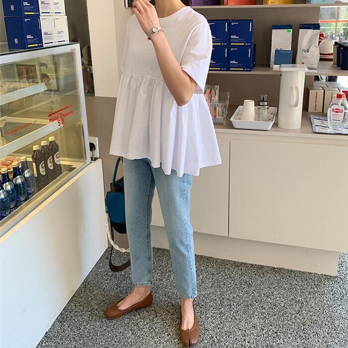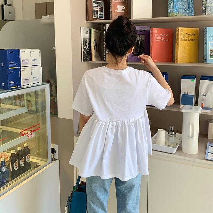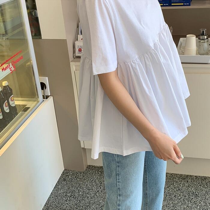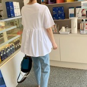ペプラムデザインの半袖Tシャツ。