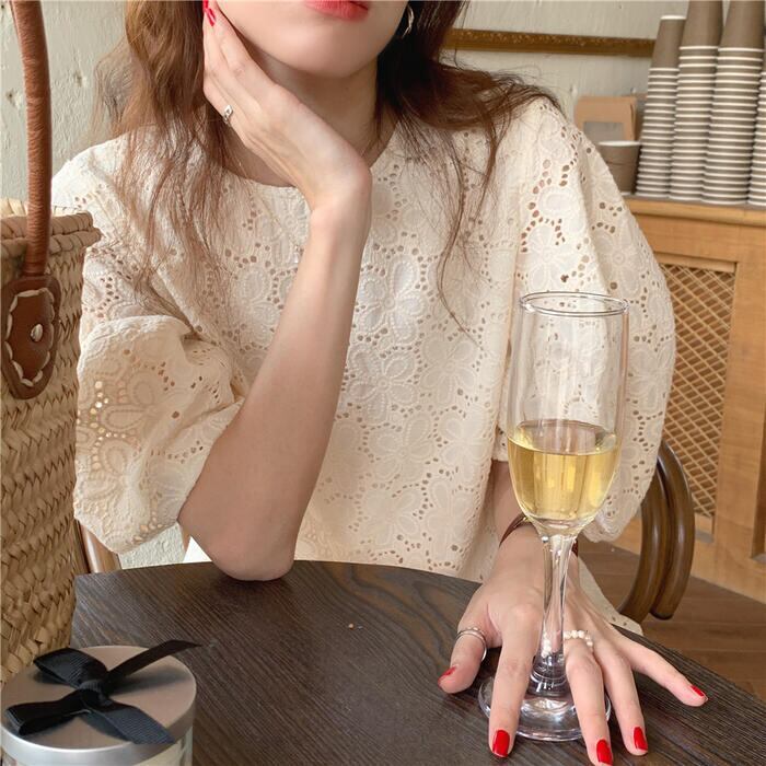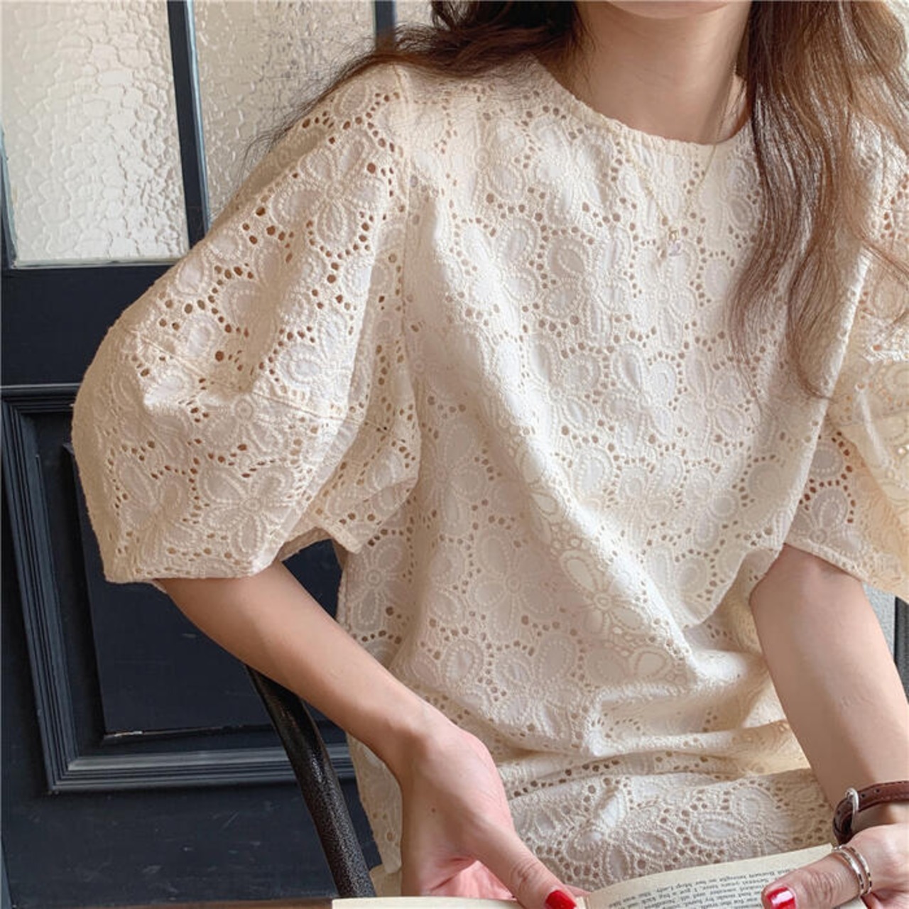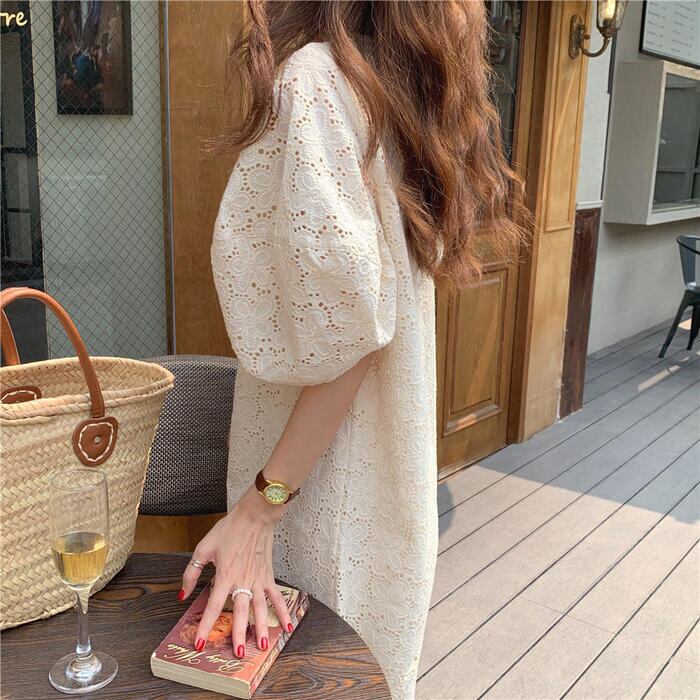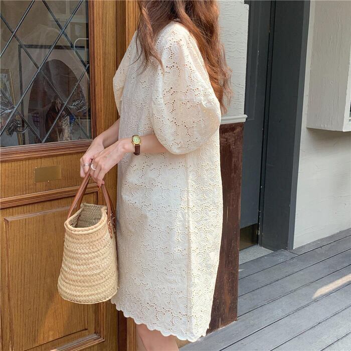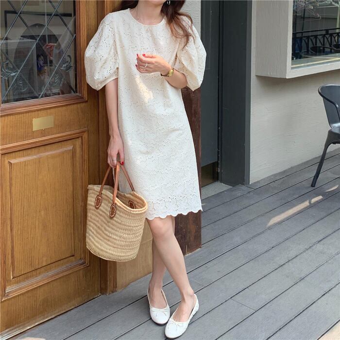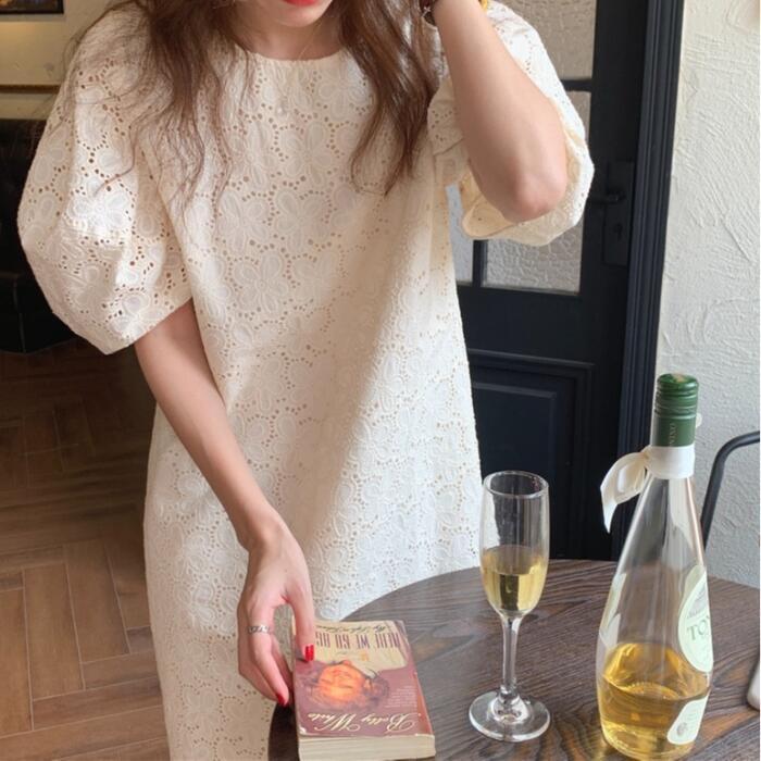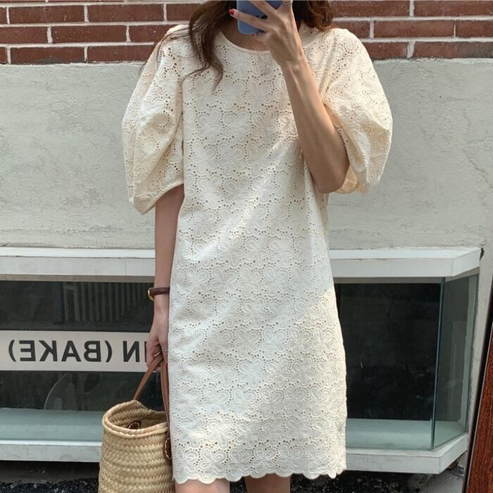 パフスリーブ ワンピース ミディワンピ 袖あり 花 レース カットワーク レディース きれいめ カジュアル ひざ丈 おしゃれ 大人 可愛い ワンピ ドレス ゆったり 体型カバー フェミニン ベージュ 春 秋 夏 20代 30代 40代 50代