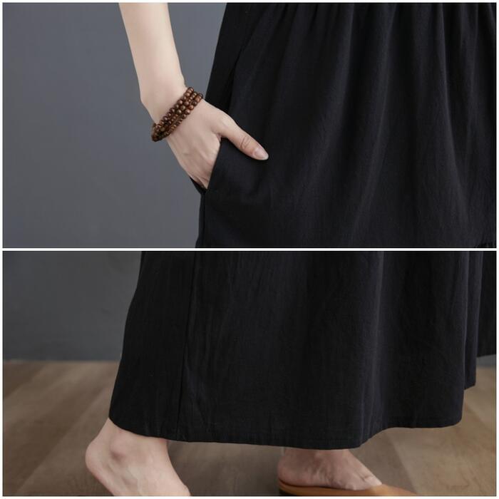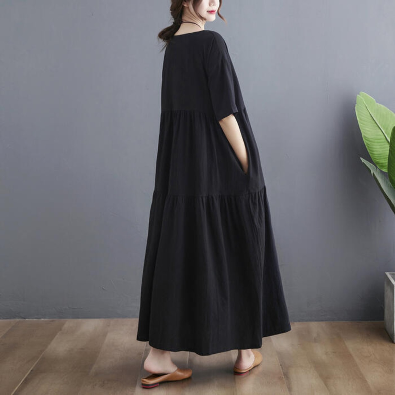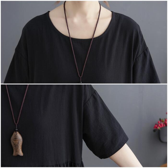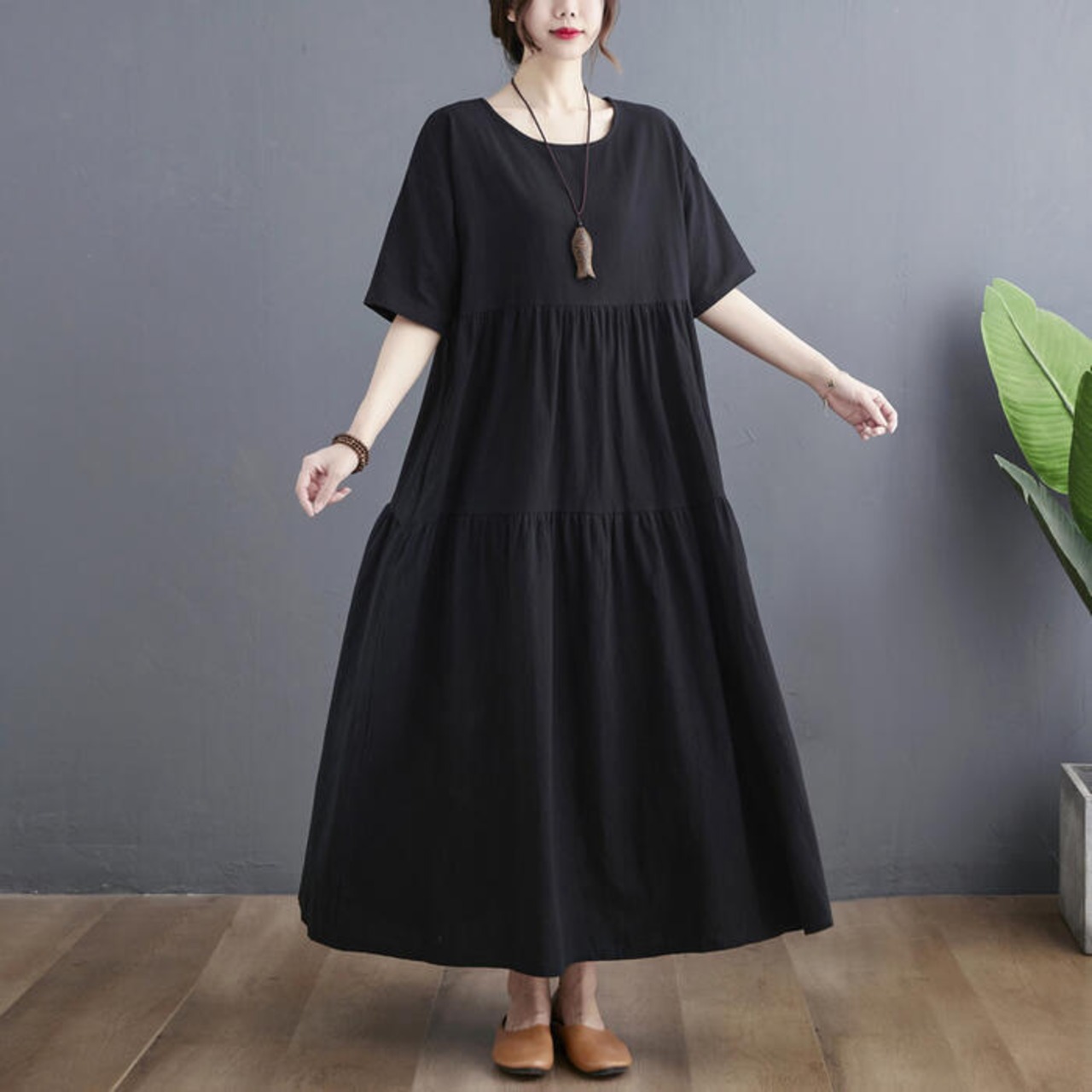 大きいサイズリネン リネン混 ティアード ワンピース 袖あり きれいめ カジュアル ロング丈 綿麻 薄手 おしゃれ レディース 可愛い 五分袖 フェミニン ワンピ ドレス ナチュラル リラックス ゆったり 体型カバー ブラック 黒 春 秋 夏 20代 30代 40代 50代
