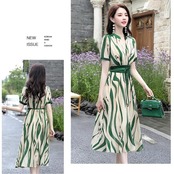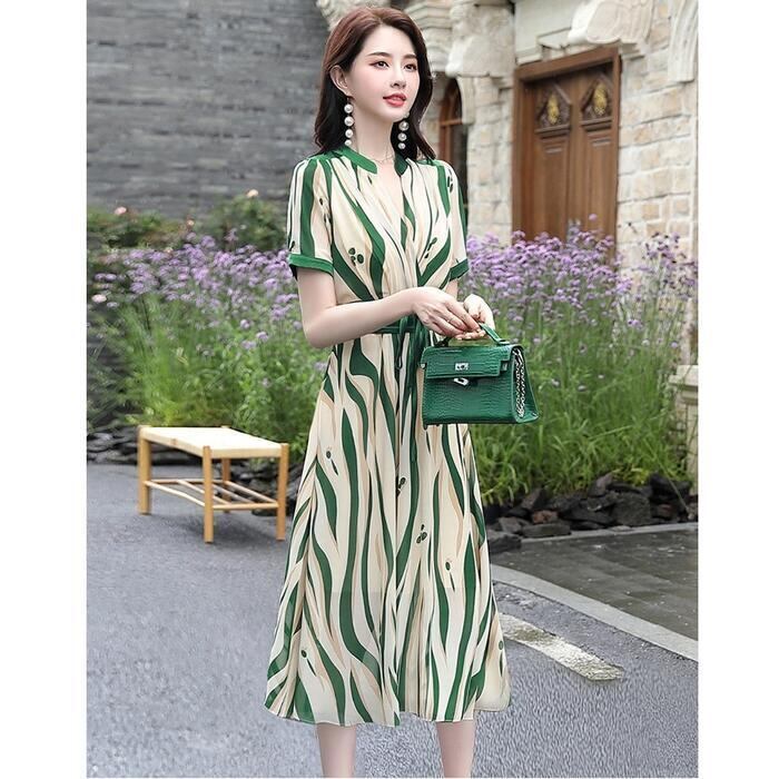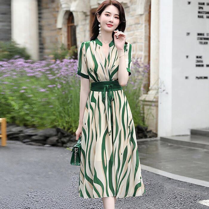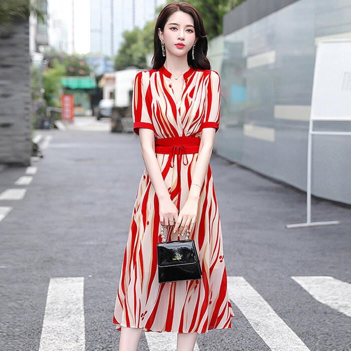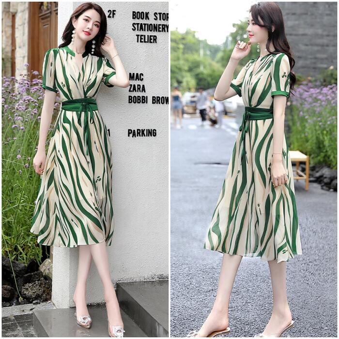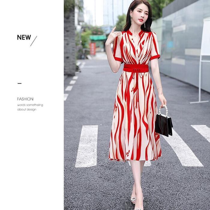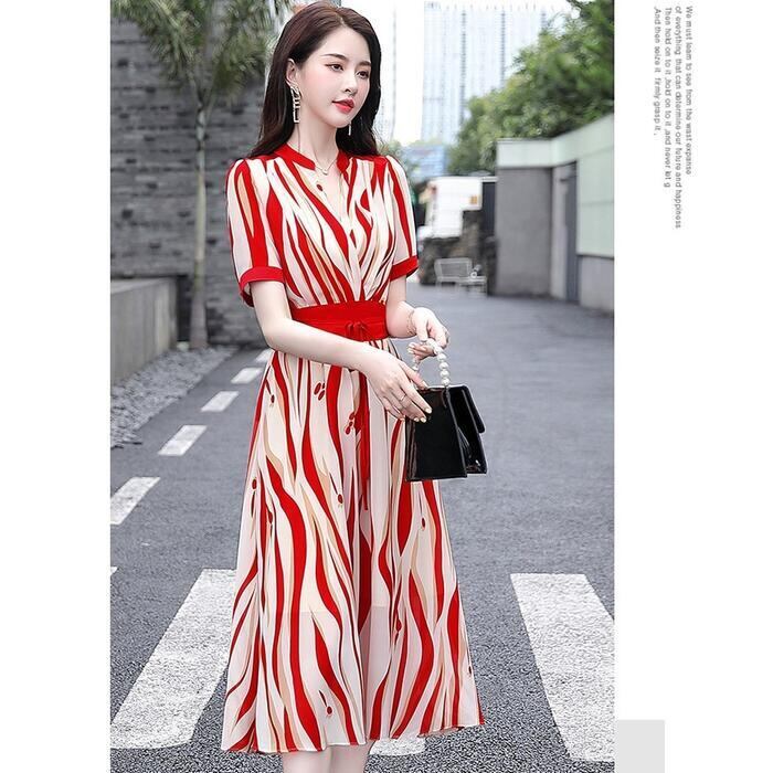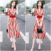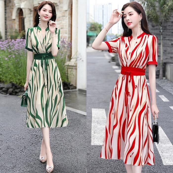 全2色 大きいサイズワンピース ロングワンピ ストライプ 袖あり 切り替え レディース エレガント きれいめ カジュアル ミモレ丈 おしゃれ 大人 可愛い ワンピ ドレス 半袖 ハイウエスト Aライン レッド 赤 グリーン 緑 春 秋 夏 20代 30代 40代 50代