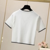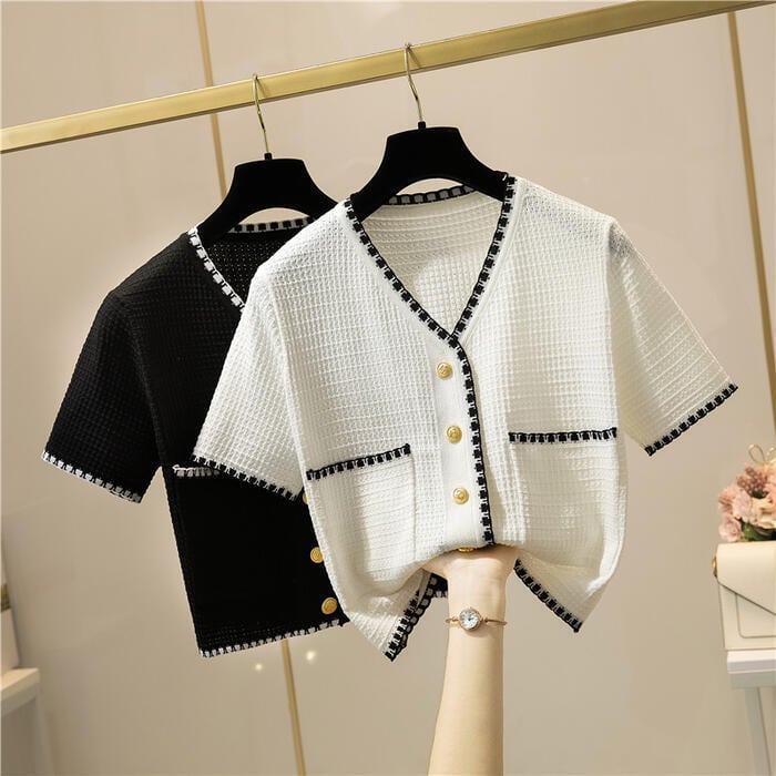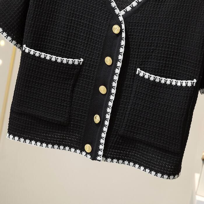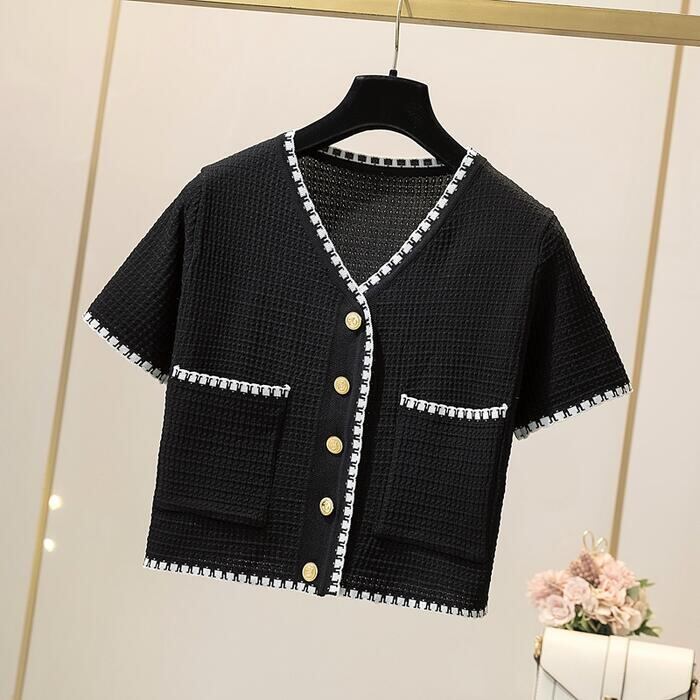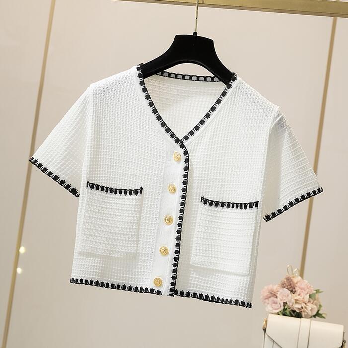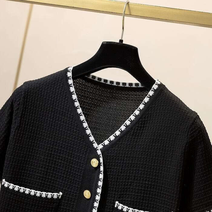 全2色 トップス ニット カーディガン カットソー 配色 レディース 半袖 エレガント きれいめ カジュアル おしゃれ 大人 可愛い フェミニン ショート丈 シンプル 通勤 羽織 ブラック 黒 ホワイト 白 春 夏 秋 20代 30代 40代 50代
