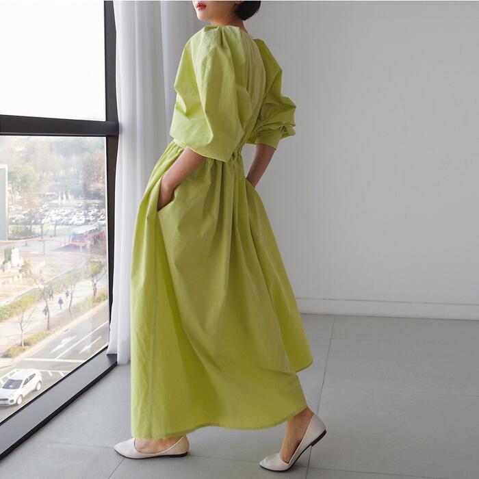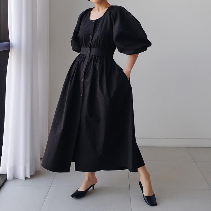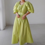 ふんわりしたボリュームスリーブのシャツワンピース。