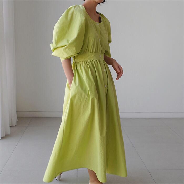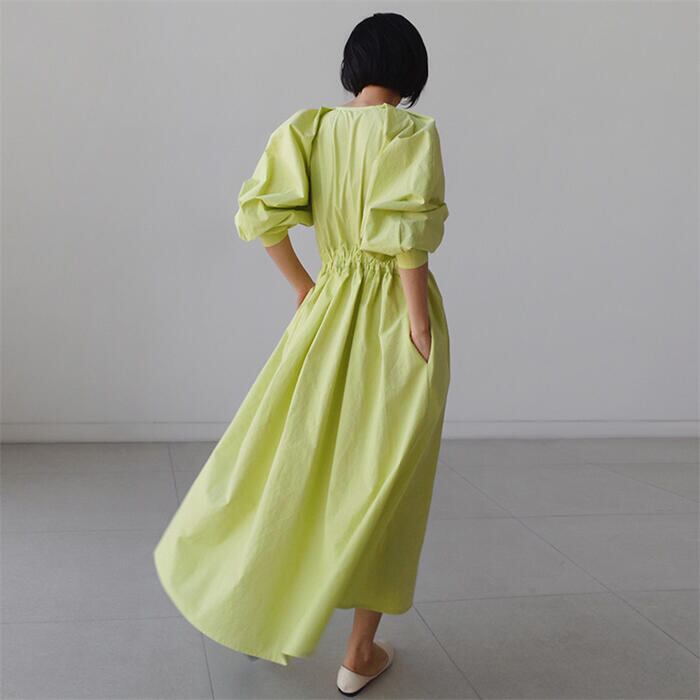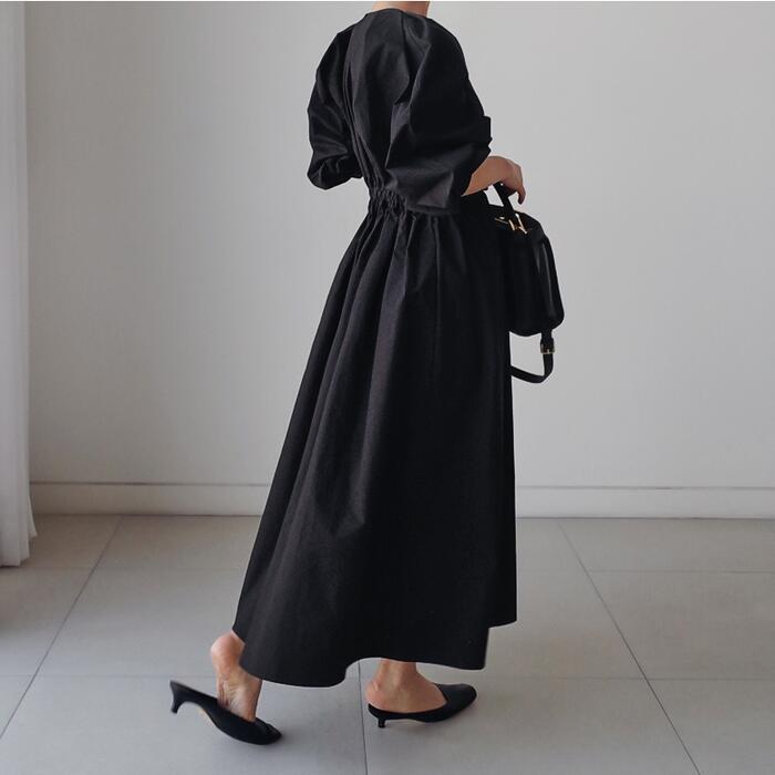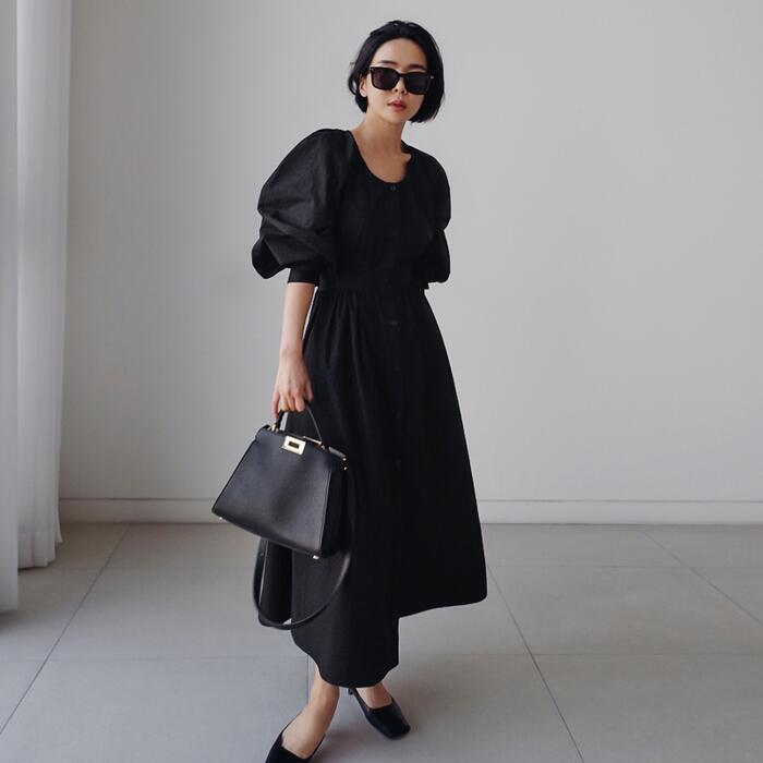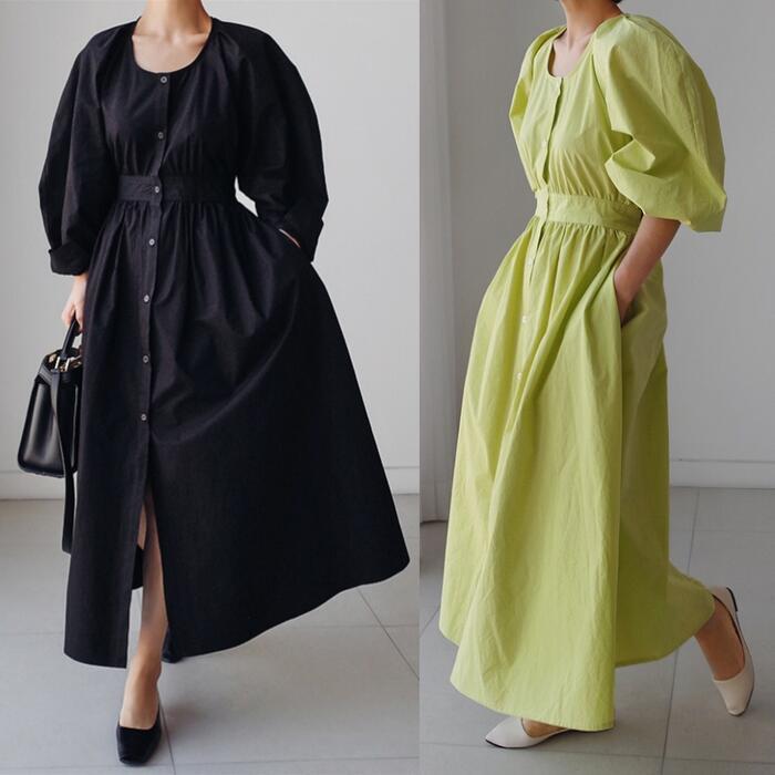 全2色 大きいサイズワンピース ロングワンピ ボリュームスリーブ 袖あり シャツワンピ レディース エレガント きれいめ カジュアル ロング丈 おしゃれ 大人 可愛い ワンピ ドレス 長袖 ハイウエスト Aライン イエロー ブラック 黒 春 秋 夏 20代 30代 40代 50代