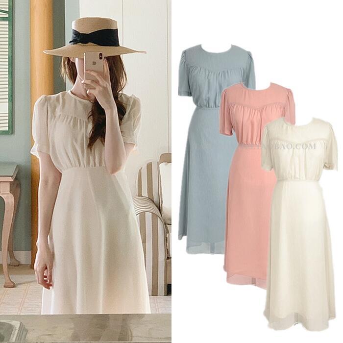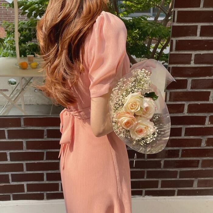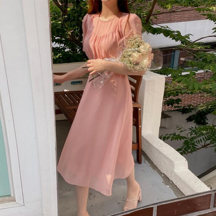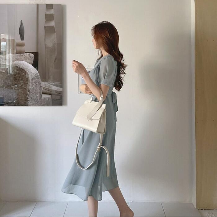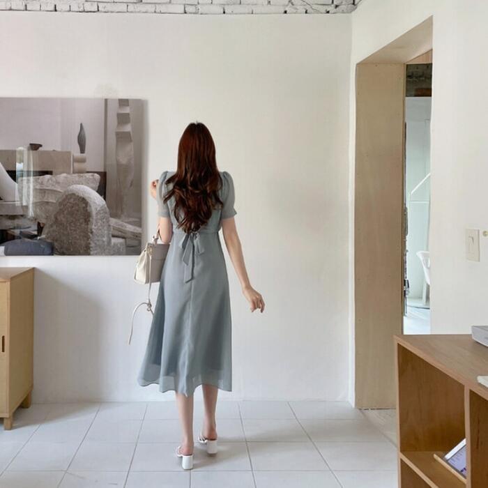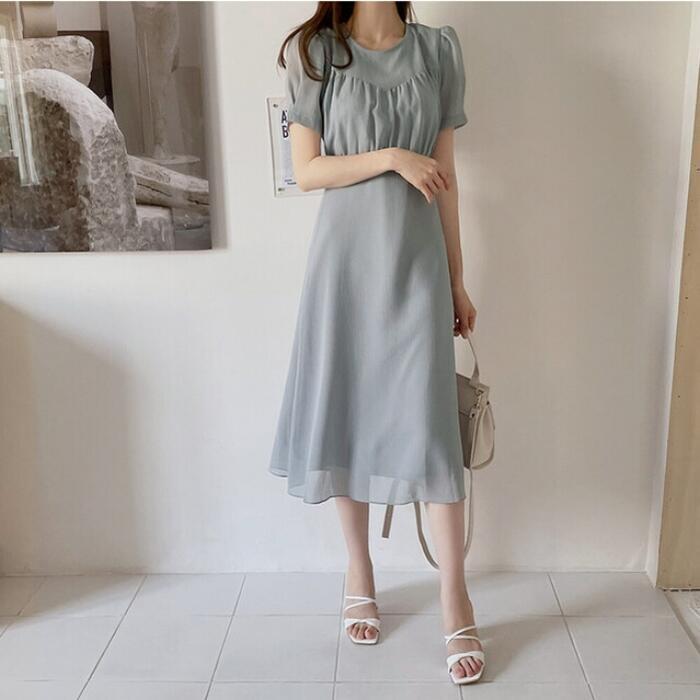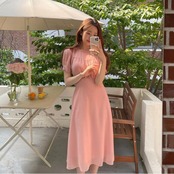 全3色 大きいサイズ ワンピース ロングワンピ パフスリーブ 袖あり 切り替え レディース エレガント きれいめ カジュアル ミモレ丈 おしゃれ 大人 可愛い ワンピ ドレス 半袖 バックリボン Aライン ピンク ベージュ ブルー 青 春 秋 夏 20代 30代 40代 50代