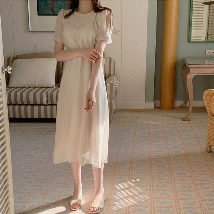 胸元の切り替えにたっぷりギャザーを入れて大人可愛さを演出。