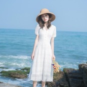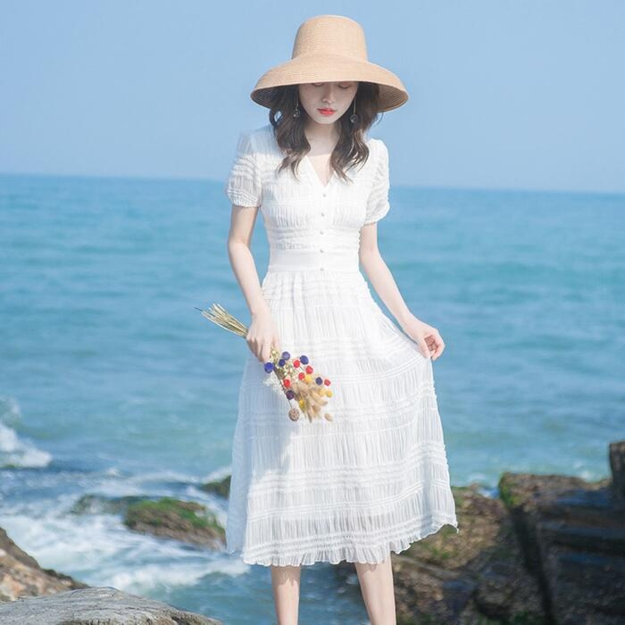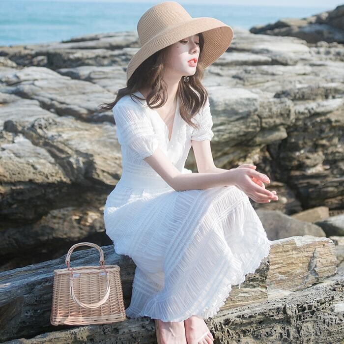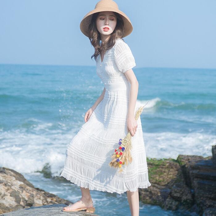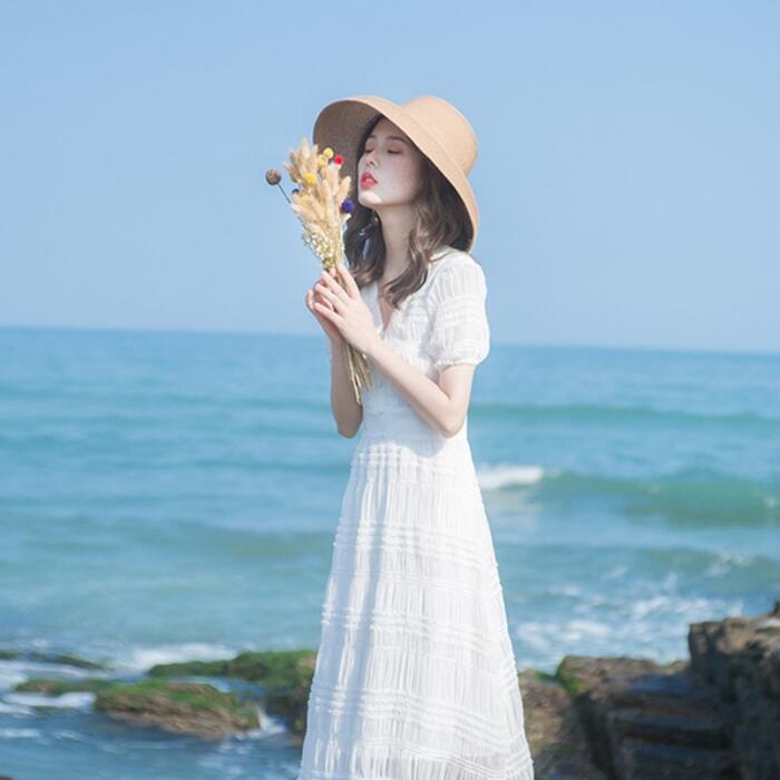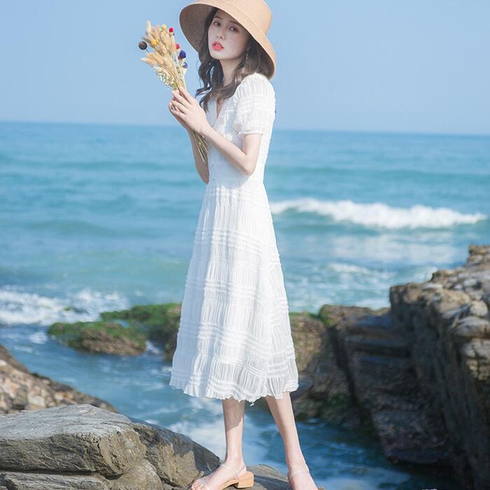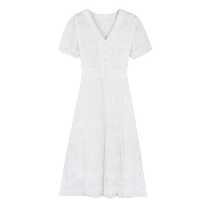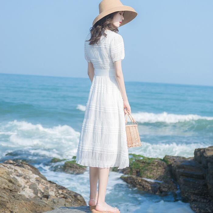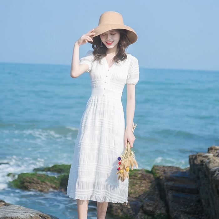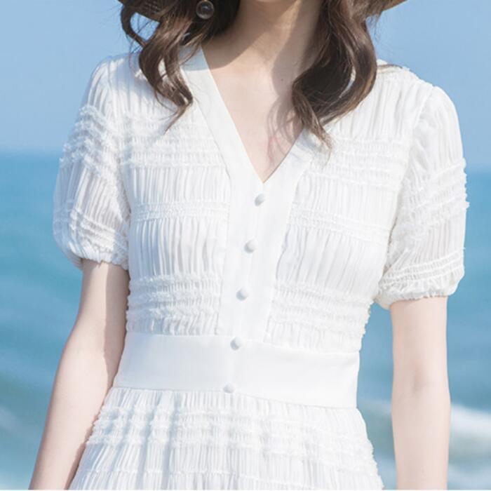 ワンピース パフスリーブ 袖あり 切り替え しわ レディース エレガント きれいめ カジュアル ミモレ丈 おしゃれ 大人 可愛い ワンピ ドレス 半袖 ハイウエスト Vネック Aライン ホワイト 白 春 秋 夏 20代 30代 40代 50代
