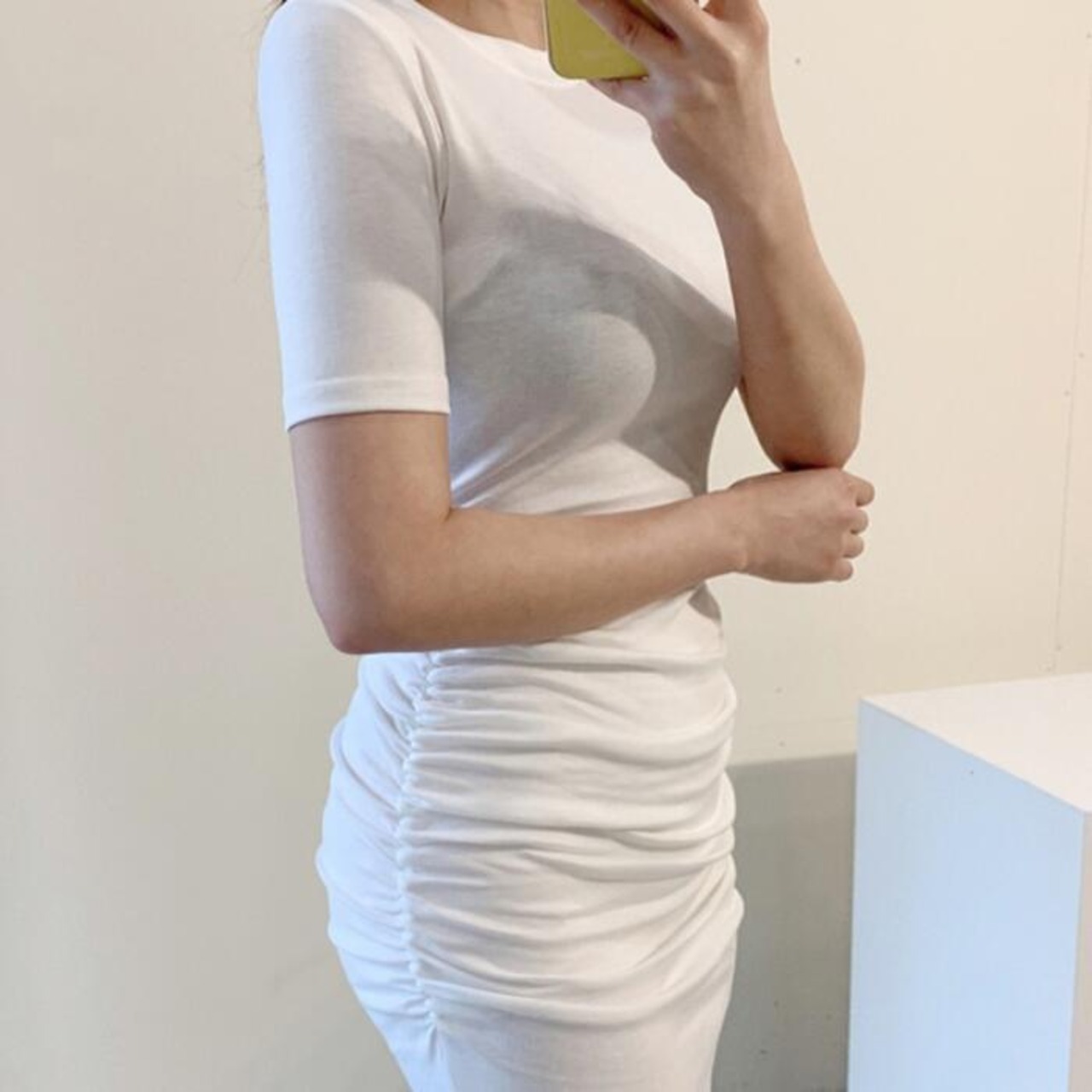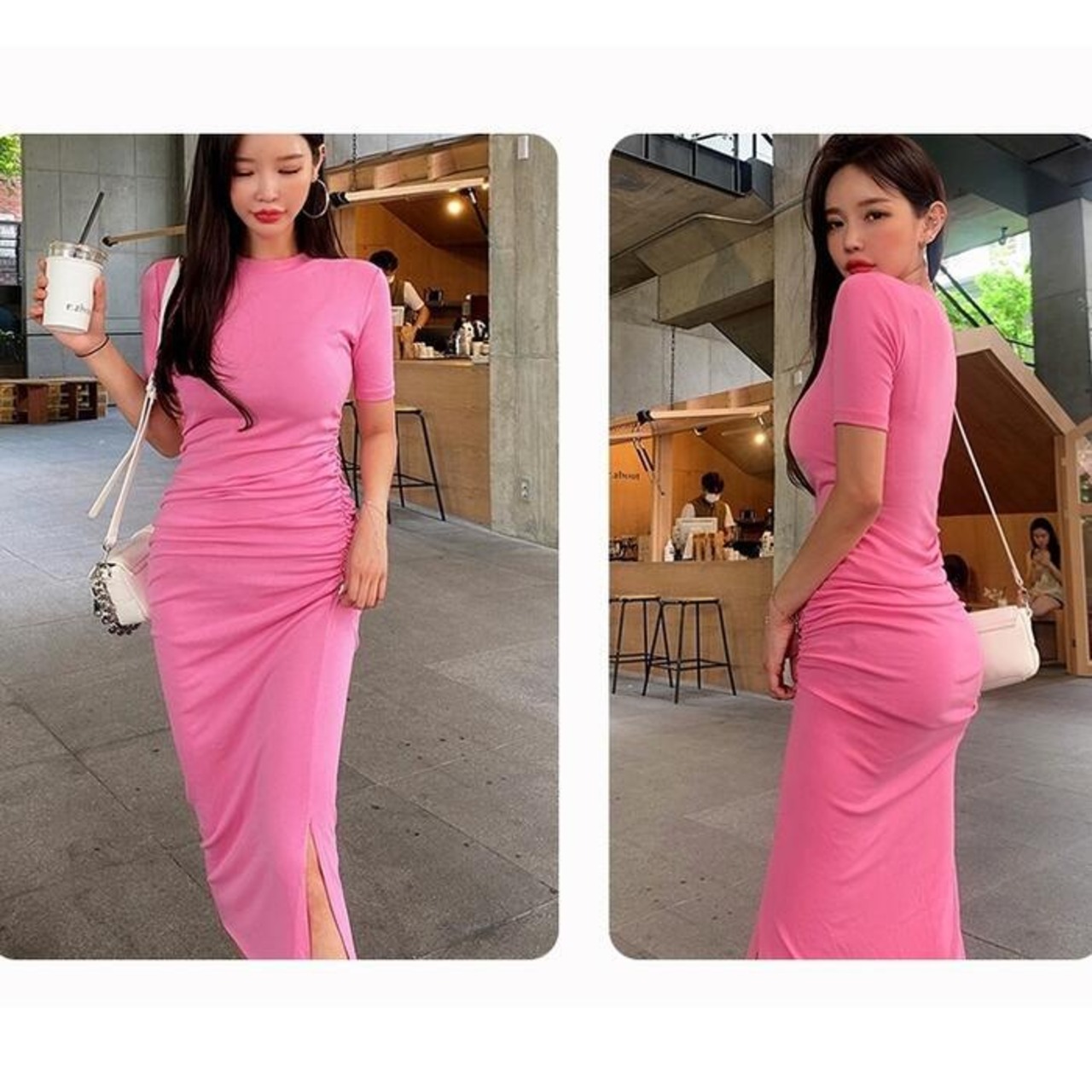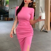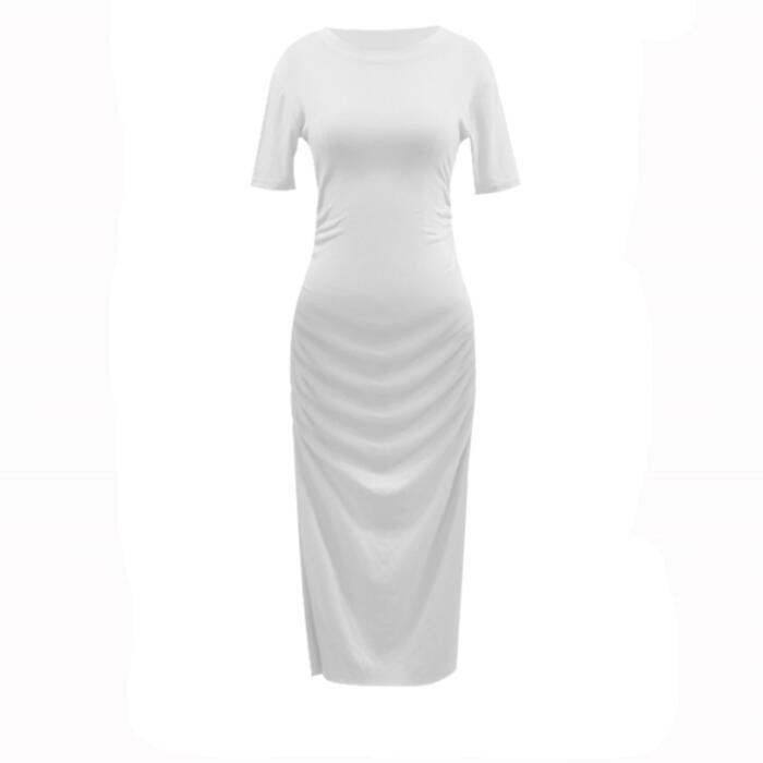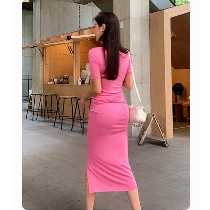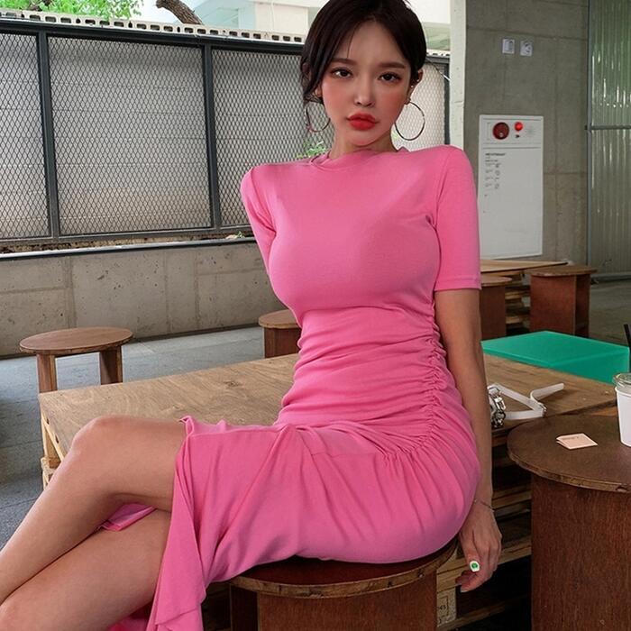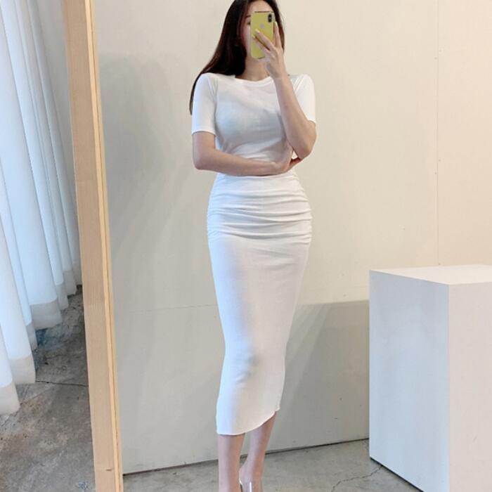 全4色 大きいサイズワンピース ロングワンピ 袖あり Tシャツワンピ ギャザー 半袖 レディース エレガント きれいめ カジュアル ミモレ丈 おしゃれ 大人 可愛い ワンピ ドレス タイト スリム ピンク ホワイト 白 ブルー ブラック 黒 春 秋 夏 20代 30代 40代 50代