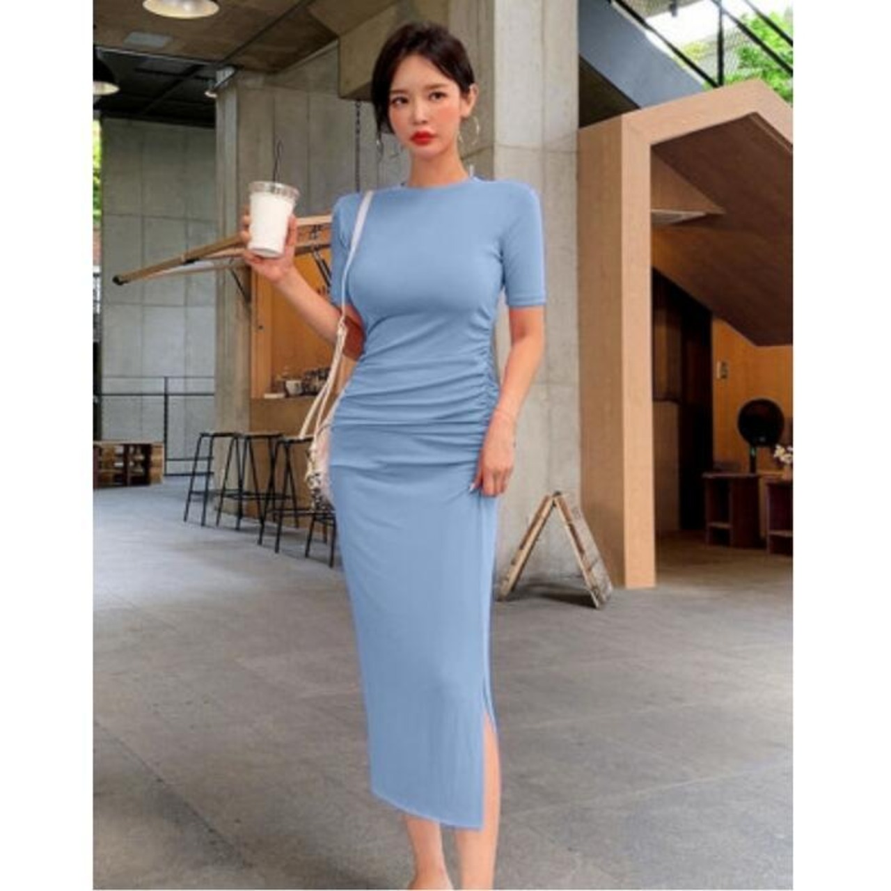 大人レディな雰囲気のミモレ丈ギャザーワンピース。