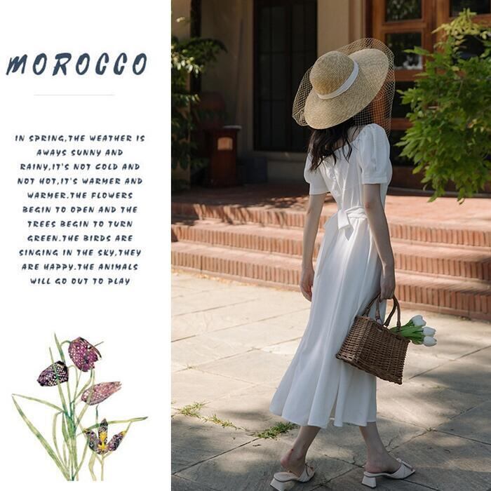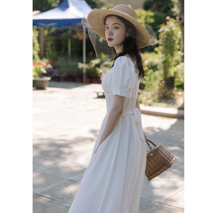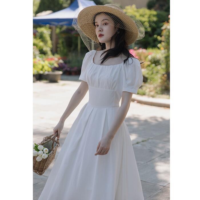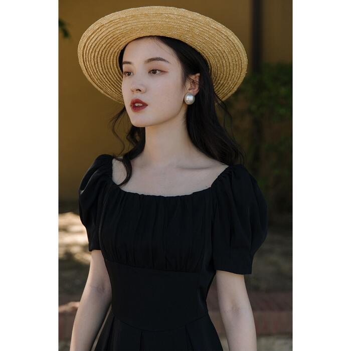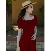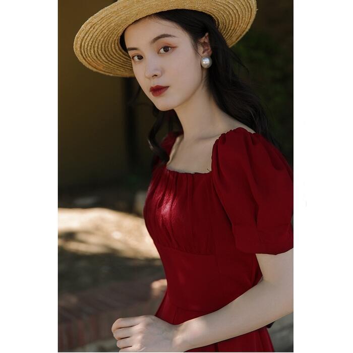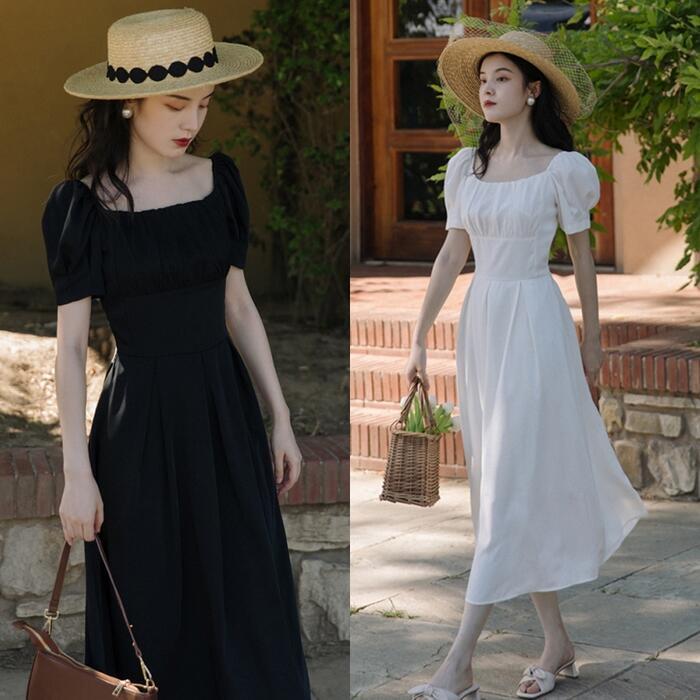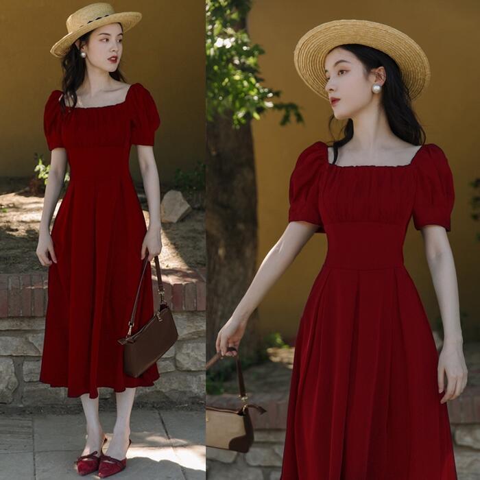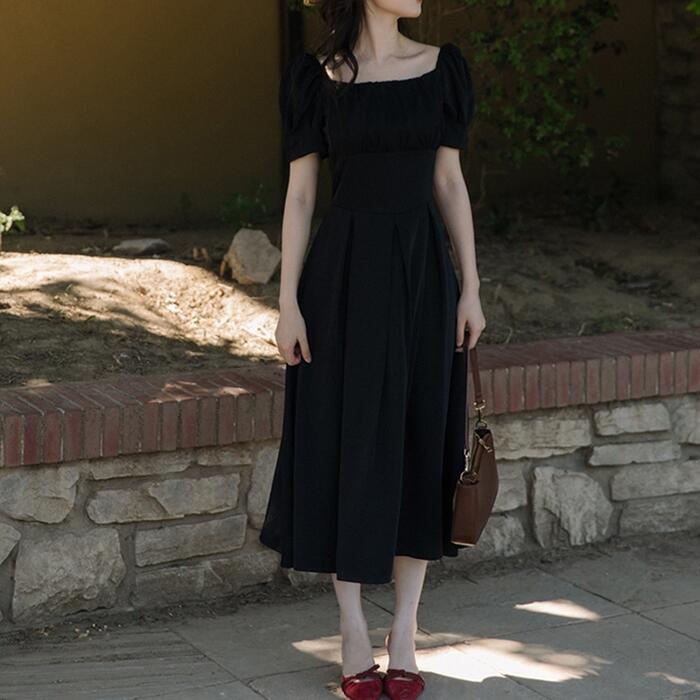 全3色 大きいサイズパフスリーブ ワンピース ロングワンピ 袖あり スクエアネック 半袖 レディース エレガント きれいめ カジュアル ミモレ丈 おしゃれ 大人 可愛い ワンピ ドレス ハイウエスト 切り替え レッド 赤 ホワイト 白 ブラック 黒 春 秋 夏 20代 30代 40代 50代