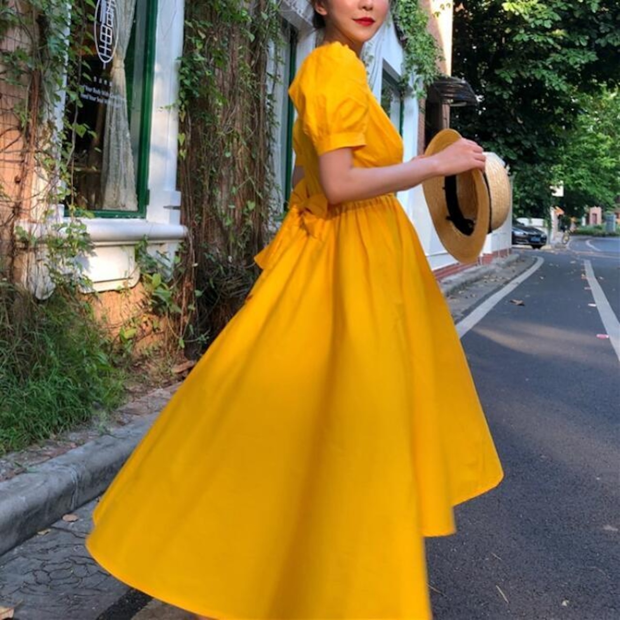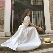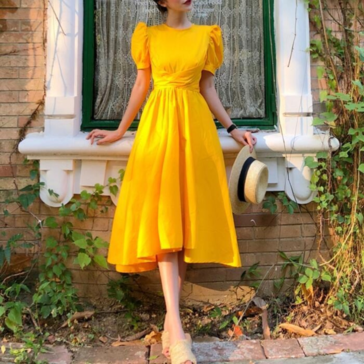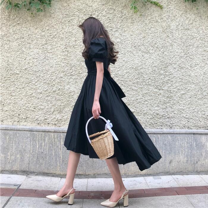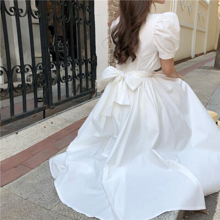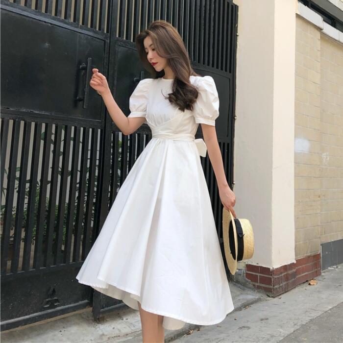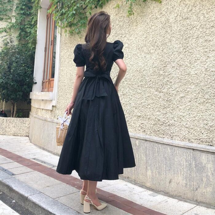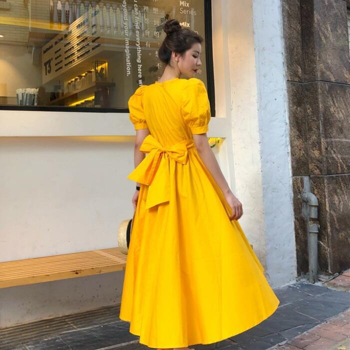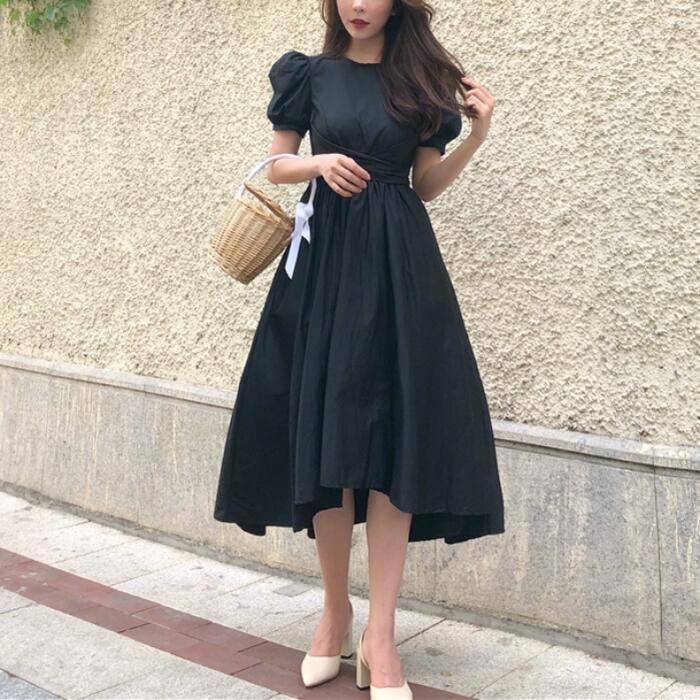 全3色 お呼ばれパフスリーブ ワンピース ロングワンピ 袖あり フィッシュテール 半袖 レディース エレガント きれいめ カジュアル ミモレ丈 おしゃれ 大人 可愛い ワンピ ドレス ハイウエスト リボン イエロー ホワイト 白 ブラック 黒 春 秋 夏 20代 30代 40代 50代