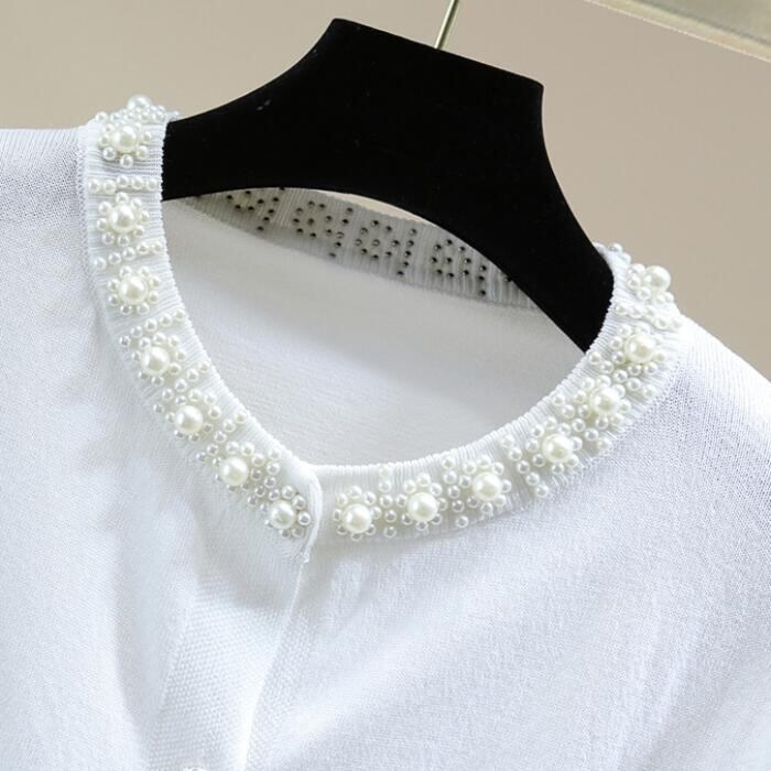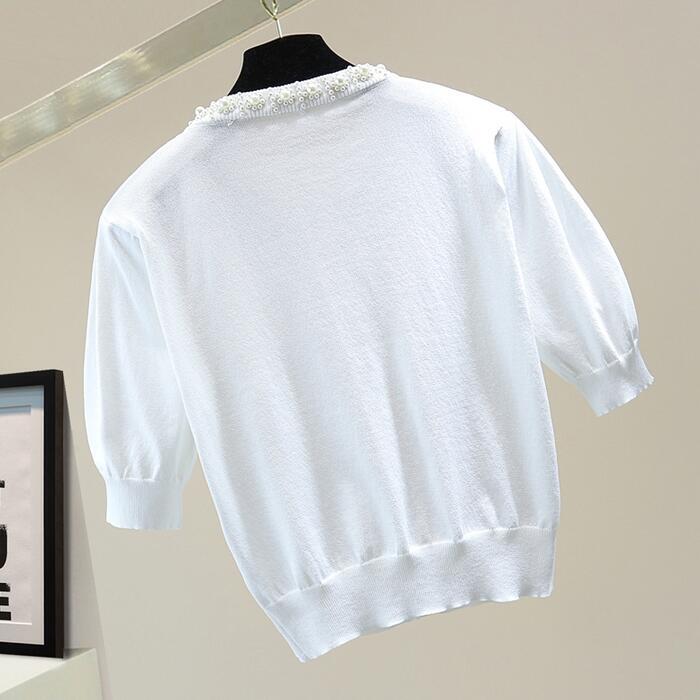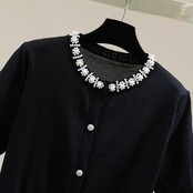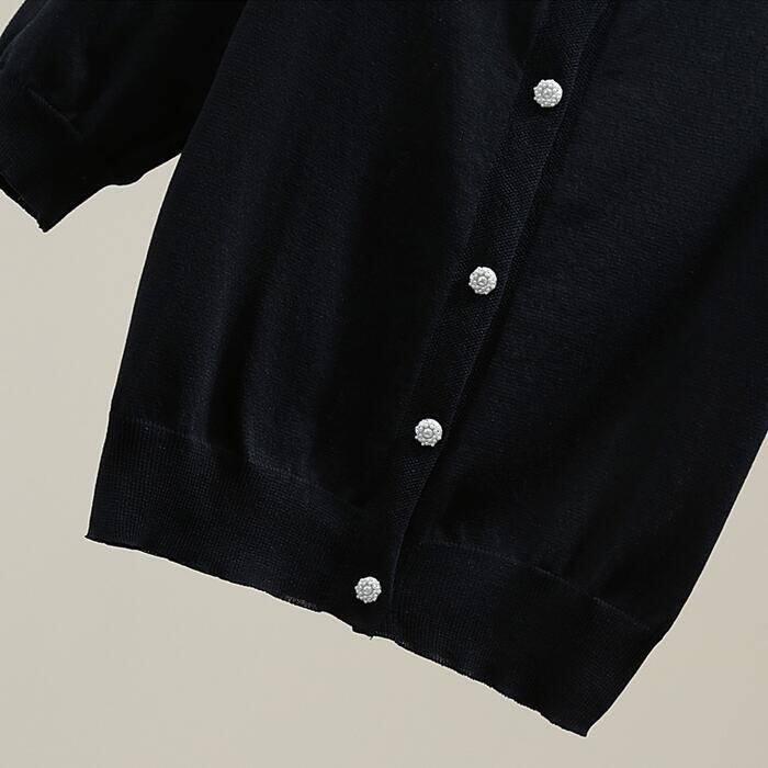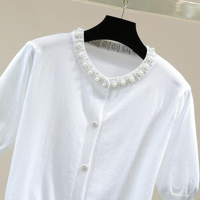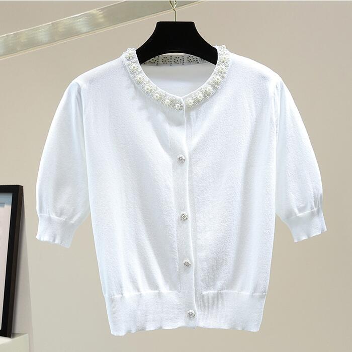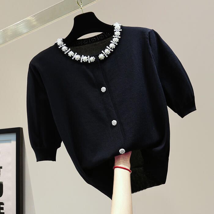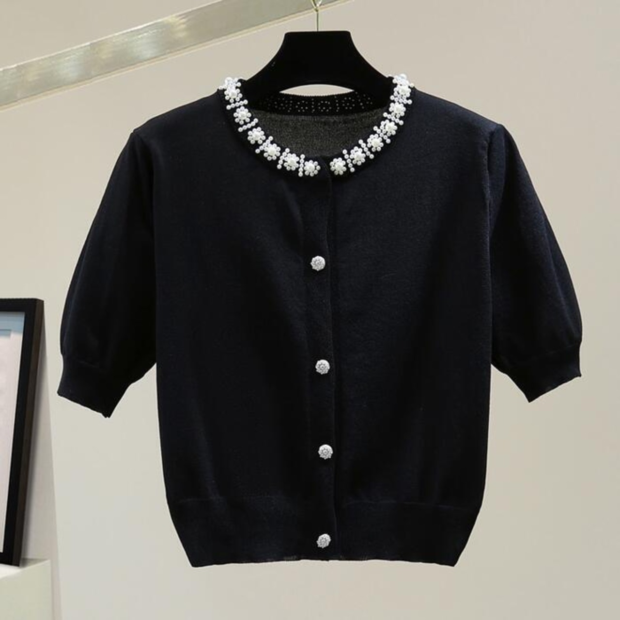 全2色 トップス カーディガン 羽織 アウター ニット ビジュー パール レディース 半袖 エレガント きれいめ カジュアル ミドル丈 おしゃれ 大人 可愛い フェミニン トップス ホワイト 白 ブラック 黒 春 夏 秋 20代 30代 40代 50代