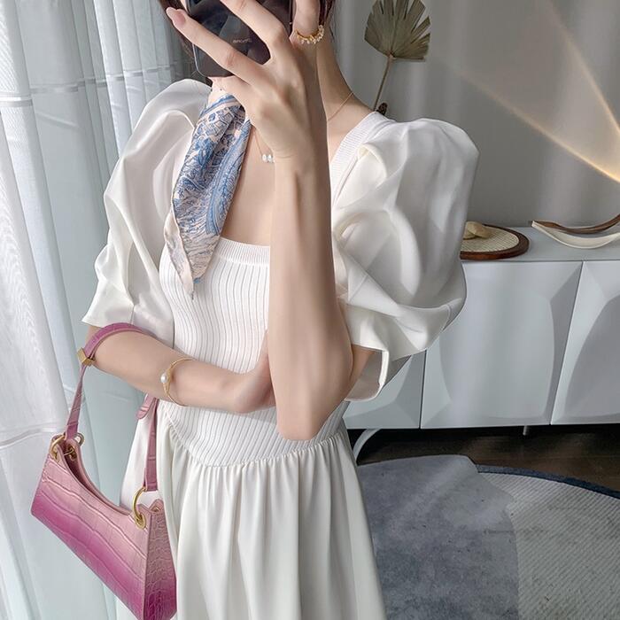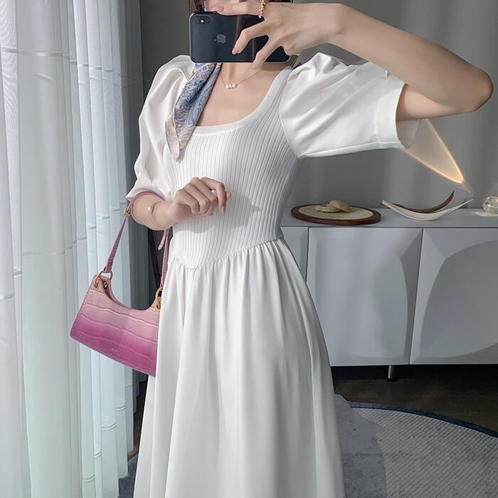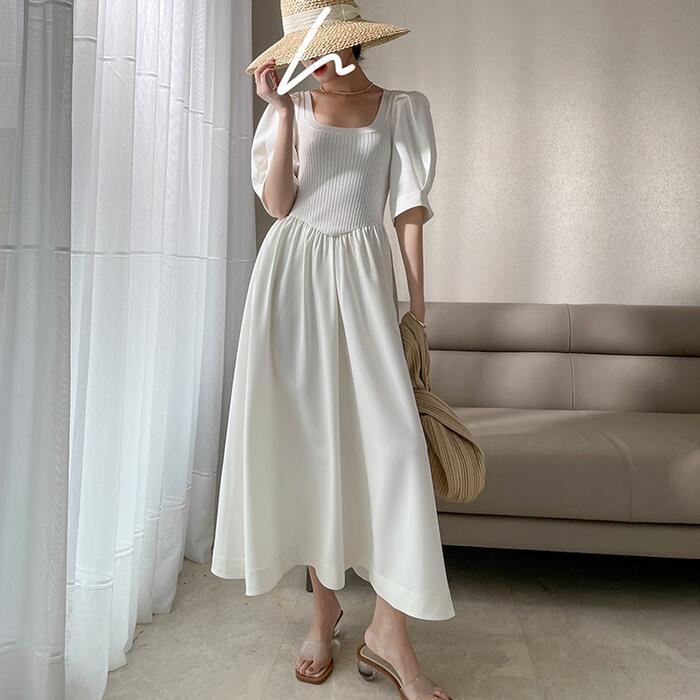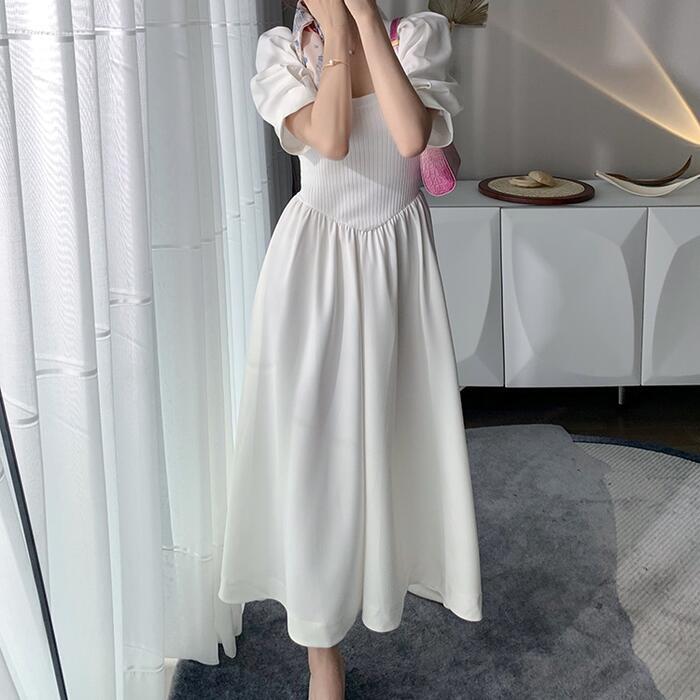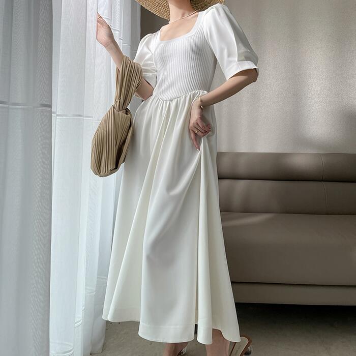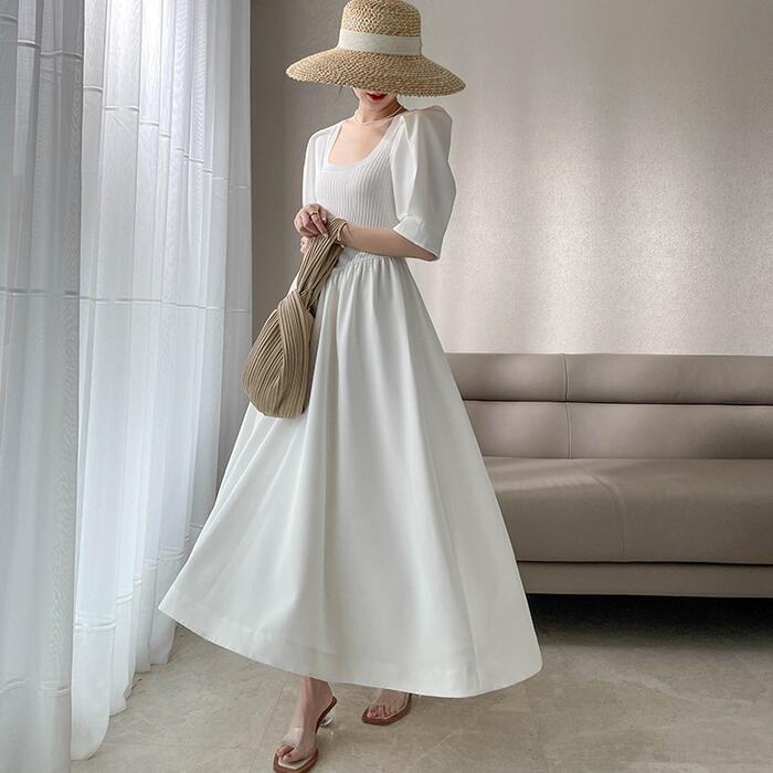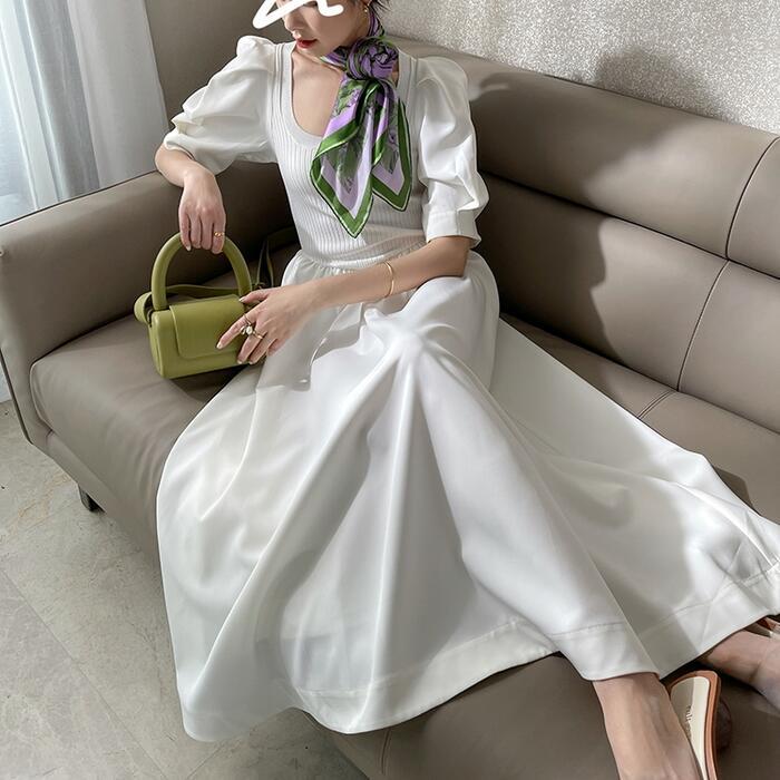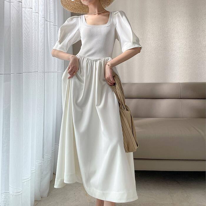 パフスリーブ ワンピース ロングワンピ ニット ドッキング 袖あり エレガント レディース 半袖 きれいめ カジュアル ロング丈 おしゃれ 大人 可愛い ワンピ ドレス Aライン 体型カバー お呼ばれ ホワイト 白 春 秋 夏 20代 30代 40代 50代