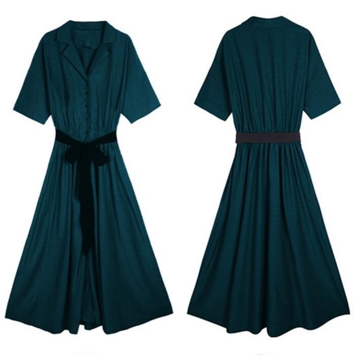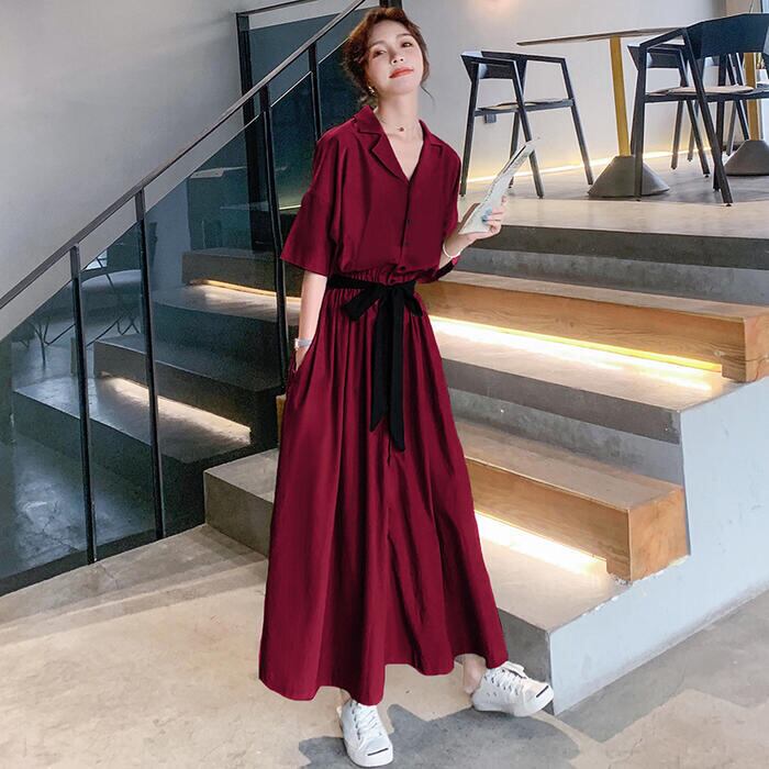 全2色 大きいサイズ ワンピース ロングワンピ シャツワンピ 袖あり エレガント レディース 半袖 きれいめ カジュアル ロング丈 おしゃれ 大人 可愛い ワンピ ドレス Aライン ウエストリボン 体型カバー レッド 赤 グリーン 緑 春 秋 夏 20代 30代 40代 50代