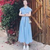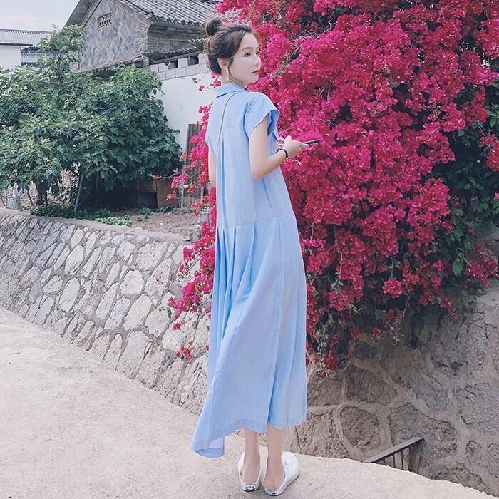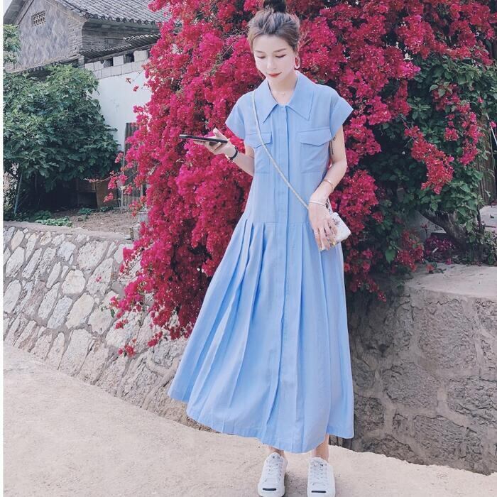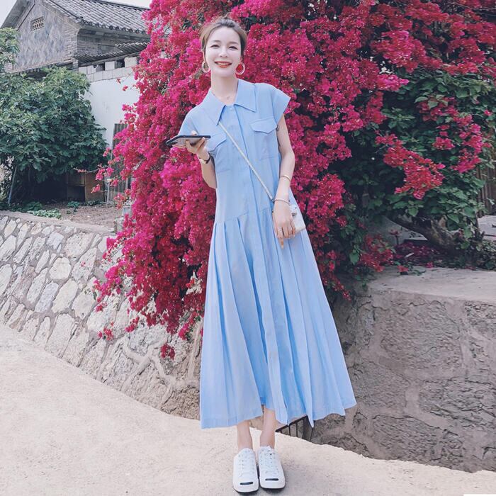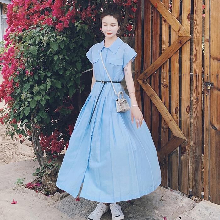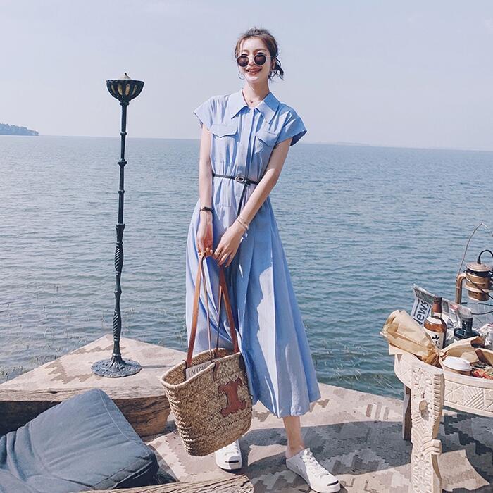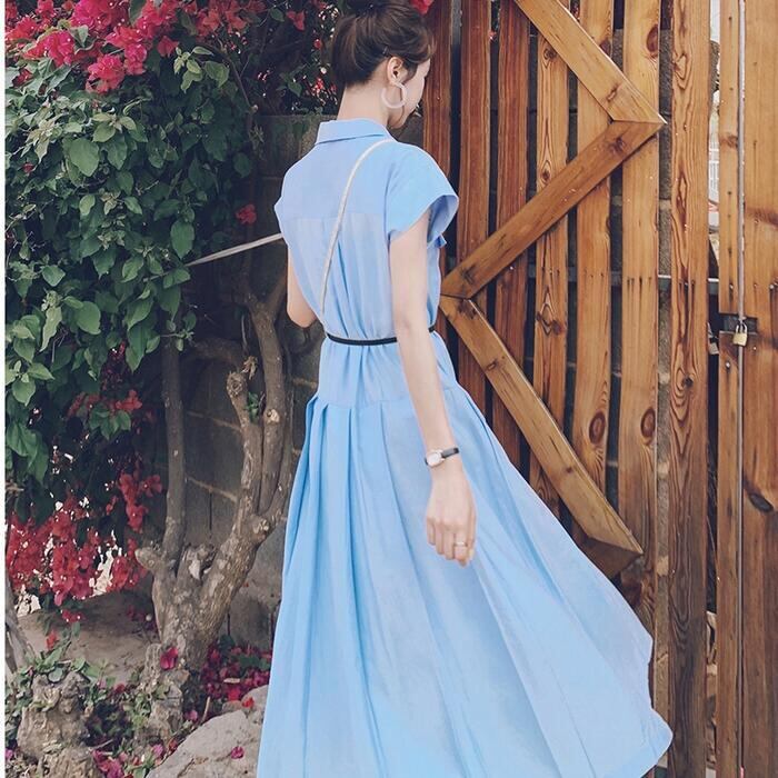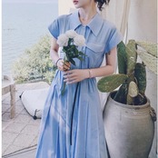 爽やかなブルーカラーのシャツワンピース。