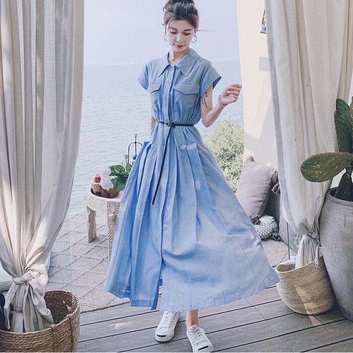 大きいサイズワンピース ロングワンピ シャツワンピ 袖あり プリーツ 切り替え レディース 半袖 きれいめ カジュアル ロング丈 おしゃれ 大人 可愛い ワンピ ドレス Aライン ウエストベルト 体型カバー ブルー 青 春 秋 夏 20代 30代 40代 50代