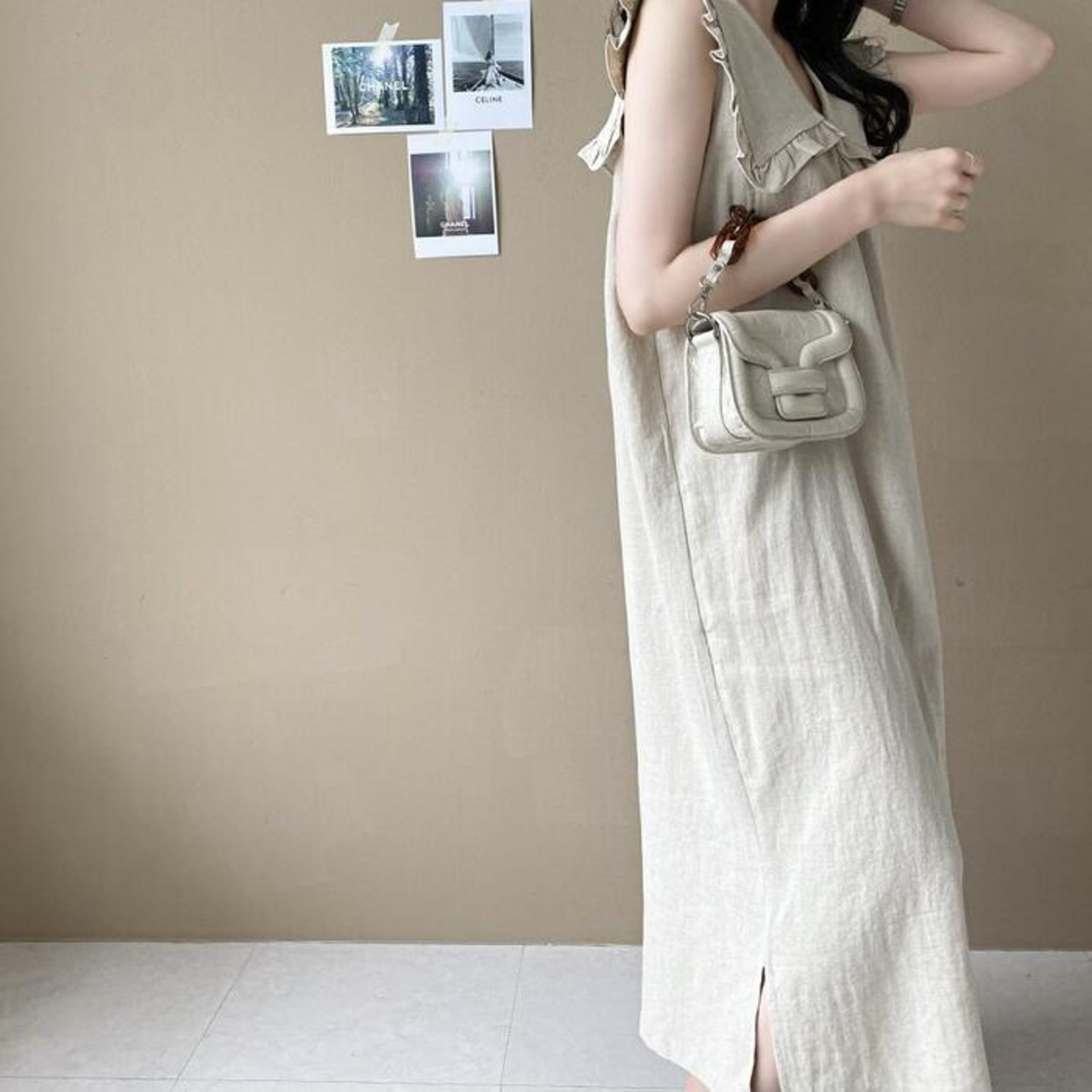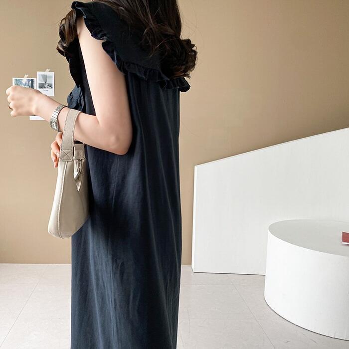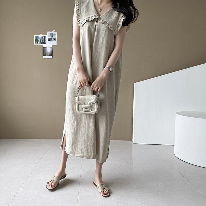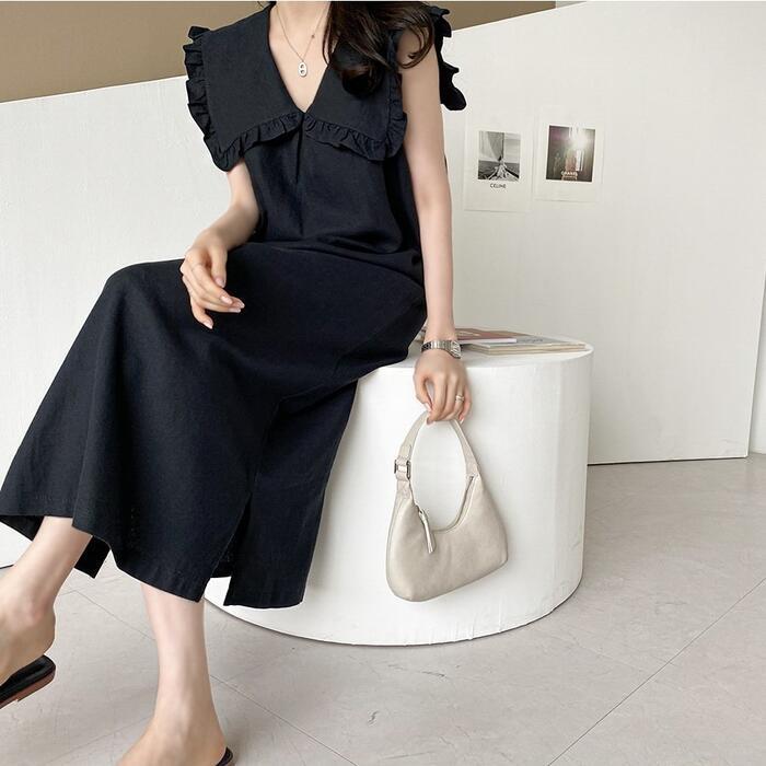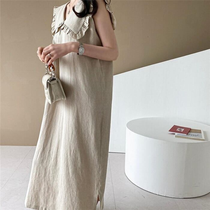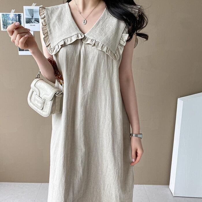 全2色 大きいサイズリネン リネン混 ビッグカラー ワンピース きれいめ カジュアル ノースリーブ ロング丈 綿麻 おしゃれ レディース 大人 可愛い ワンピ ドレス ナチュラル ゆったり 体型カバー ベージュ ネイビー 春 秋 夏 20代 30代 40代 50代