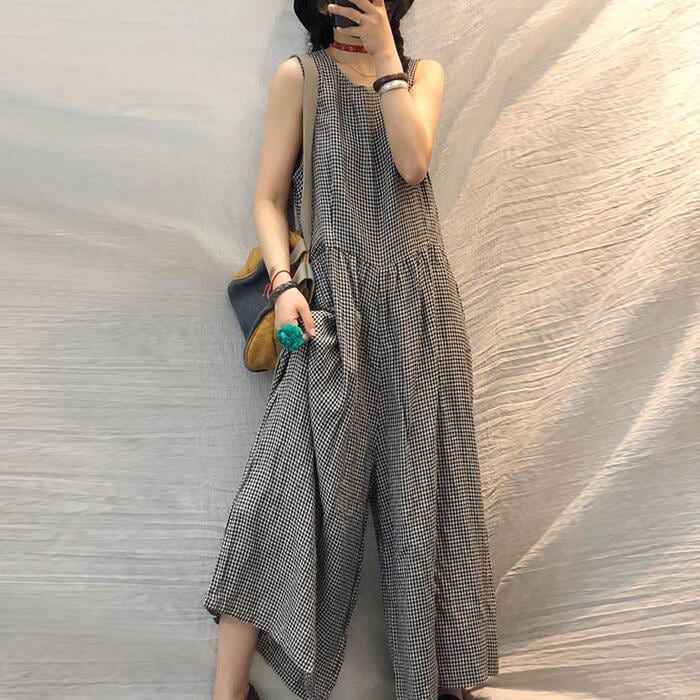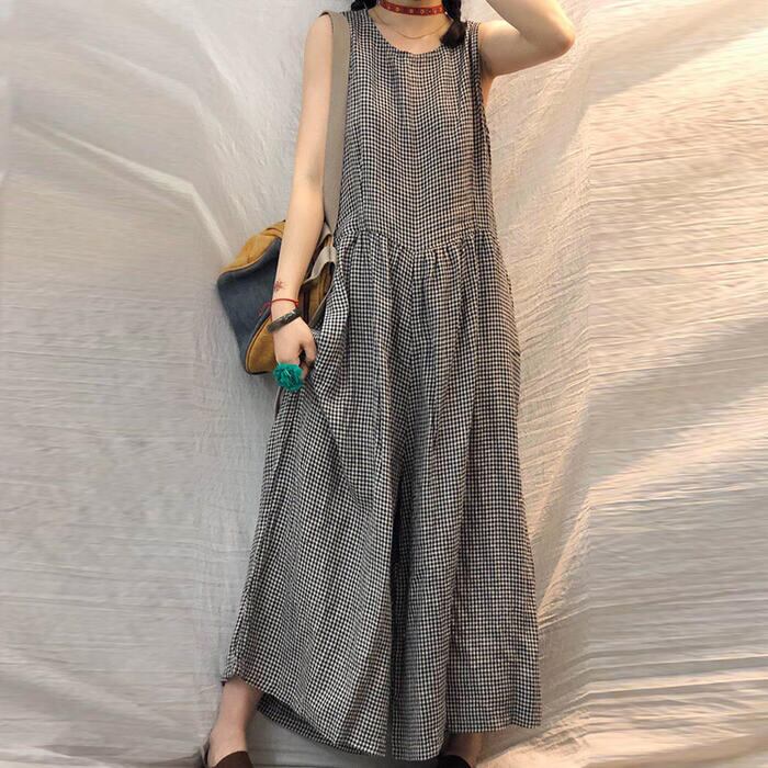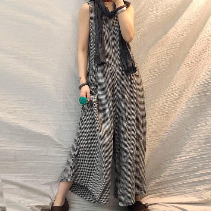 リネン リネン混 オールインワン サロペット ギンガムチェック きれいめ カジュアル ノースリーブ ロング丈 綿麻 おしゃれ レディース ワイドパンツ 大人 可愛い ナチュラル ゆったり 体型カバー グレー 春 秋 夏 20代 30代 40代 50代