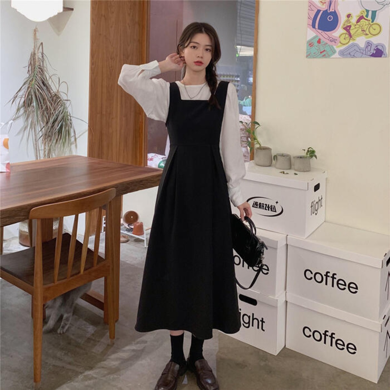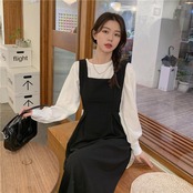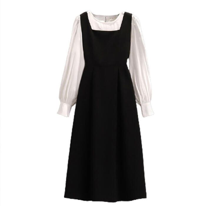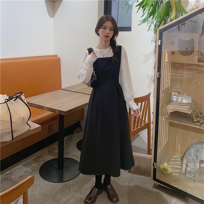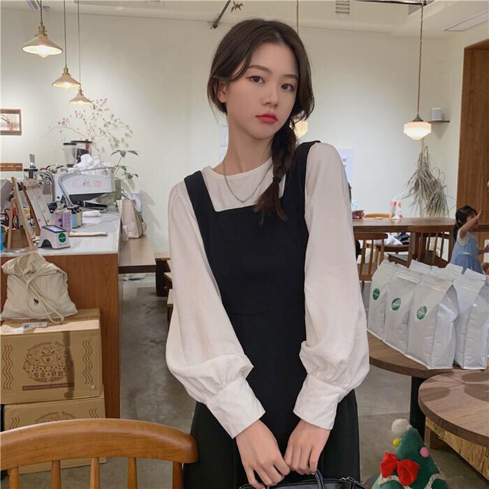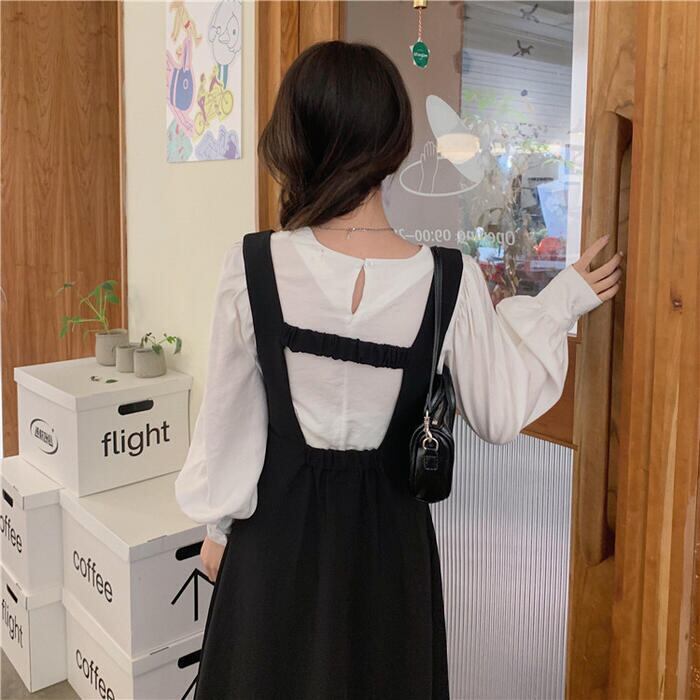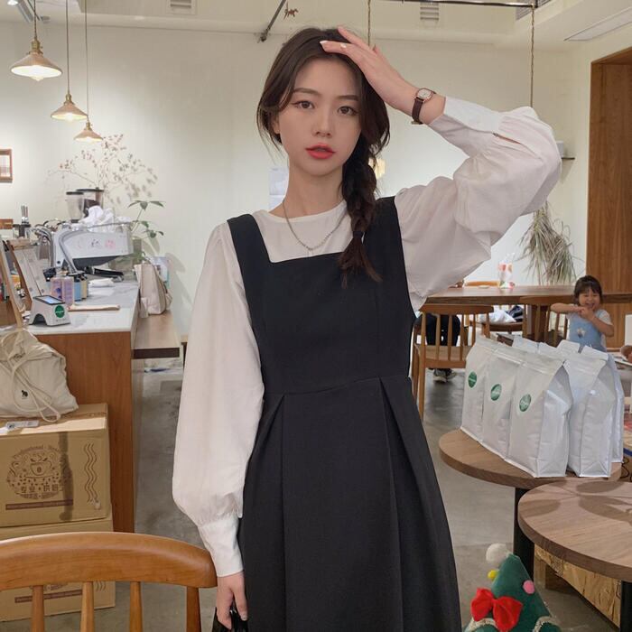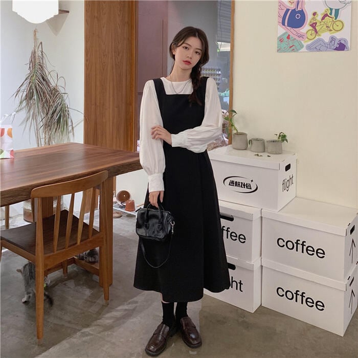 ジャンパースカートと長袖ブラウスのセットアップ。