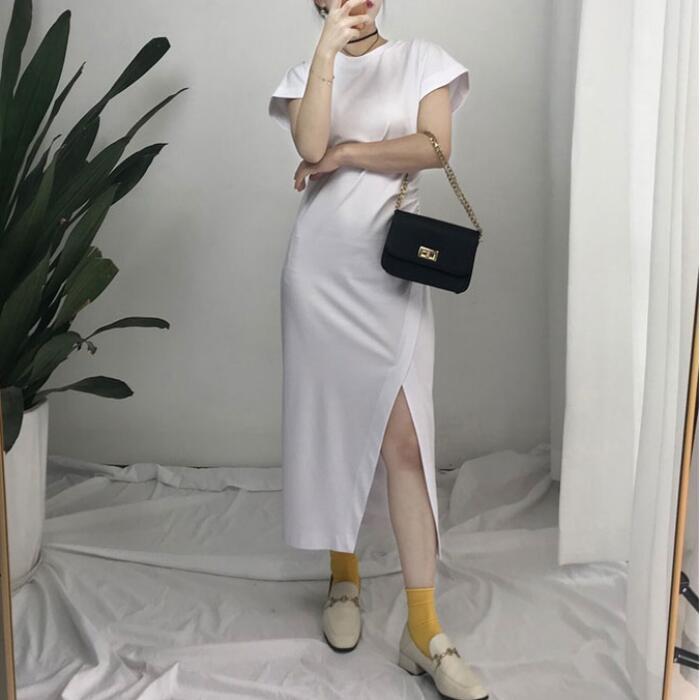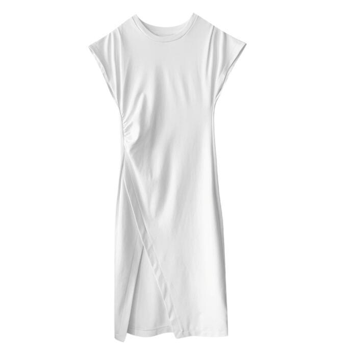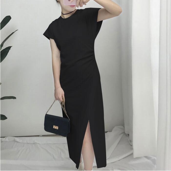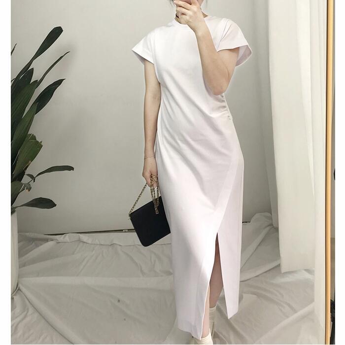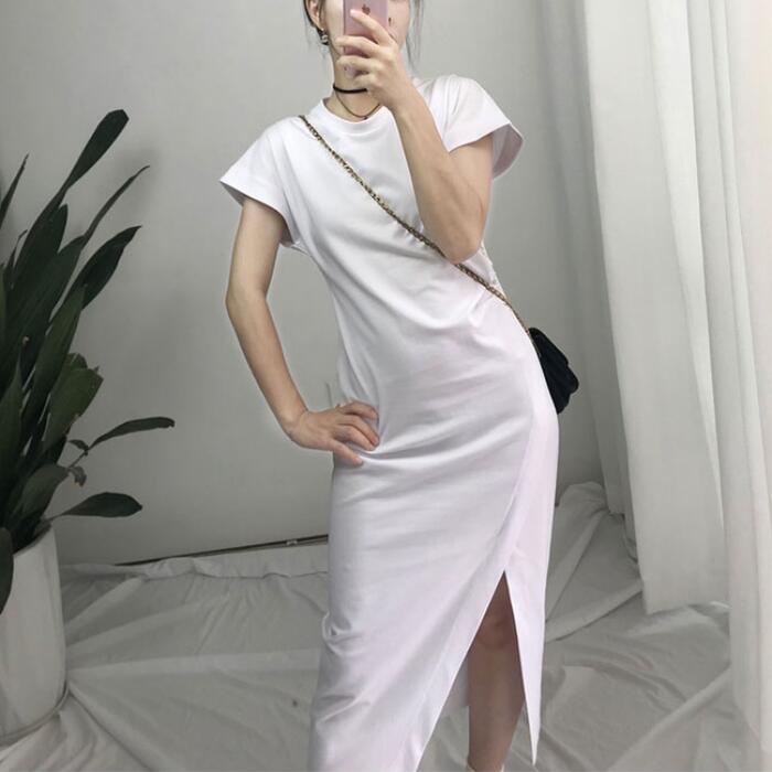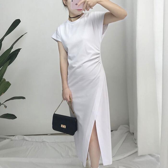 全2色 ワンピース ロングワンピ 袖あり Tシャツワンピ アシンメトリー レディース きれいめ カジュアル ミモレ丈 おしゃれ 大人 可愛い ワンピ ドレス スリット 半袖 フェミニン ホワイト 白 ブラック 黒 春 秋 夏 20代 30代 40代 50代