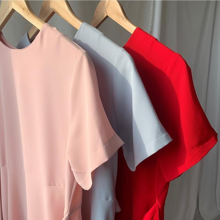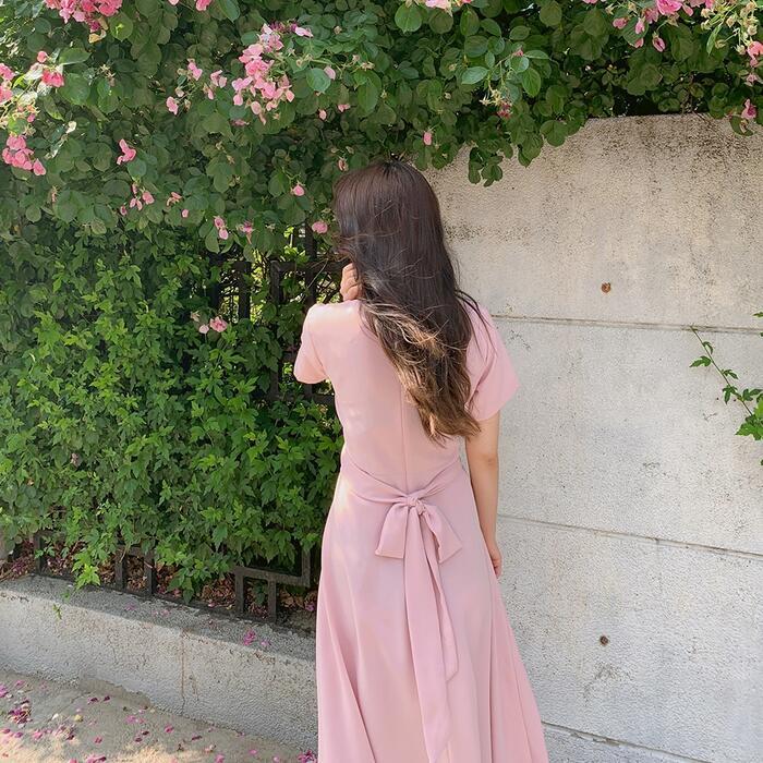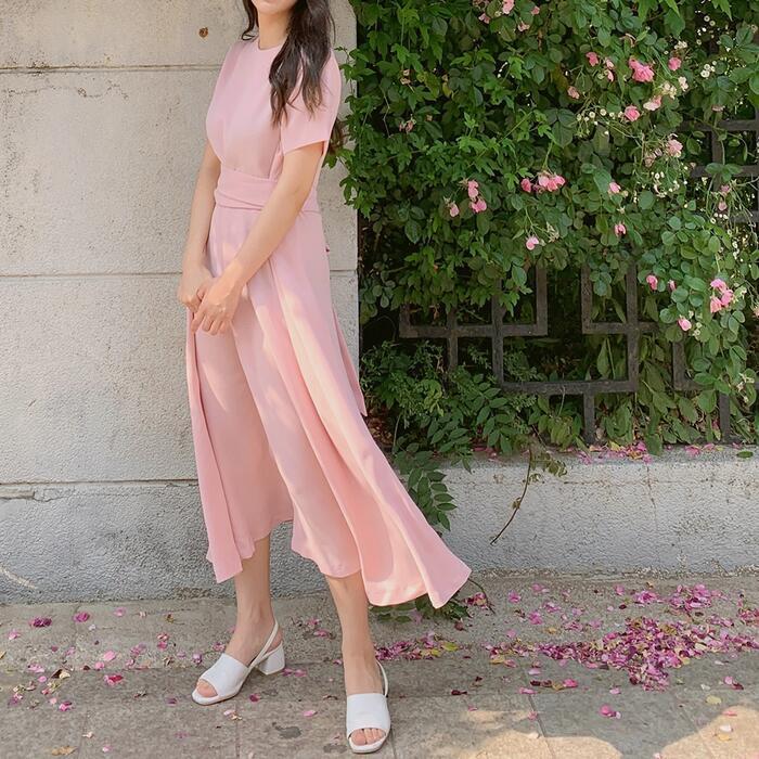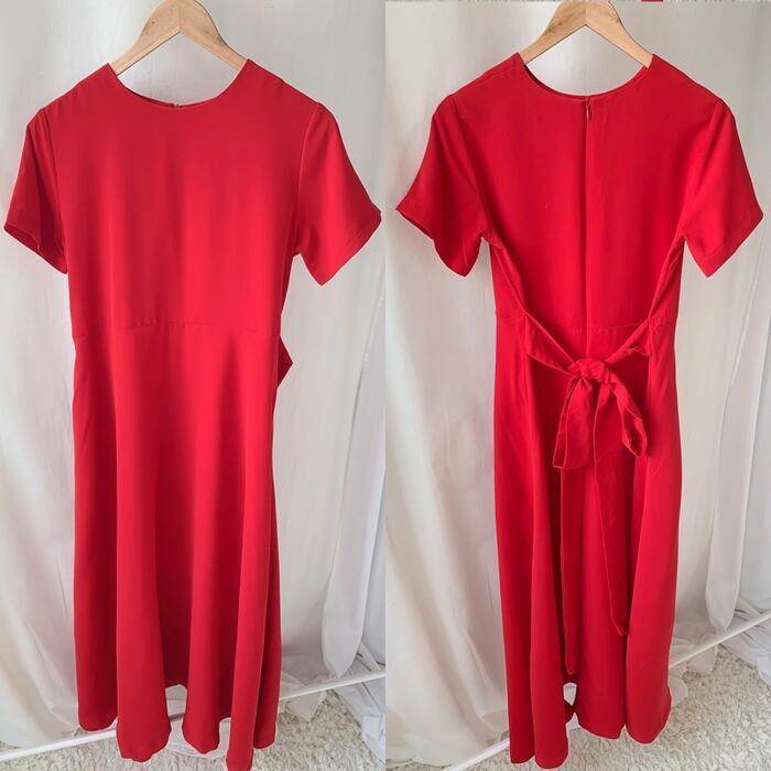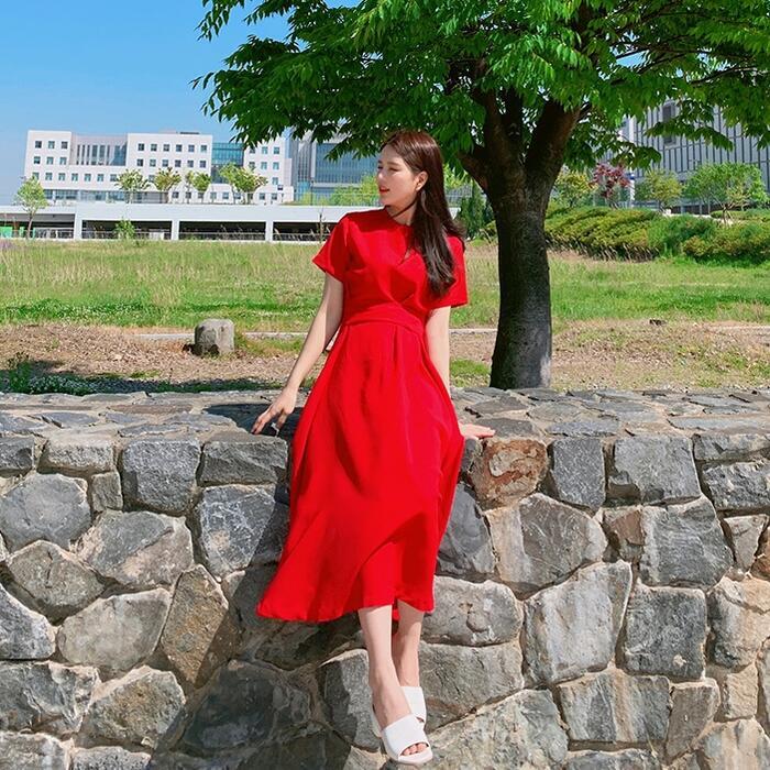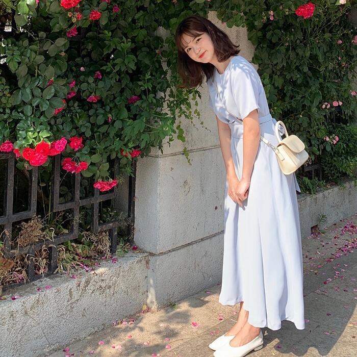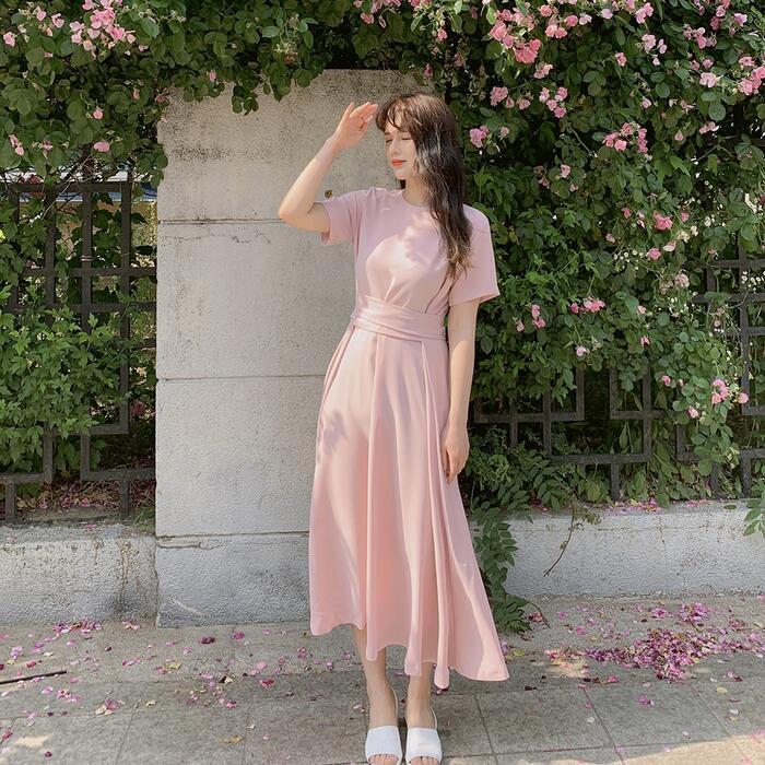 全3色 大きいサイズワンピース ロングワンピ 袖あり レディース エレガント きれいめ カジュアル ミモレ丈 おしゃれ 大人 可愛い ワンピ ドレス ウエストリボン ハイウエスト 半袖 フェミニン レッド 赤 ピンク ブルー 青 春 秋 夏 20代 30代 40代 50代