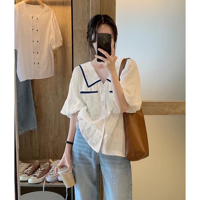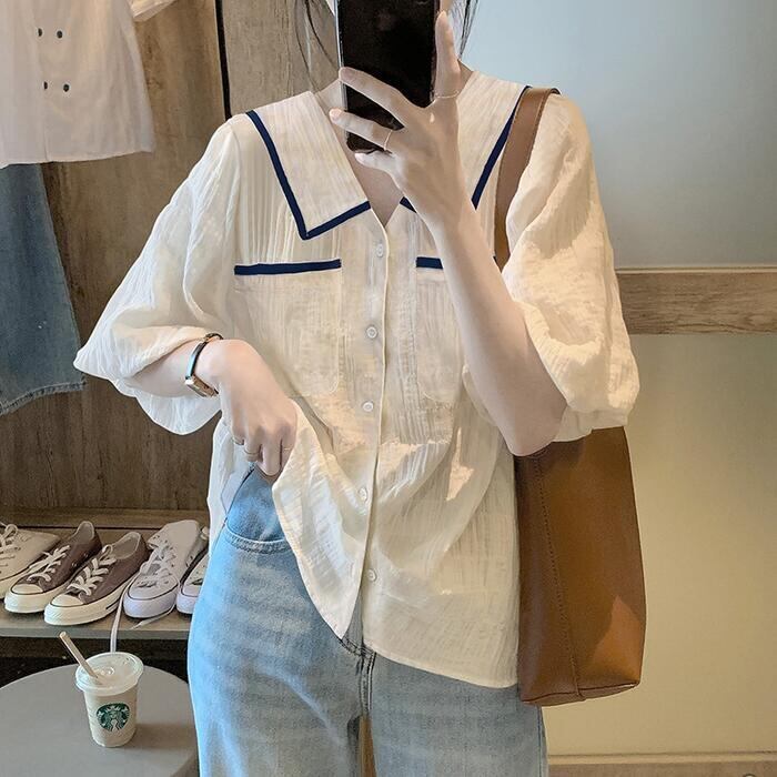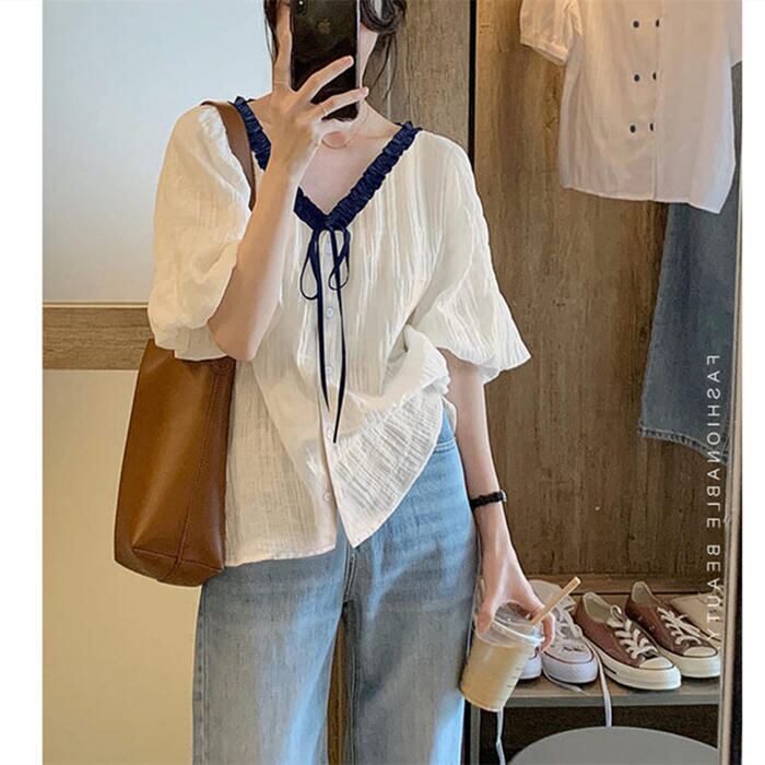 全2種 大きいサイズトップス ブラウス シャツ レディース 半袖 きれいめ カジュアル おしゃれ 大人 可愛い フェミニン Vネック リボン 体型カバー ゆったり ビッグカラー ナチュラル パイピング ホワイト 白 春 夏 秋 20代 30代 40代 50代