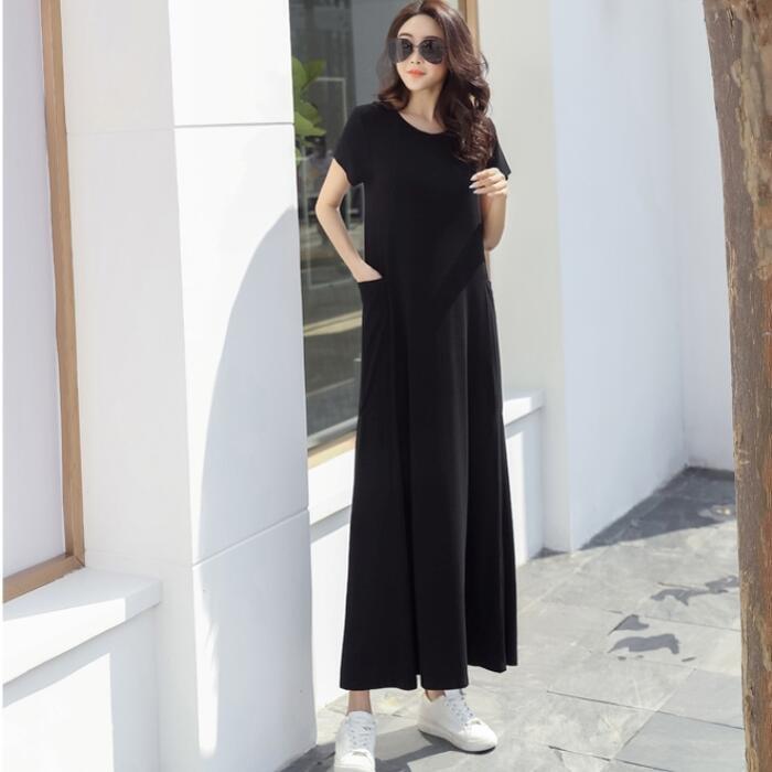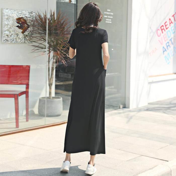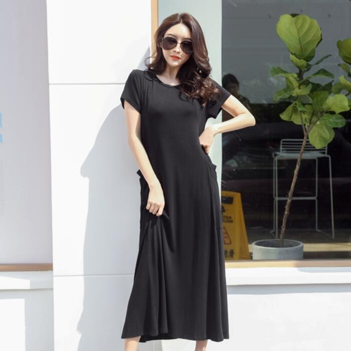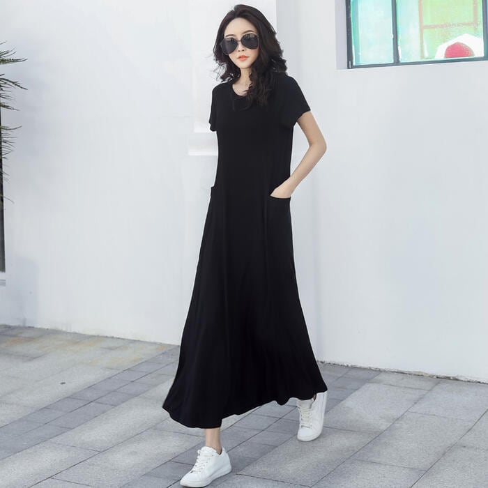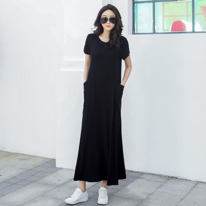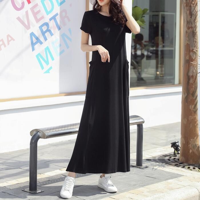 大きいサイズワンピース ロングワンピ 袖あり Tシャツワンピ レディース きれいめ カジュアル ロング丈 マキシ丈 おしゃれ 大人 可愛い ワンピ ドレス ポケット ゆったり 半袖 フェミニン 体型カバー シンプル ブラック 黒 春 秋 夏 20代 30代 40代 50代
