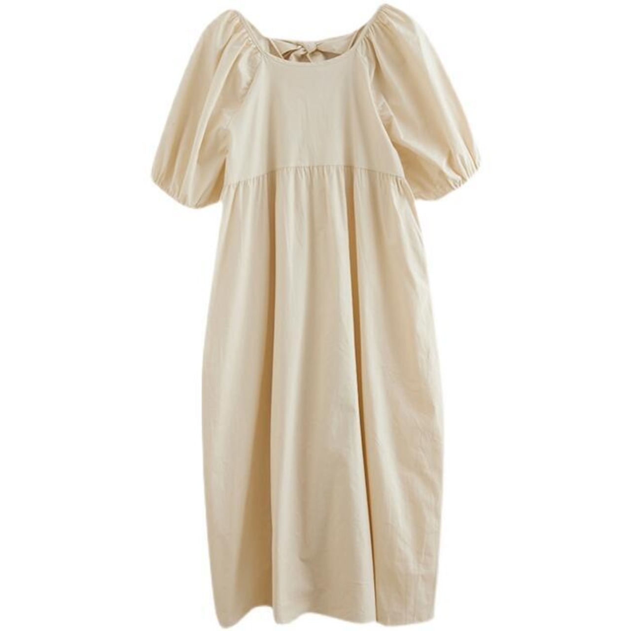 全2色 大きいサイズパフスリーブ ワンピース ロングワンピ 袖あり リボン レディース きれいめ カジュアル ミモレ丈 ロング丈 おしゃれ 大人 可愛い ワンピ ドレス ゆったり 半袖 フェミニン 体型カバー シンプル ベージュ パープル 春 秋 夏 20代 30代 40代 50代