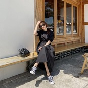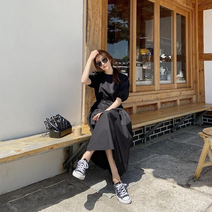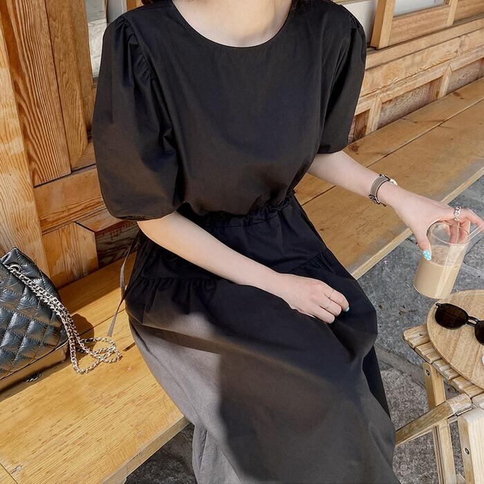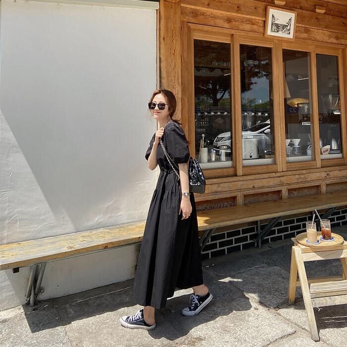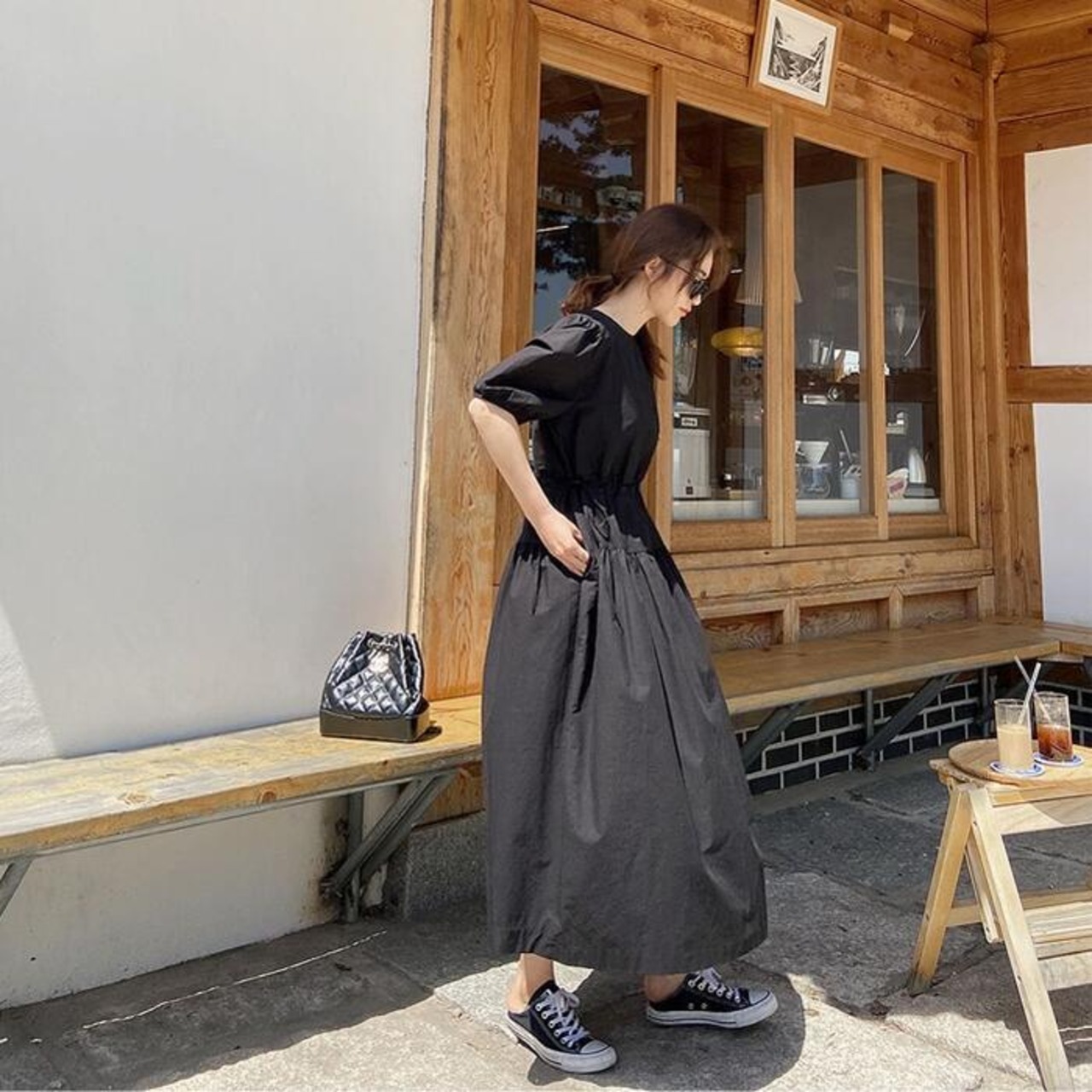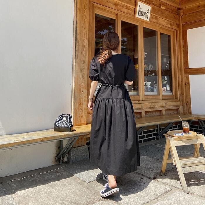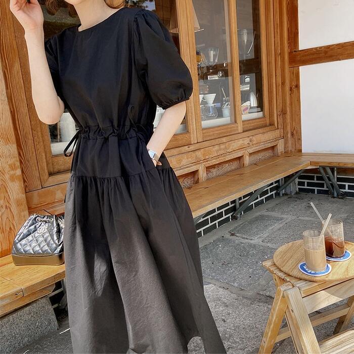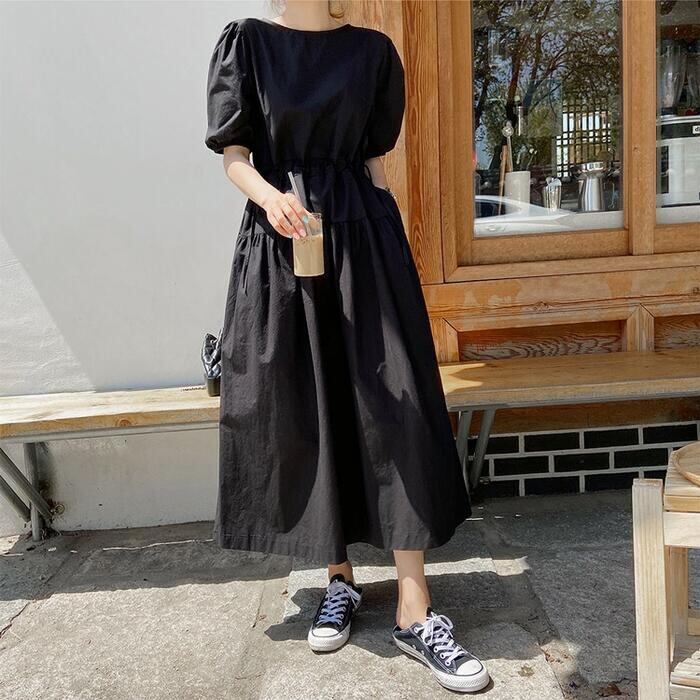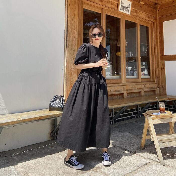 大きいサイズパフスリーブ ワンピース ロングワンピ 袖あり ドロスト レディース きれいめ カジュアル ロング丈 おしゃれ 大人 可愛い ワンピ ドレス ゆったり 半袖 フェミニン 体型カバー シンプル ブラック 黒 春 秋 夏 20代 30代 40代 50代
