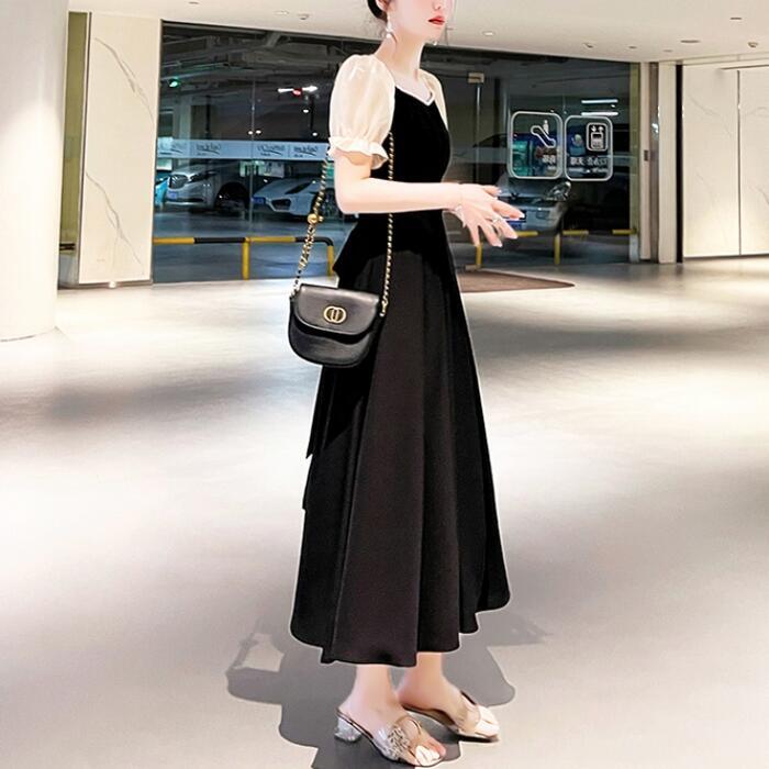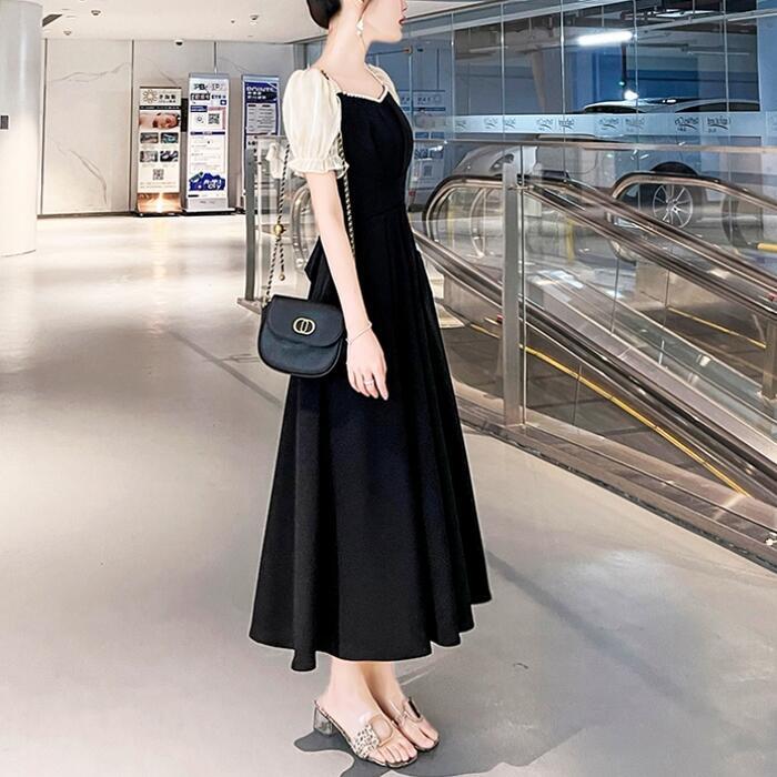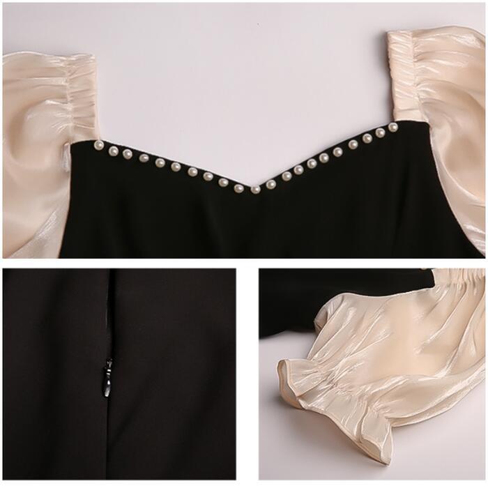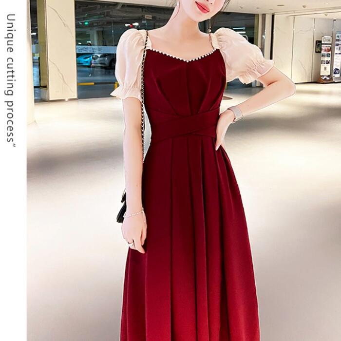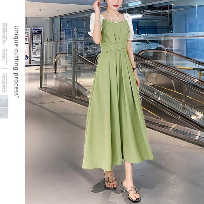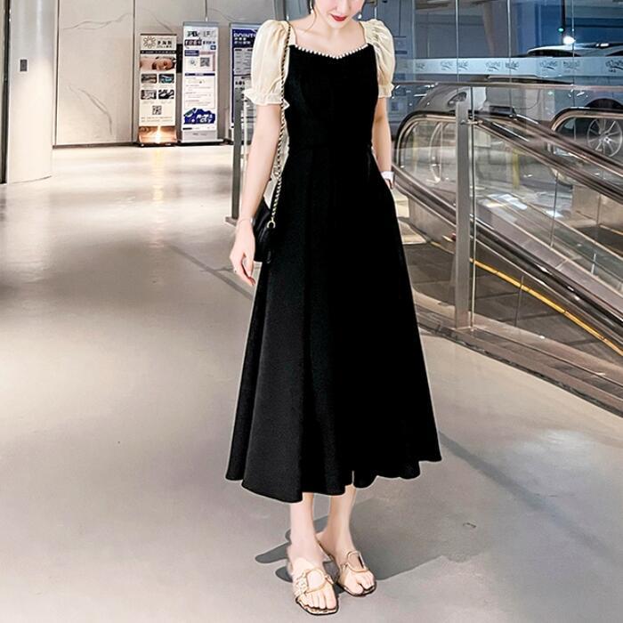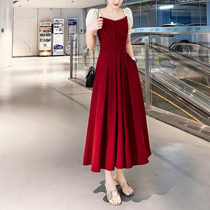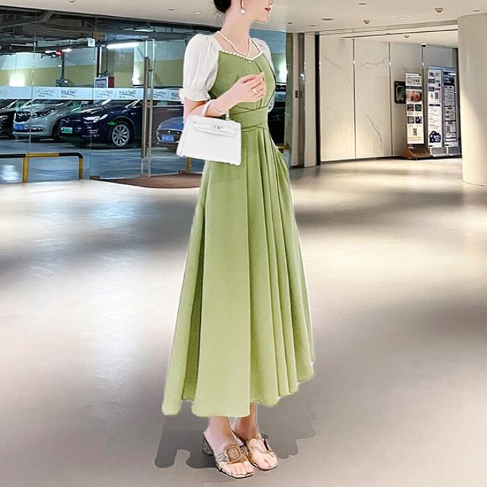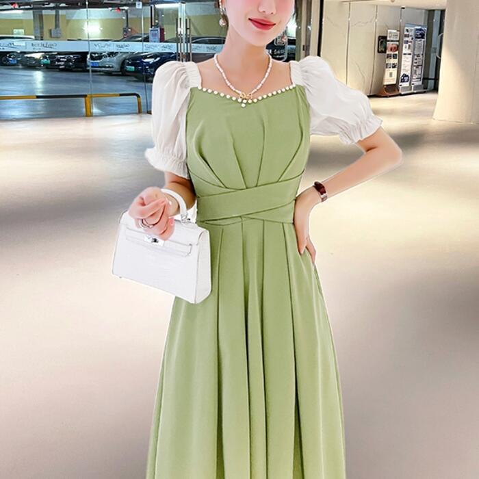 全2種3色 大きいサイズ結婚式 ワンピース 袖あり パフスリーブ ミモレ丈 ロング丈 エレガント きれいめ レディース ドレス 半袖 フォーマル セレモニー 発表会 パーティー パール 可愛い ハイウエスト グリーン 緑 レッド 赤 ブラック 黒 春 秋 夏 20代 30代 40代 50代
